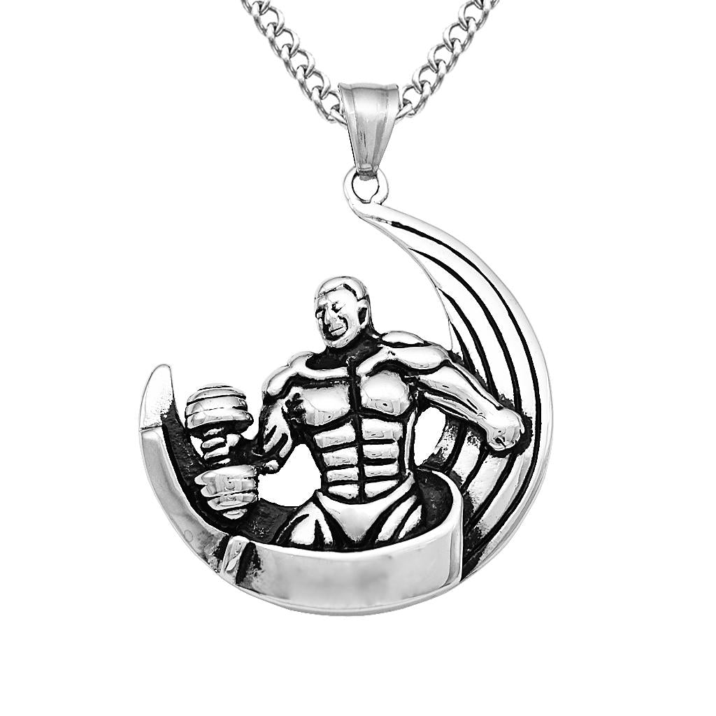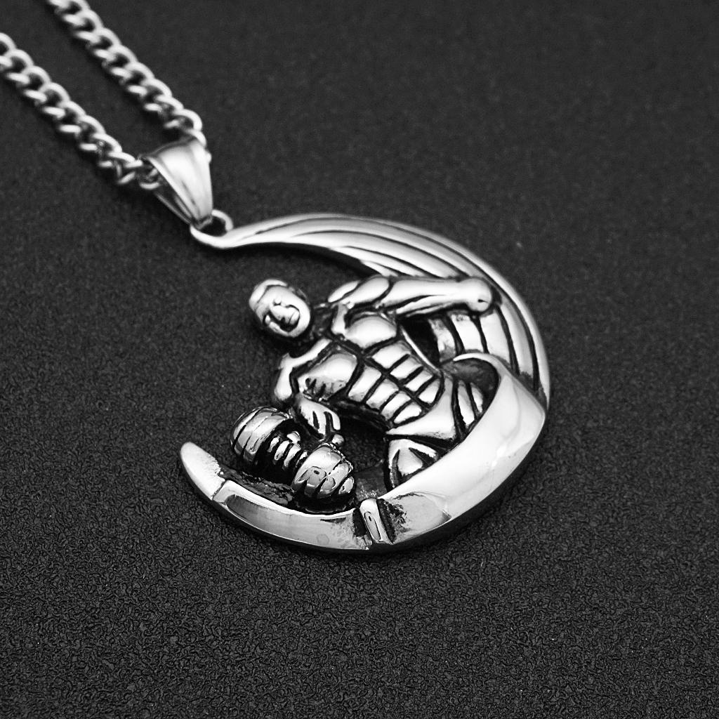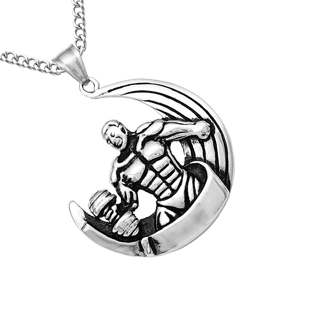 Sport fitness dumbbells moon with muscle men pendant chain necklace, high polish smooth inner face, comfortable wearing.
