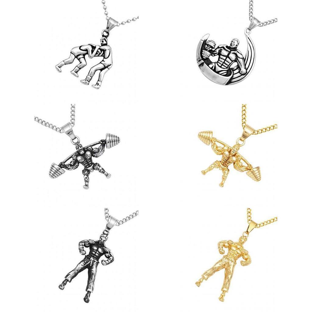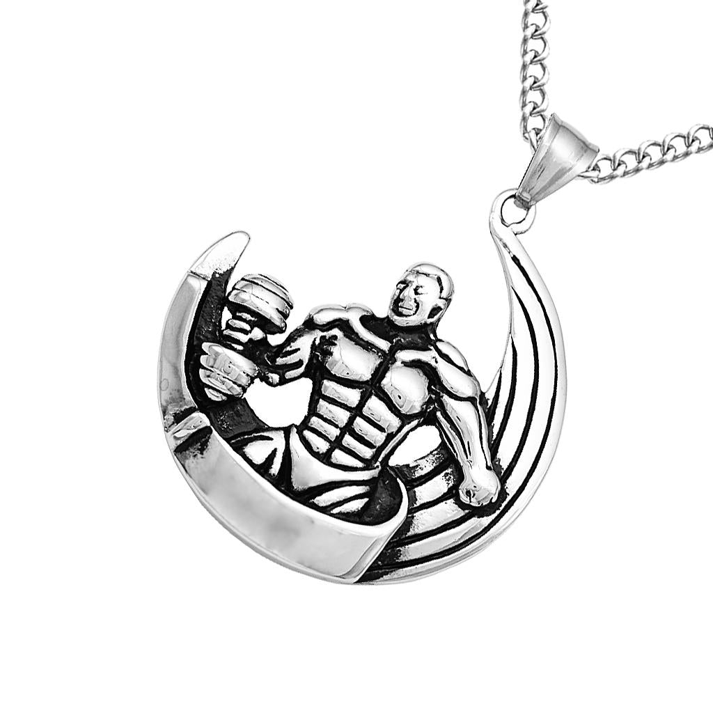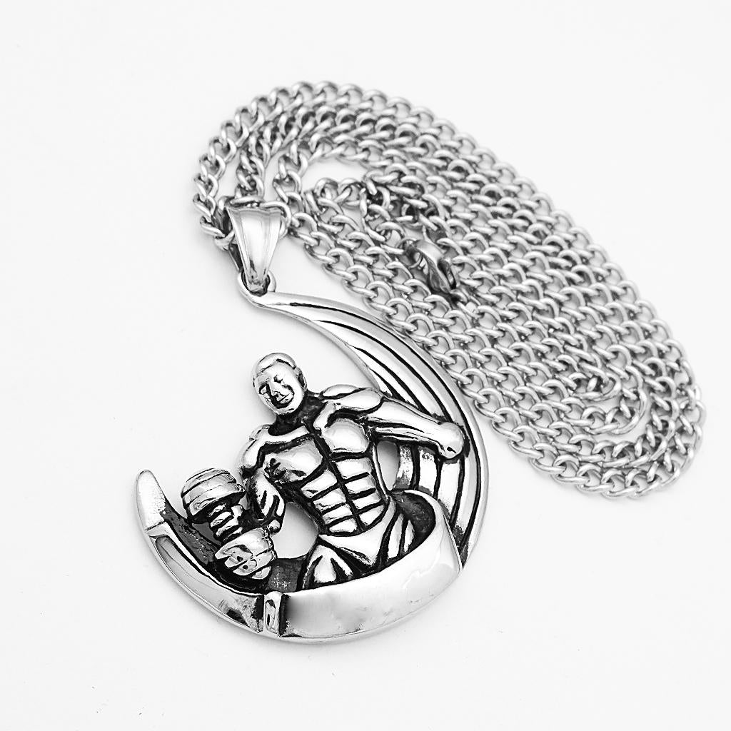 Sport fitness dumbbells moon with muscle men pendant chain necklace, high polish smooth inner face, comfortable wearing.