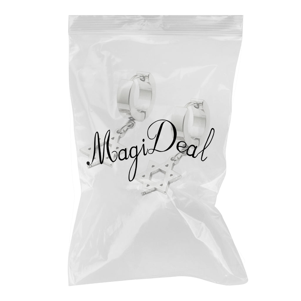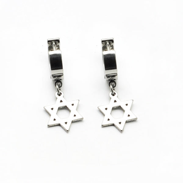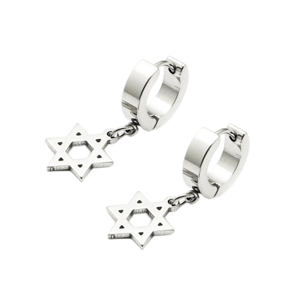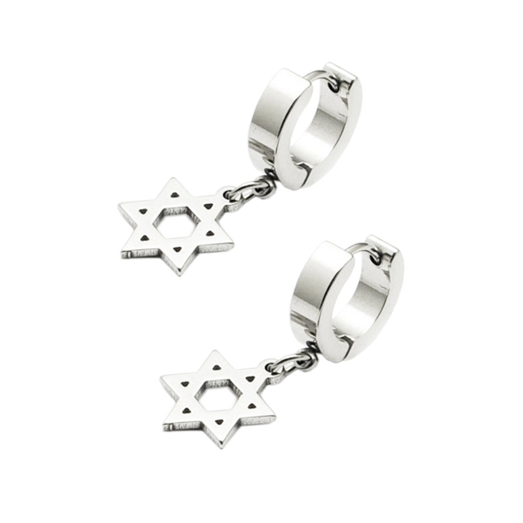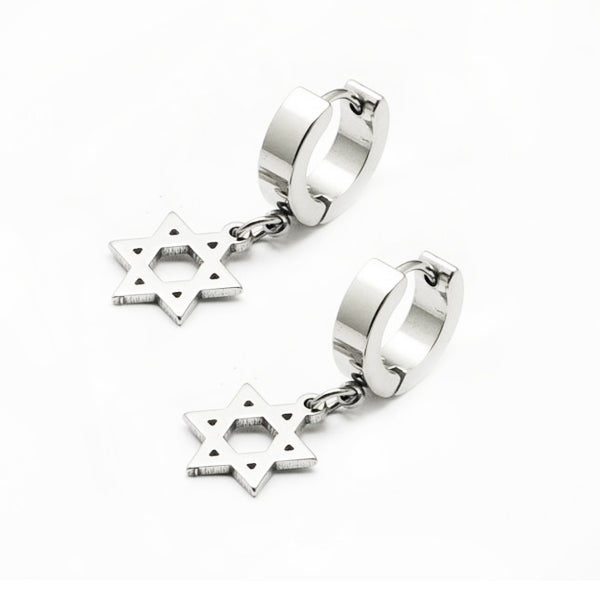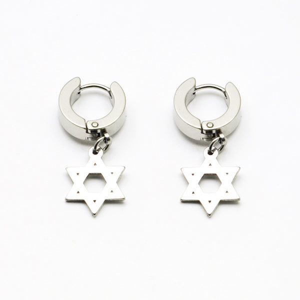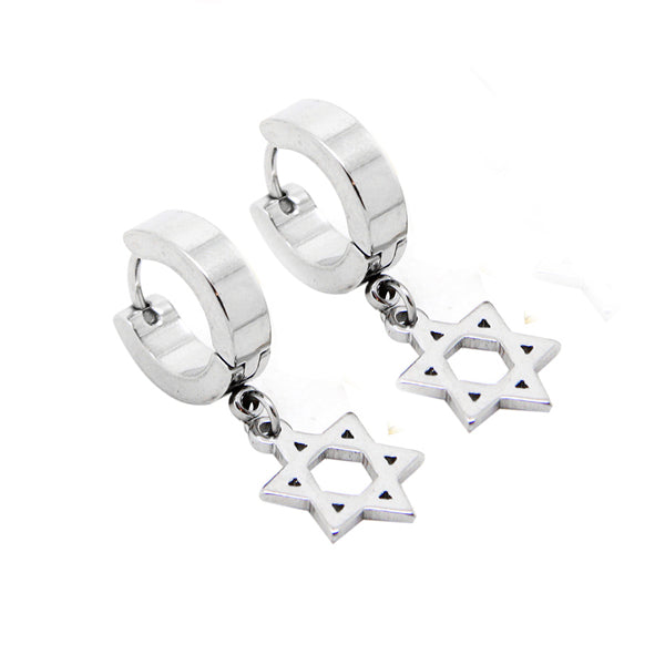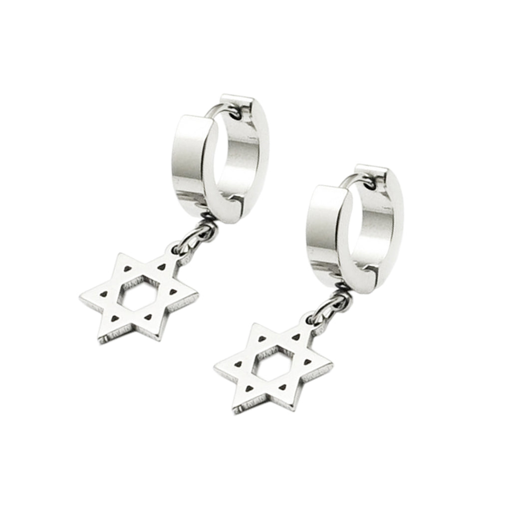 Stylish Silver Stainless Steel Hoop Huggie Earrings w/ Hexagon Dangle Drop