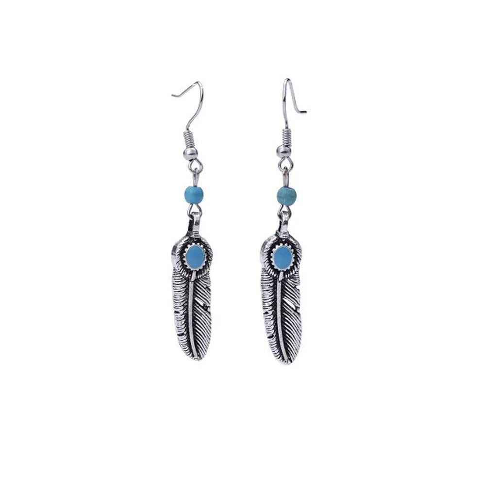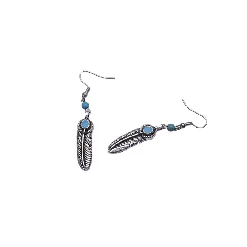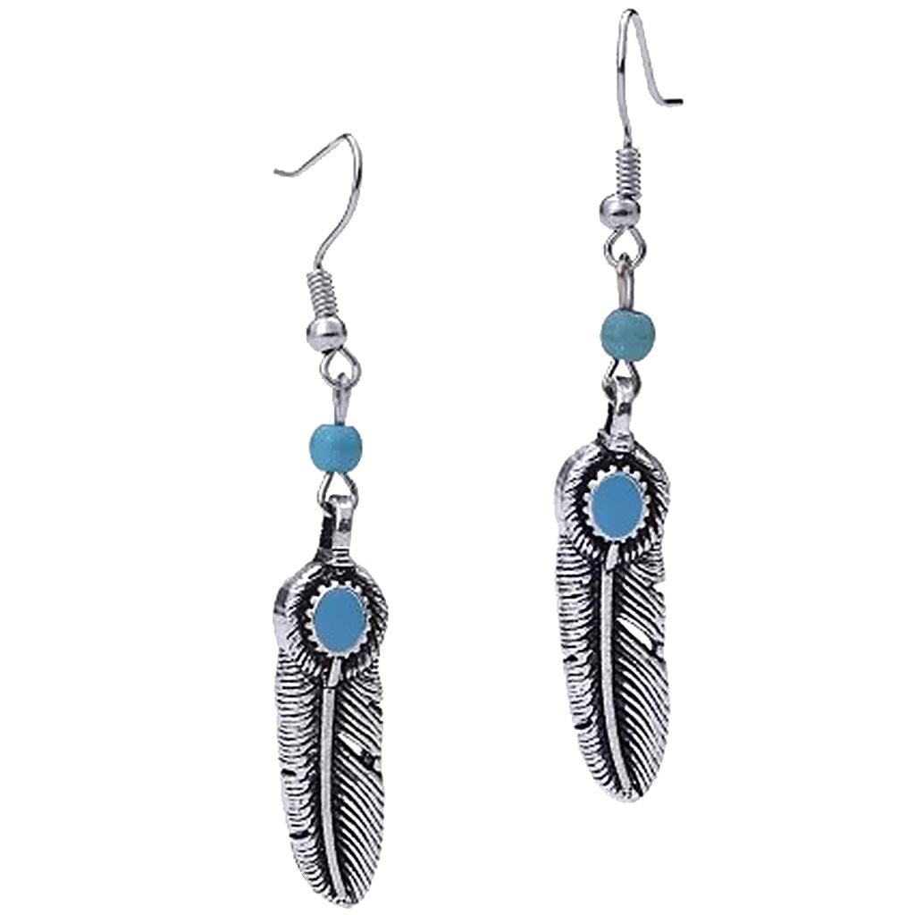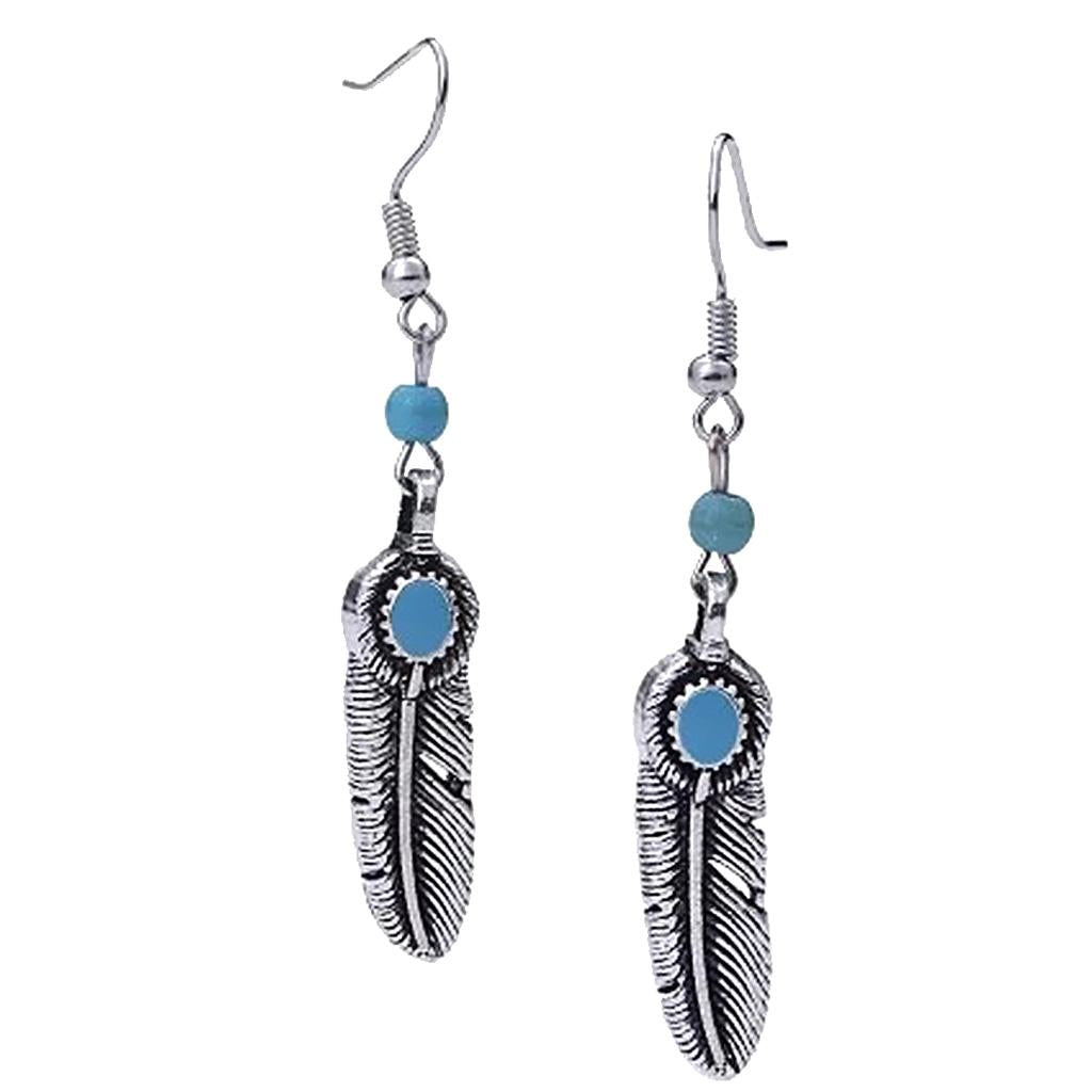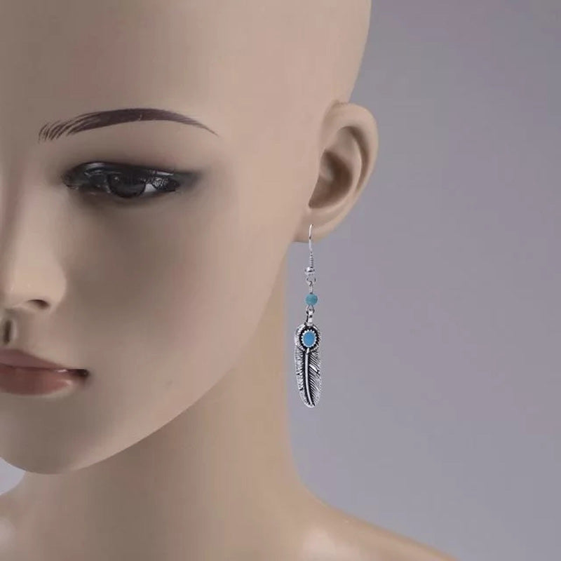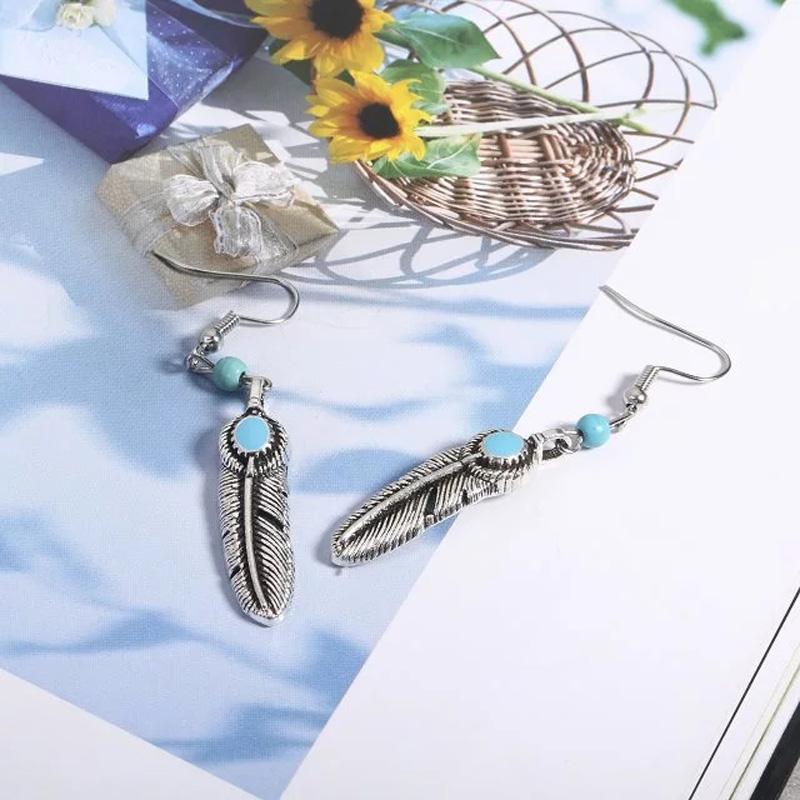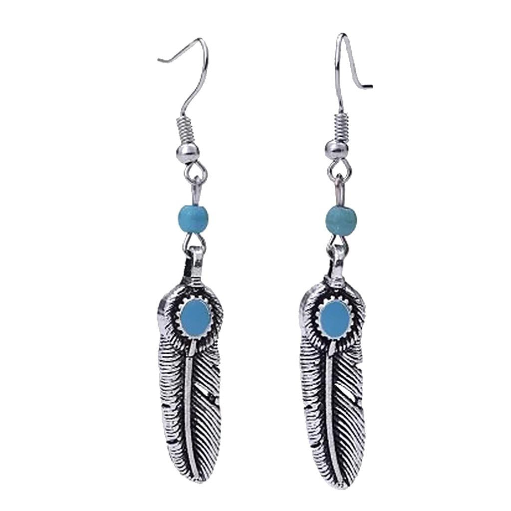 Vintage Bohemian Feather Shape Pendant Turquoise Beads Drop Dangle Earrings