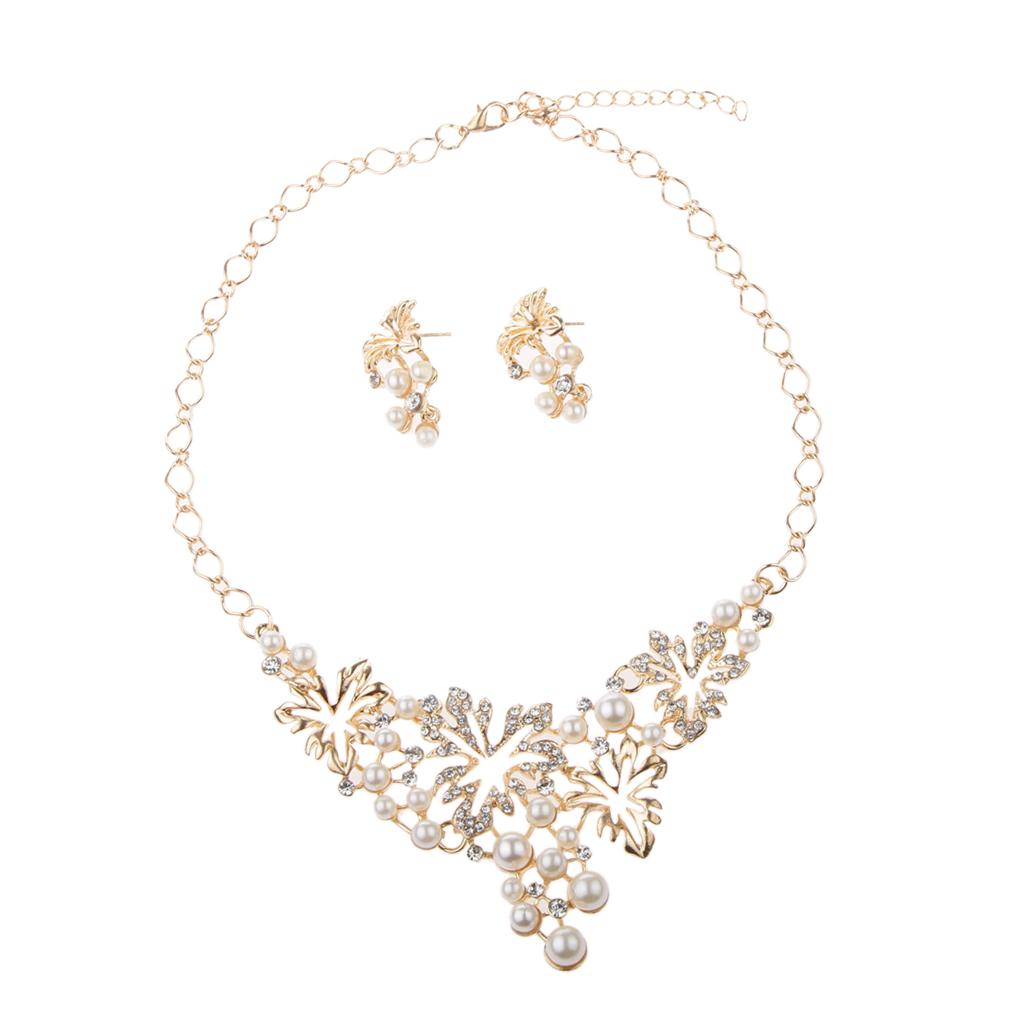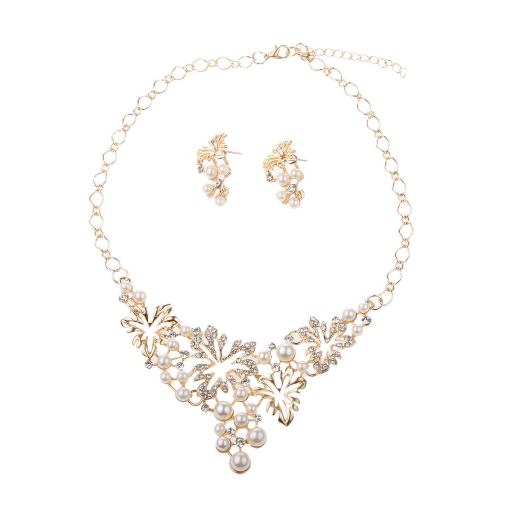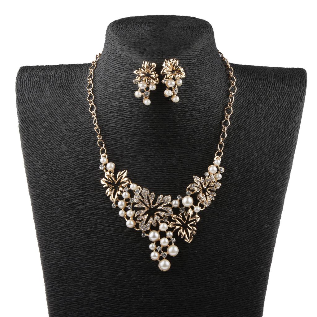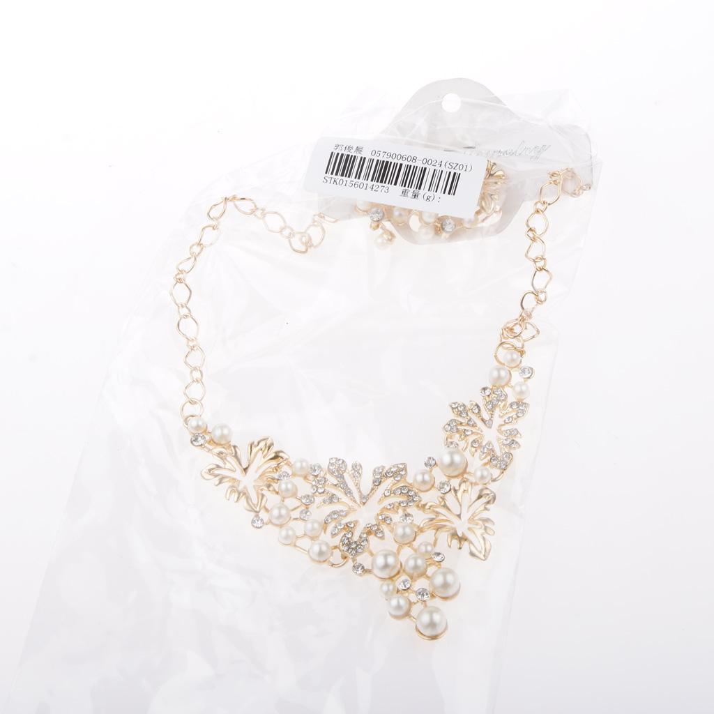 Women Pearl Rhinestone Choker Bib Statement Chunky Necklace Earrings Gold