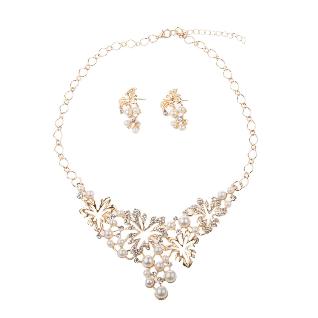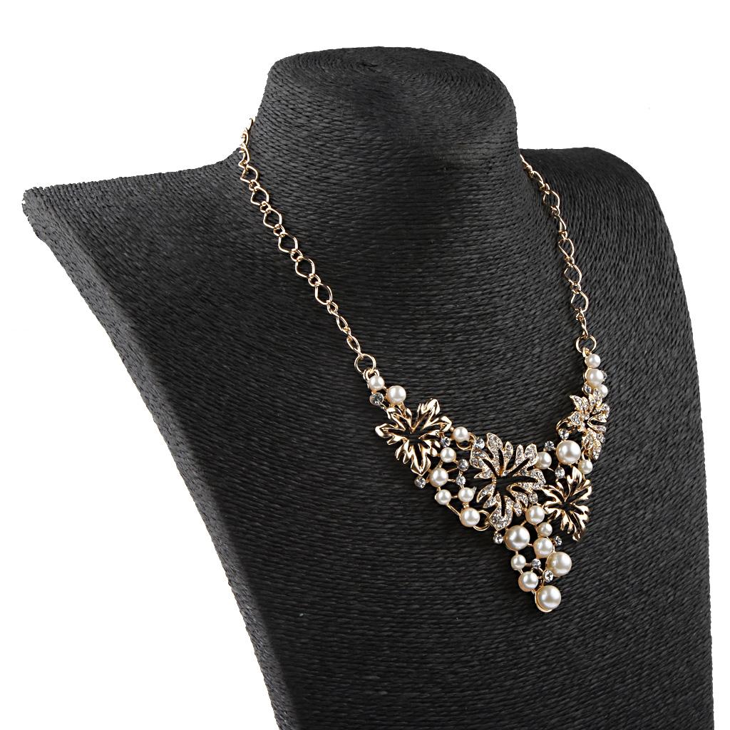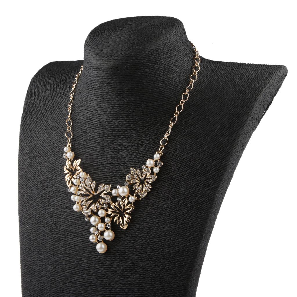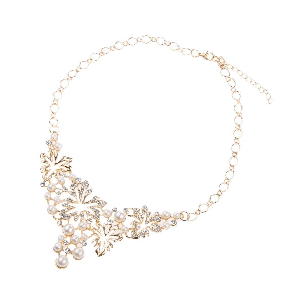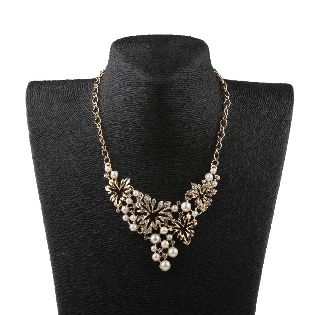 Women Pearl Rhinestone Choker Bib Statement Chunky Necklace Earrings Gold