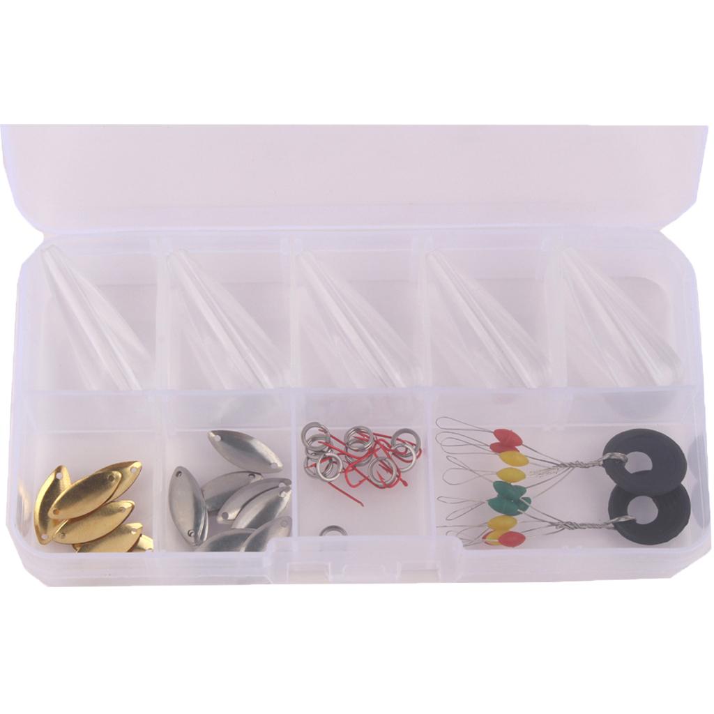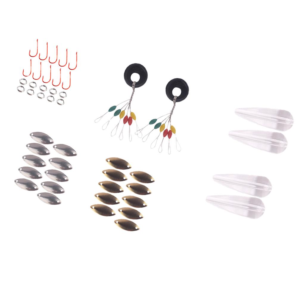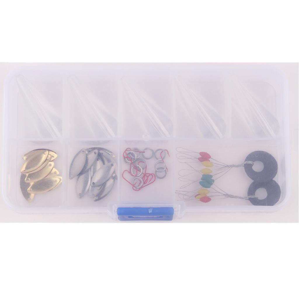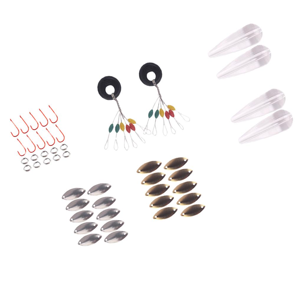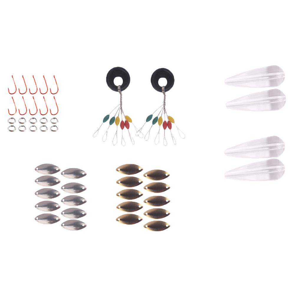 Package including: 10pcs golden spoon lures, 10pcs silver spoon lures, 2pcs sbirolino floats, 10pcs hooks, 10pcs split rings, 5pcs float stoppers, 1pcs box.