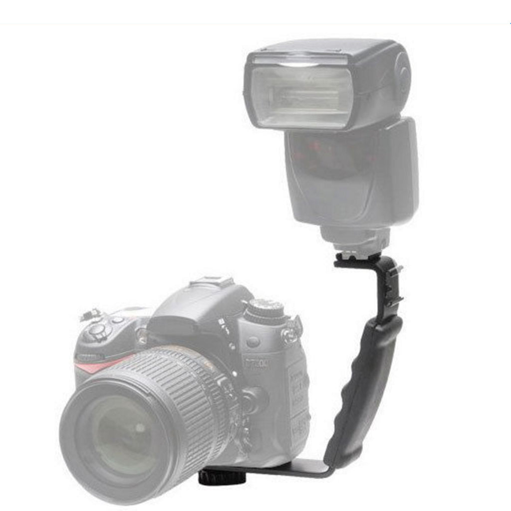 Camera Flash bracket which keeps the flash above the camera to push the shadows behind the subject, providing enhanced lighting and illuminating red eye.