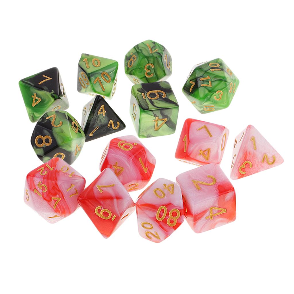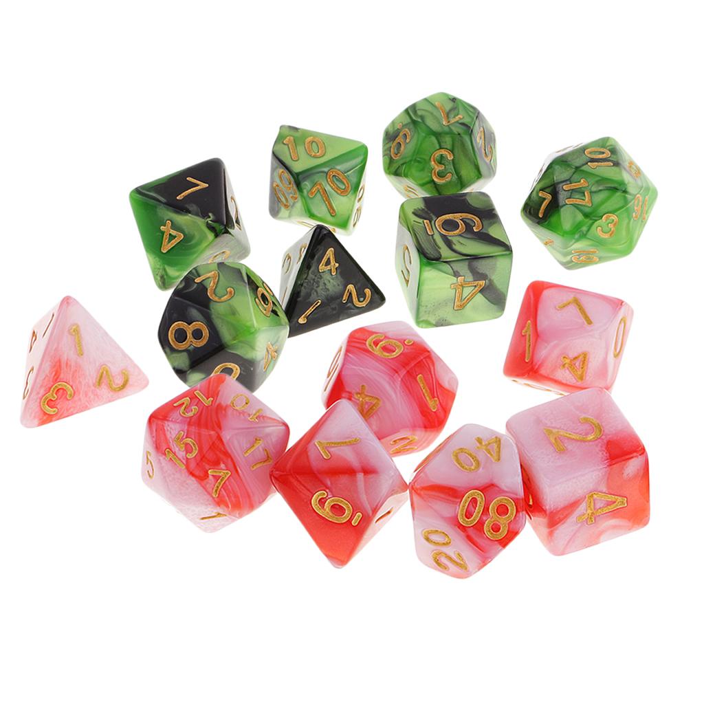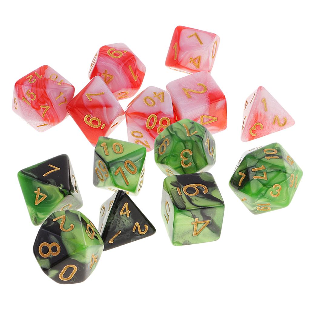 The 14 pieces Dices set contains one D4, D6, D8, 2pcs D10, D12, D20