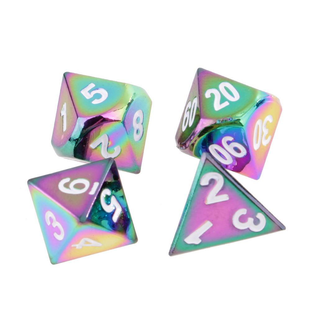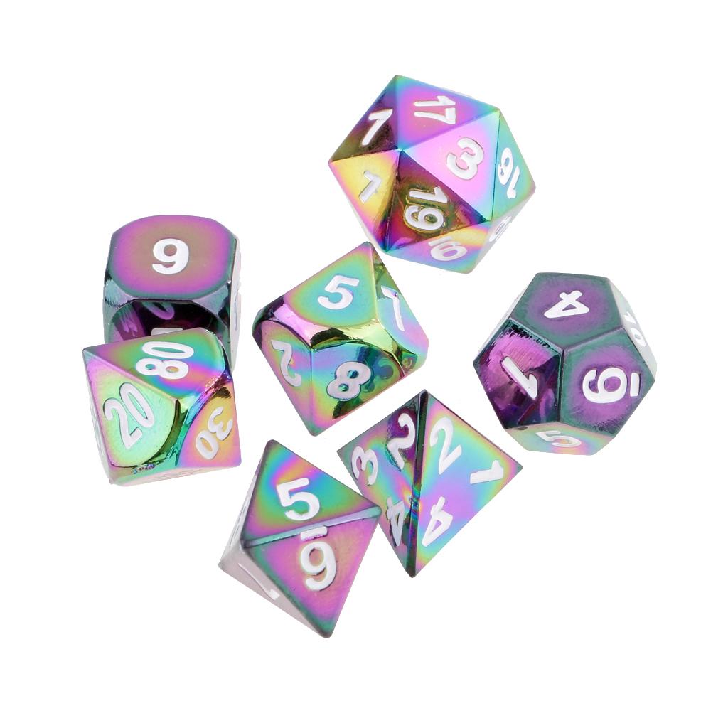 The 7 pieces dice set contains one D20, one D12, two D10 (00-90 and 0-9), one D8, one D6, and one D4