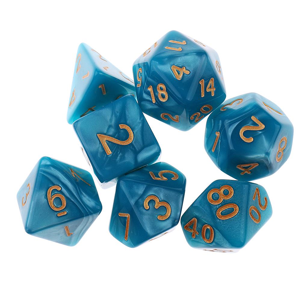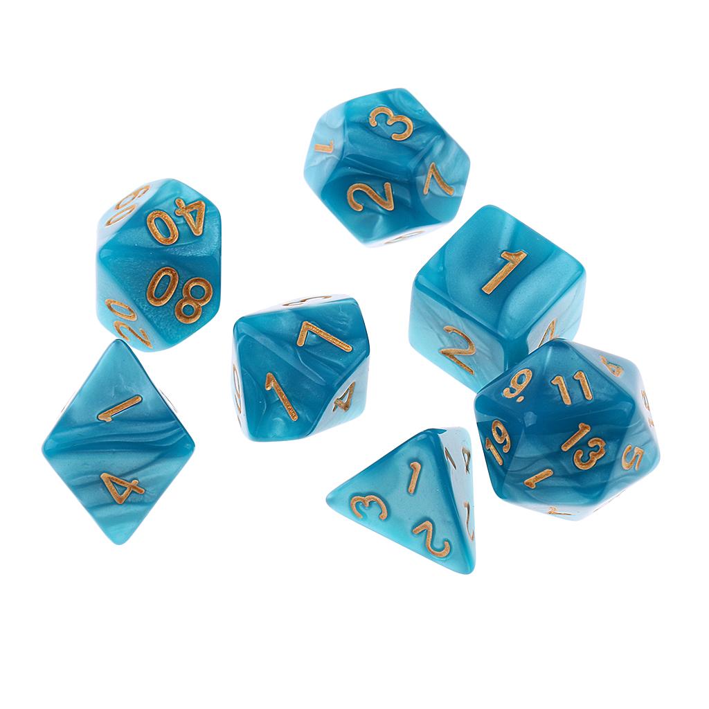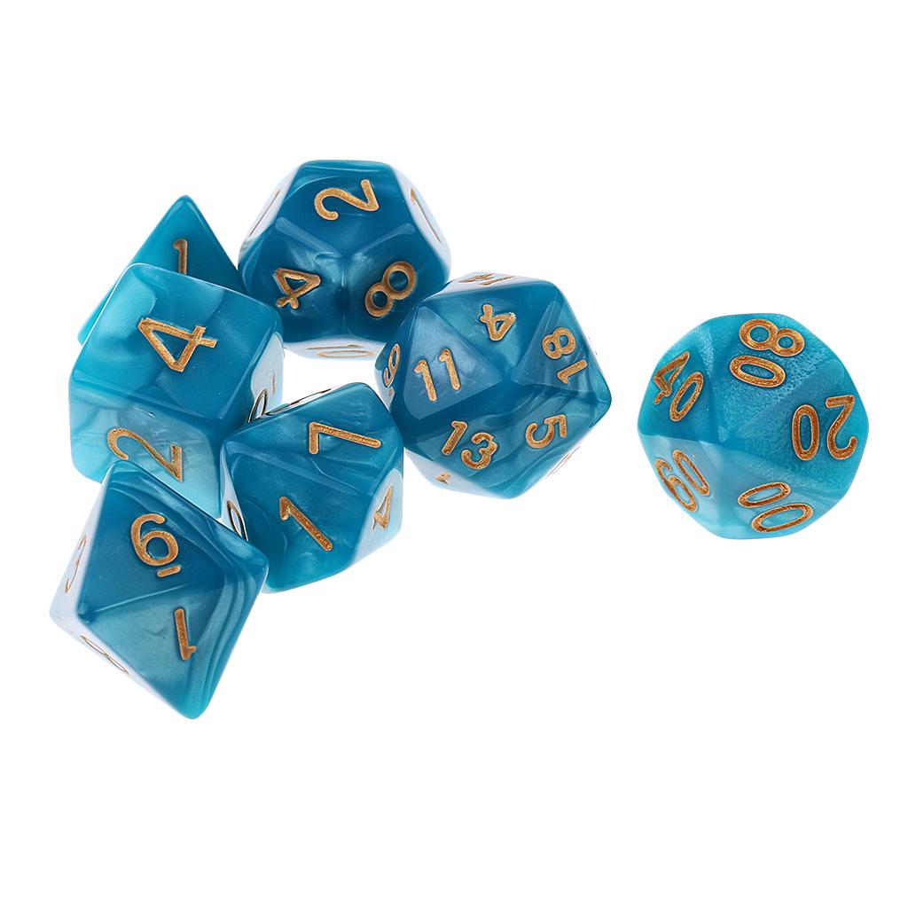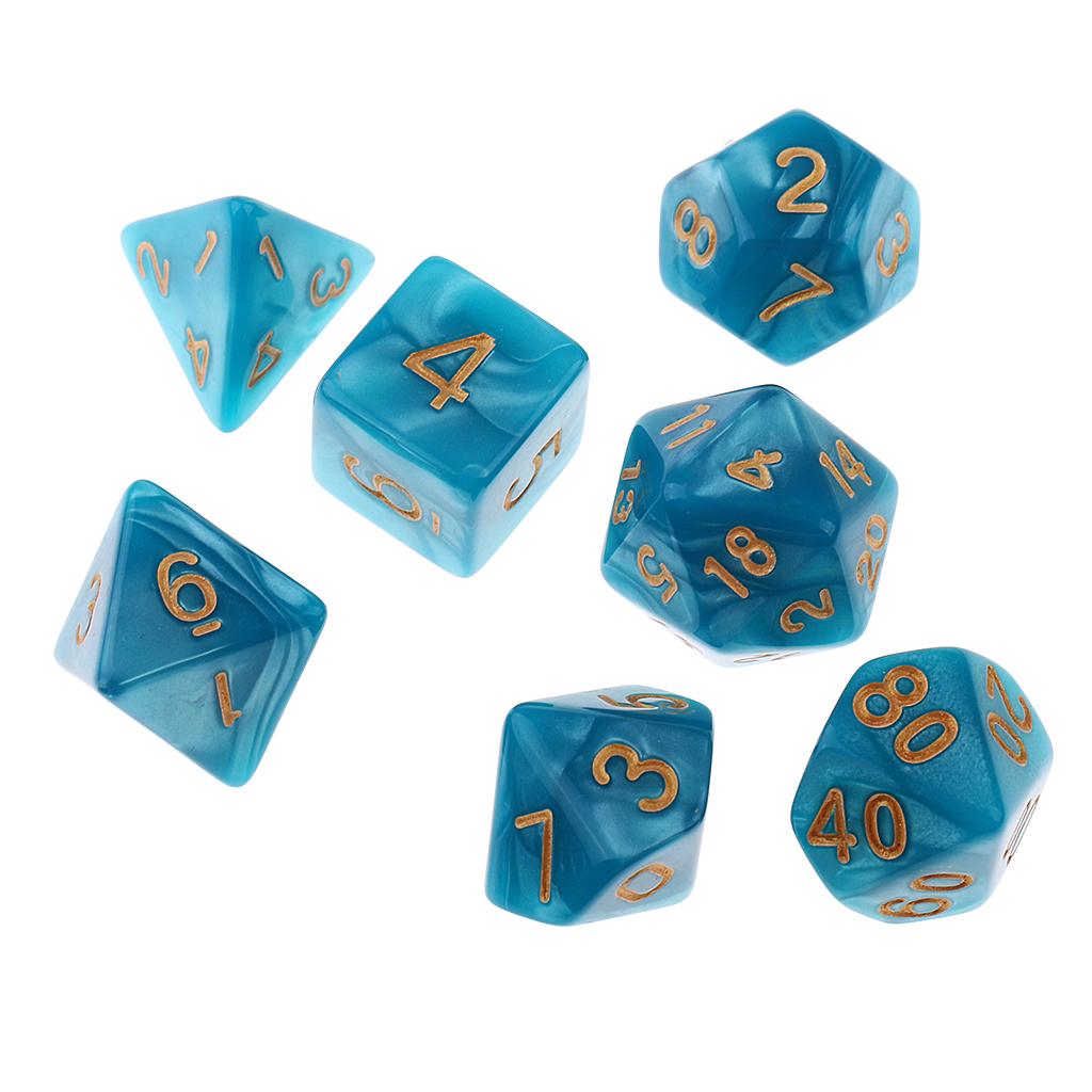 The 7PCS Dice set contains one D20, one D12, two D10 (00-90 and 0-9), one D8, one D6, and one D4.