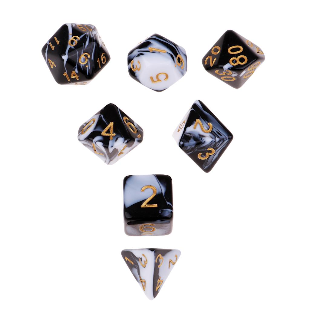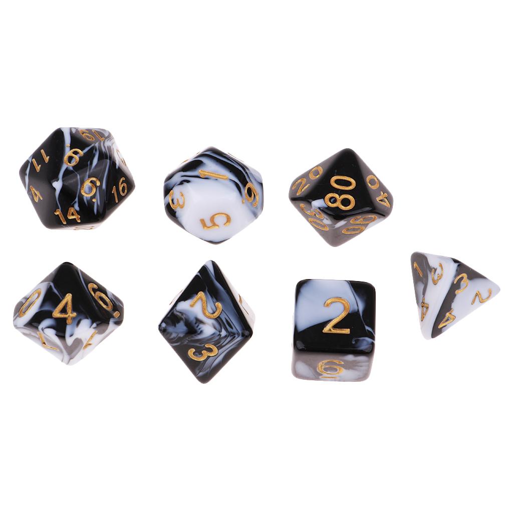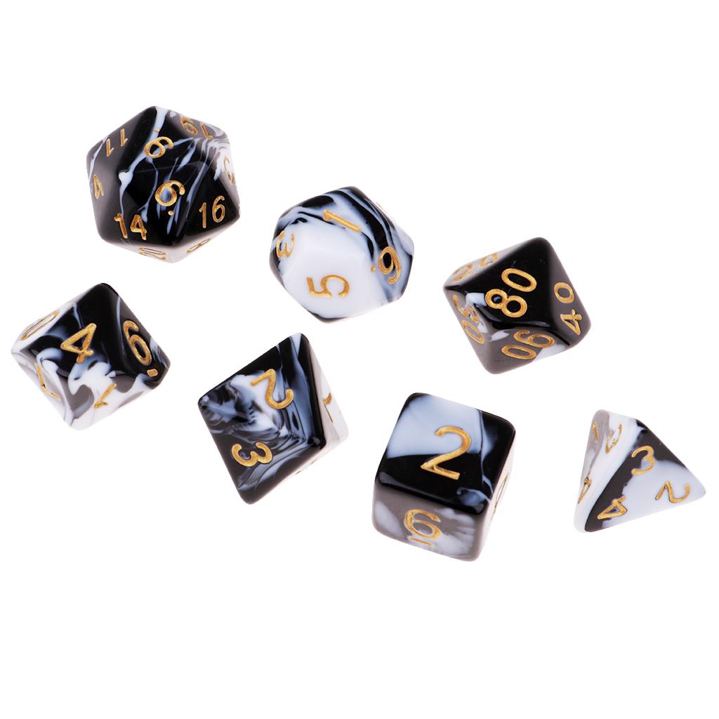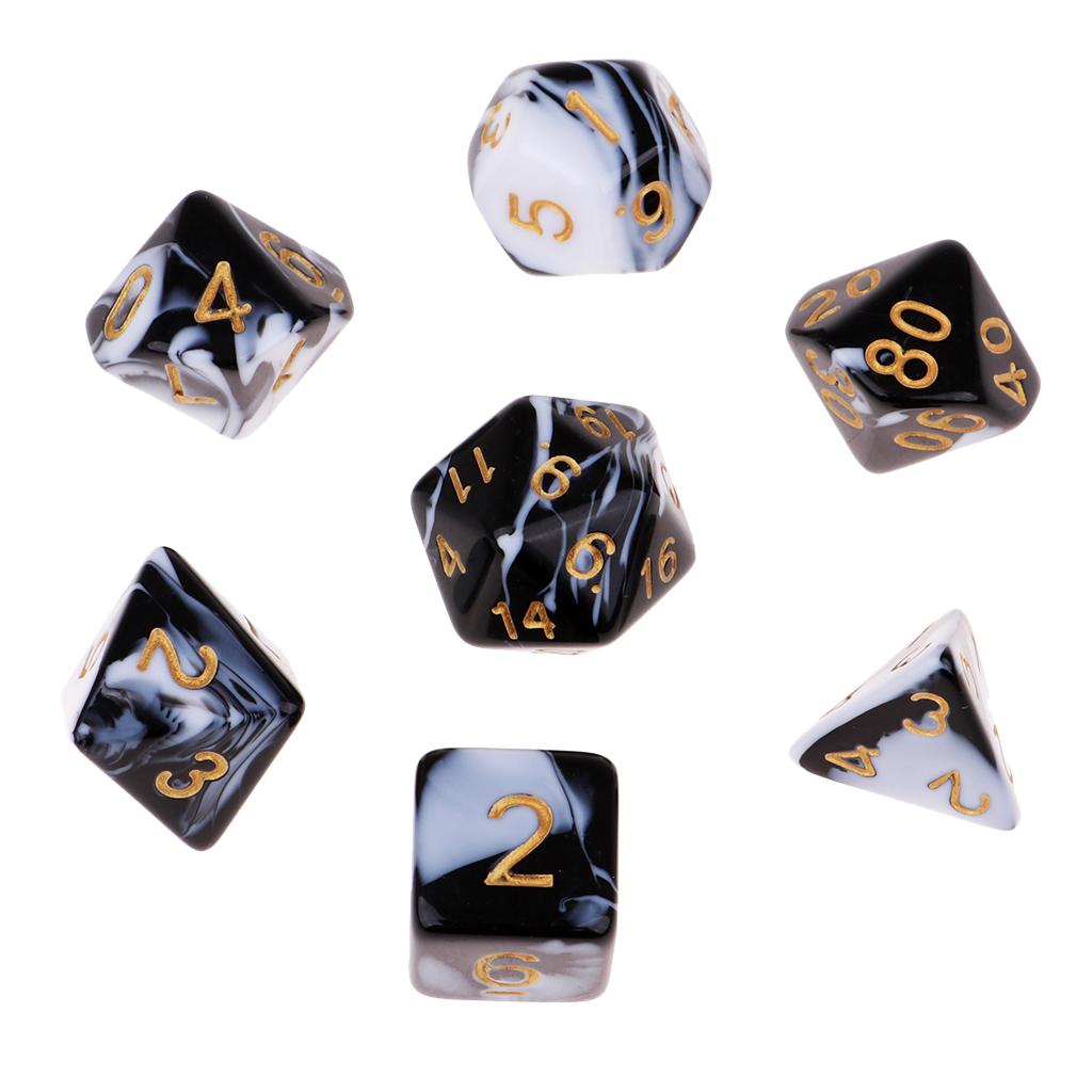The 7PCS Dice set contains one D20, one D12, two D10 (00-90 and 0-9), one D8, one D6, and one D4.