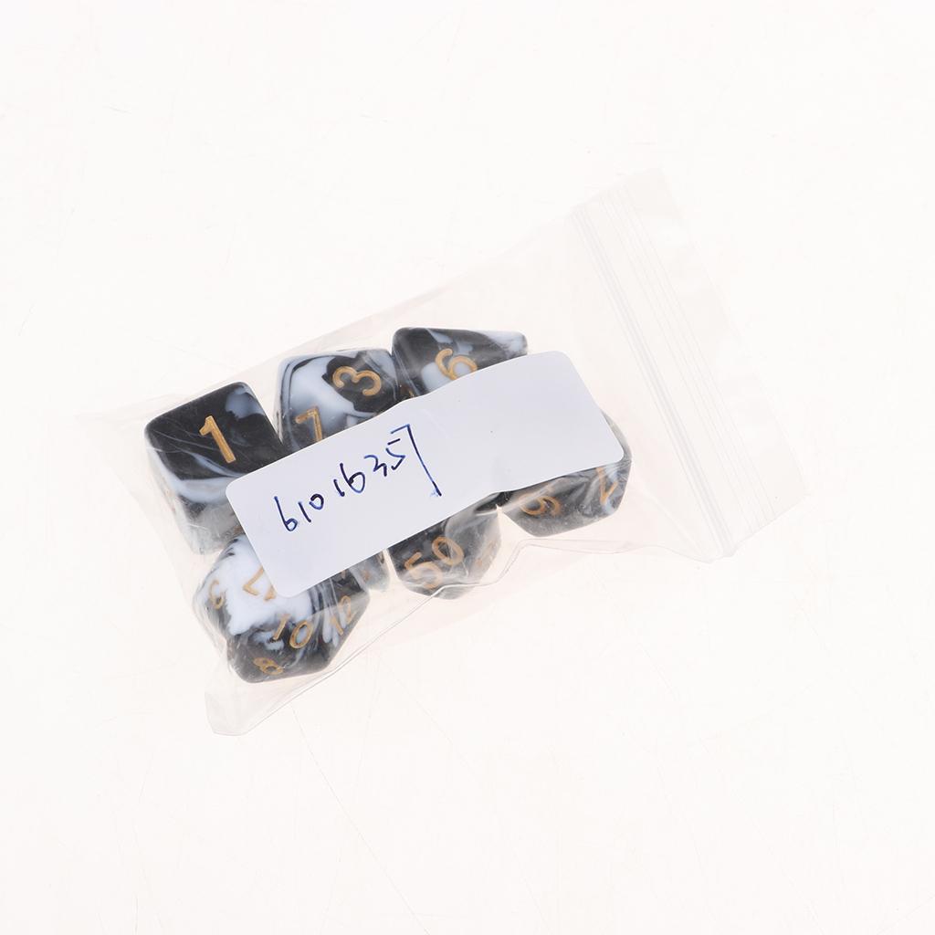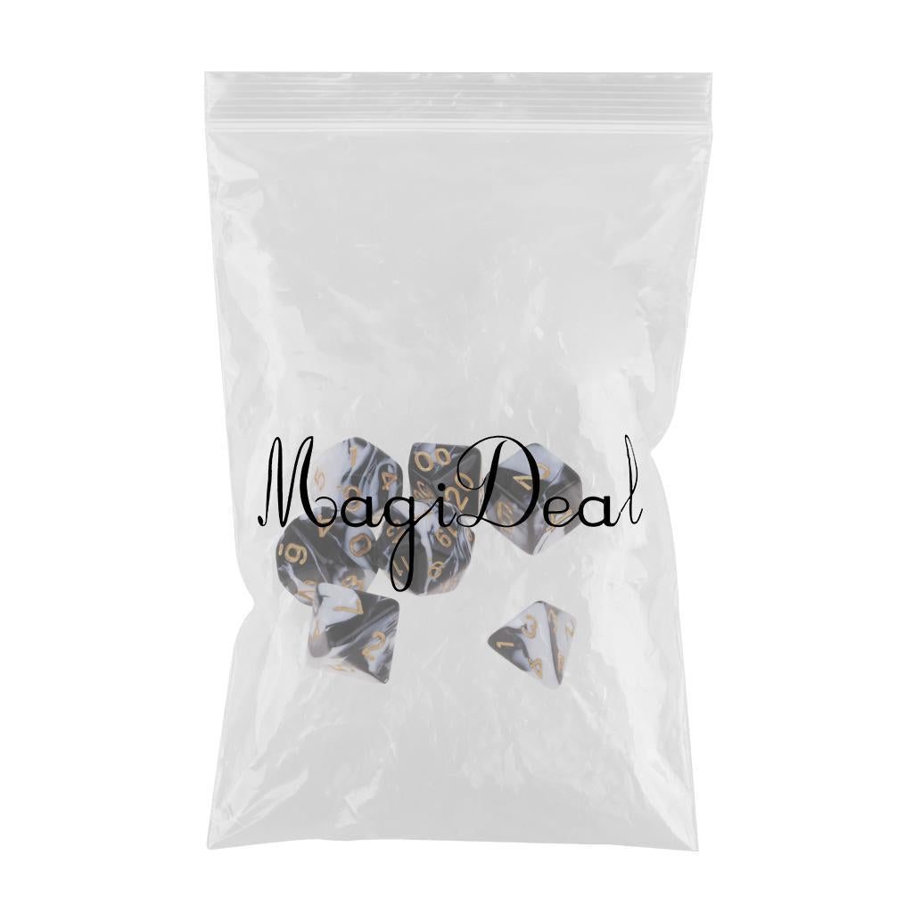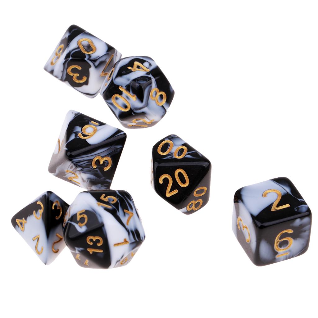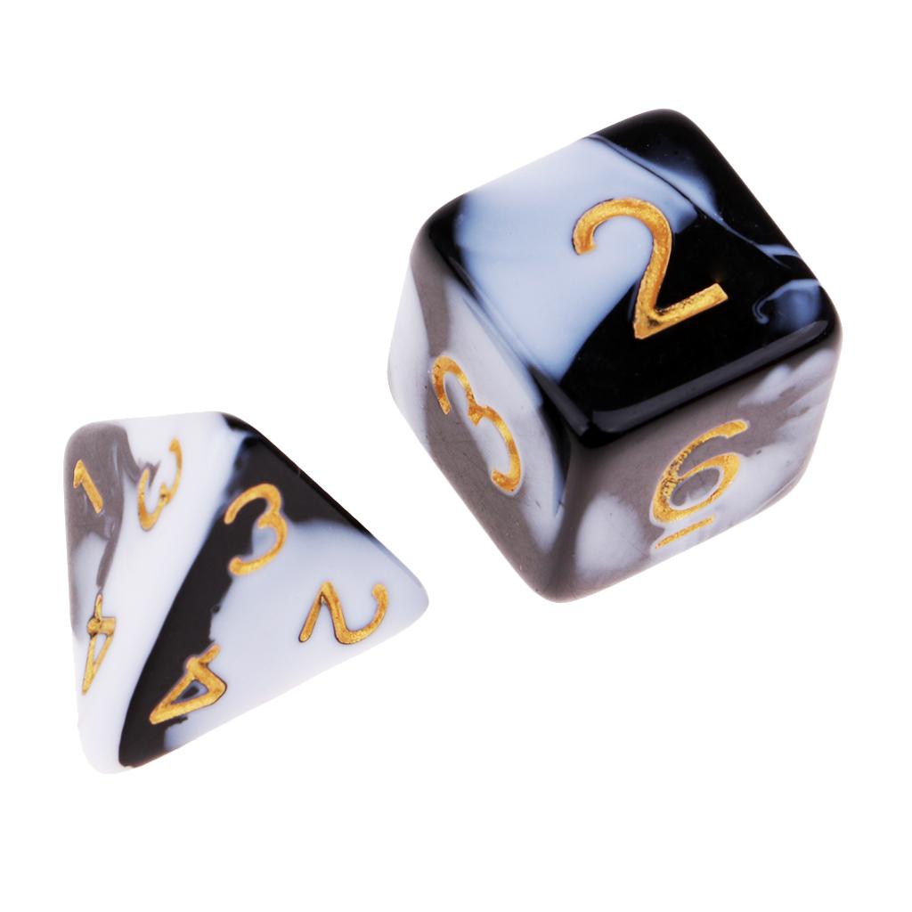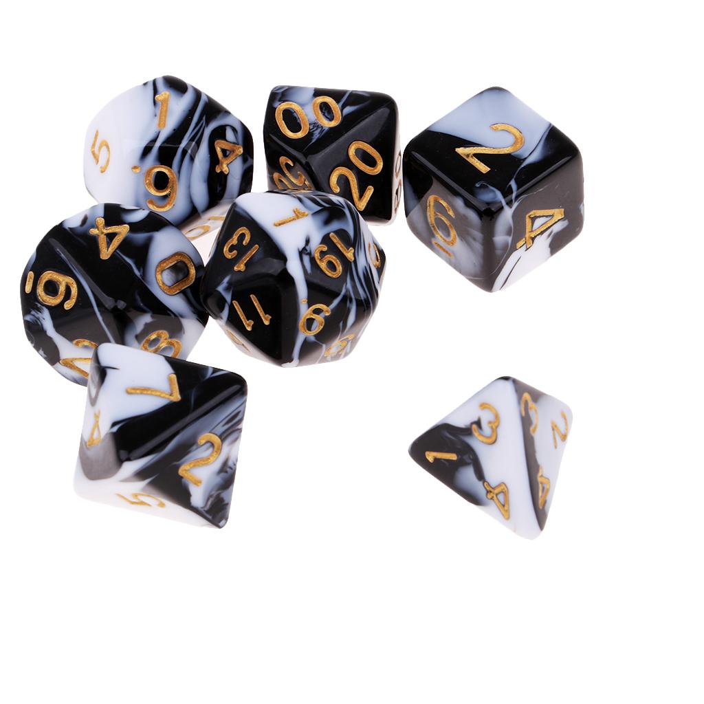 The 7PCS Dice set contains one D20, one D12, two D10 (00-90 and 0-9), one D8, one D6, and one D4.