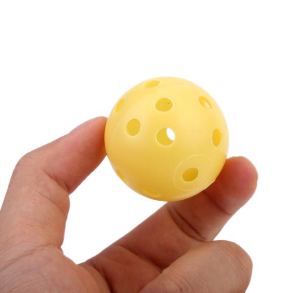 These Yellow Plastic Perforated Practice Tennis Golf Balls are ideal for indoor and outdoor use. The perforated balls are lightweight that can help flight far more distance for pre-game warm ups. These practice balls project a limited flight path and are great for training a hitter's eye to see the ball better in game situations. These durable balls are suitable for golf or tennis practicing and will bring you much more enjoyment.