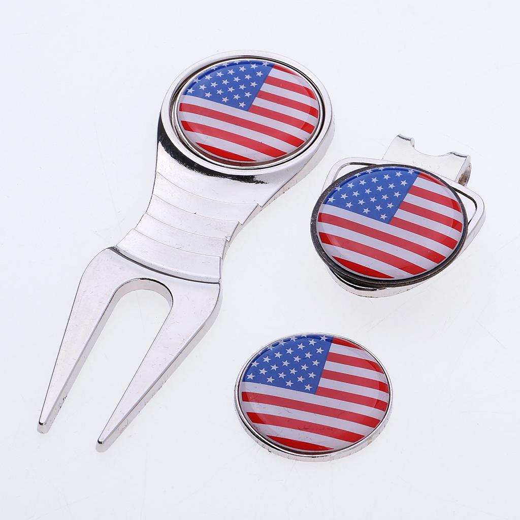 Portable divot repair tool, hat clip, and ball marker golf gift set.