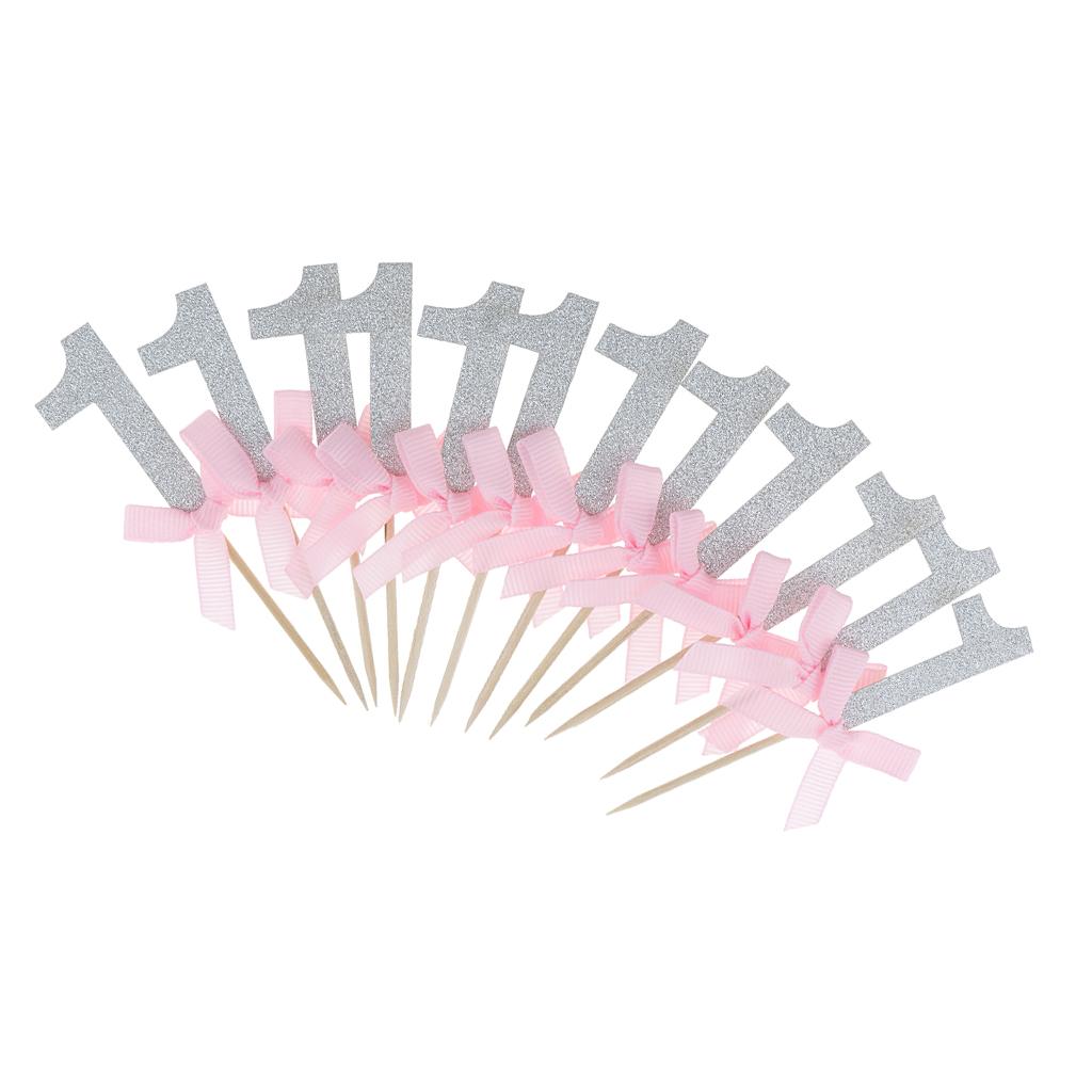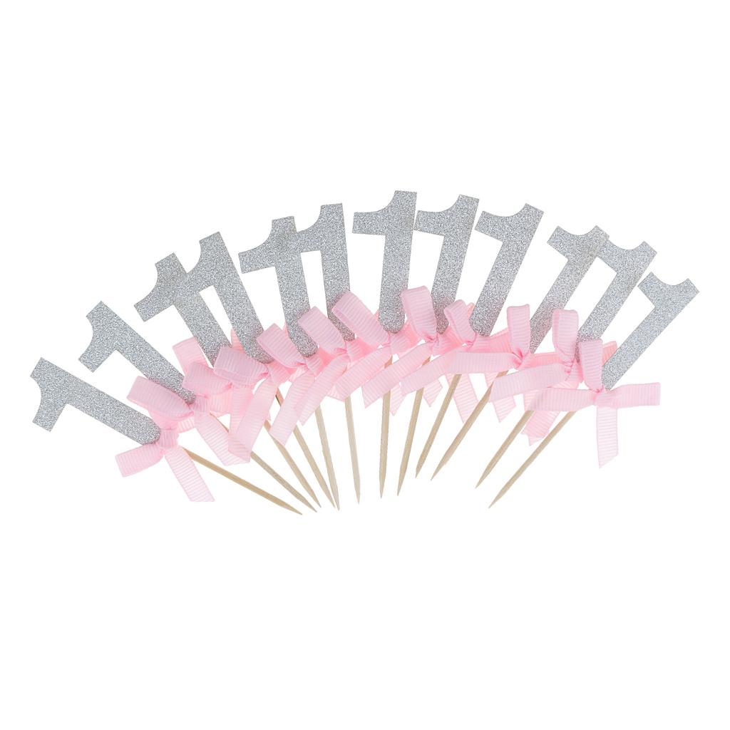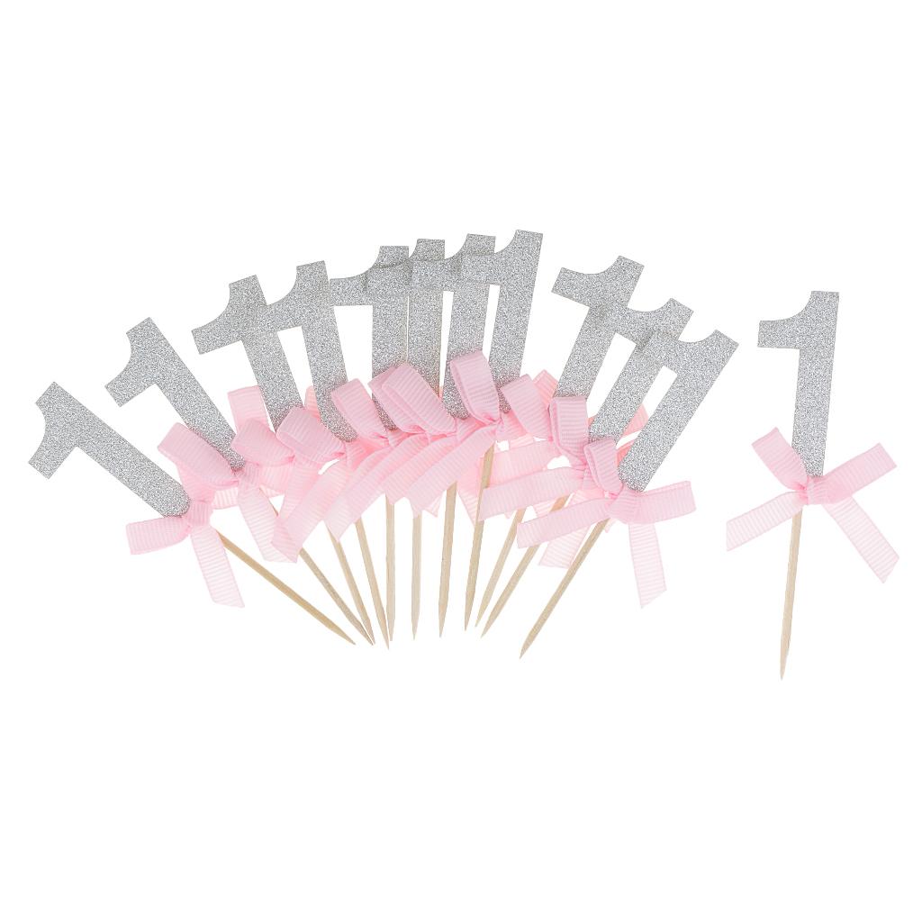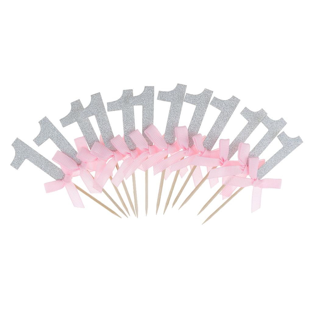Pack of 12 pieces cake toppers, featuring glitter Arabic number 1 and pink ribbon bow