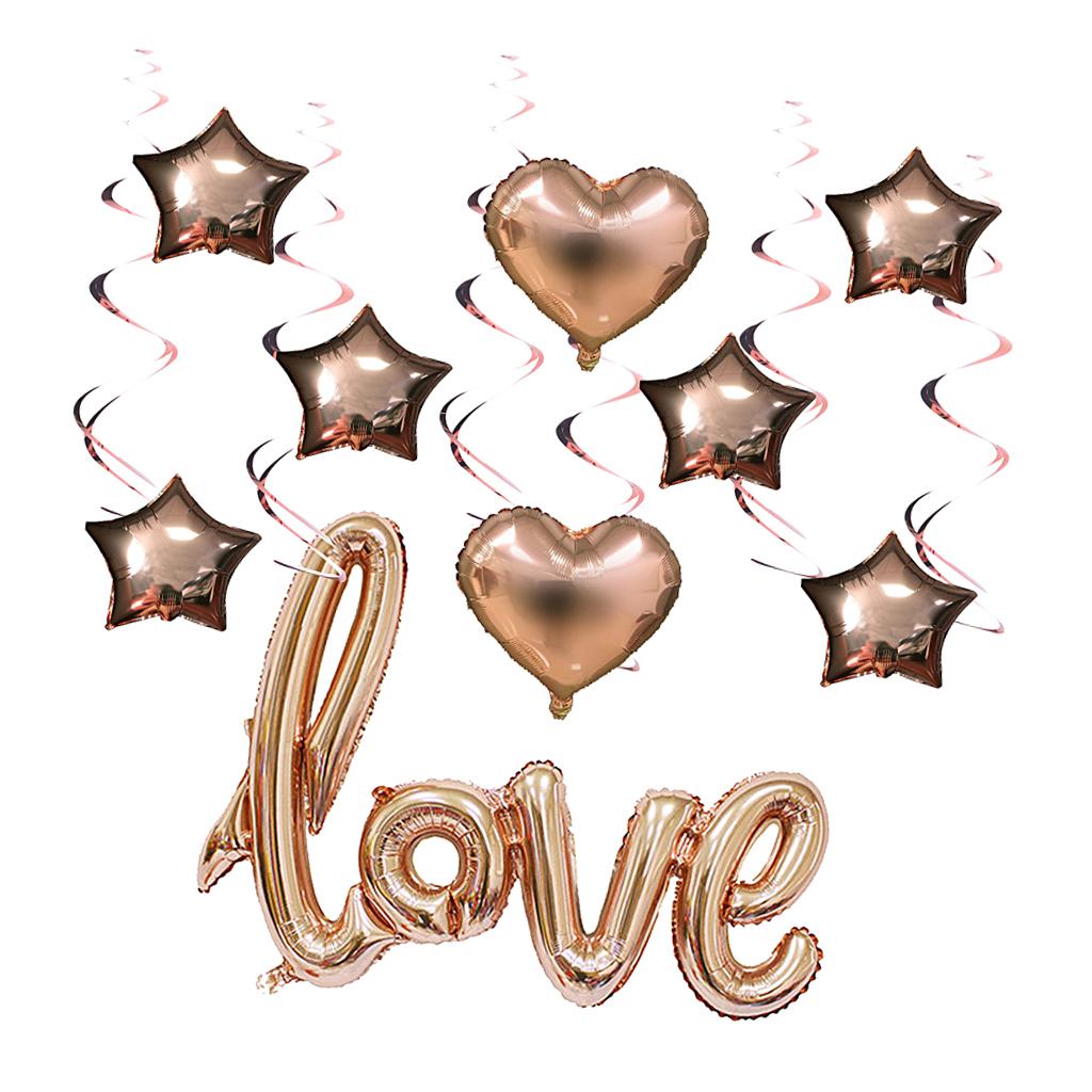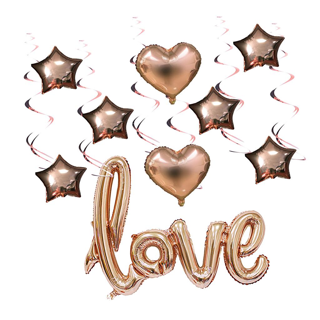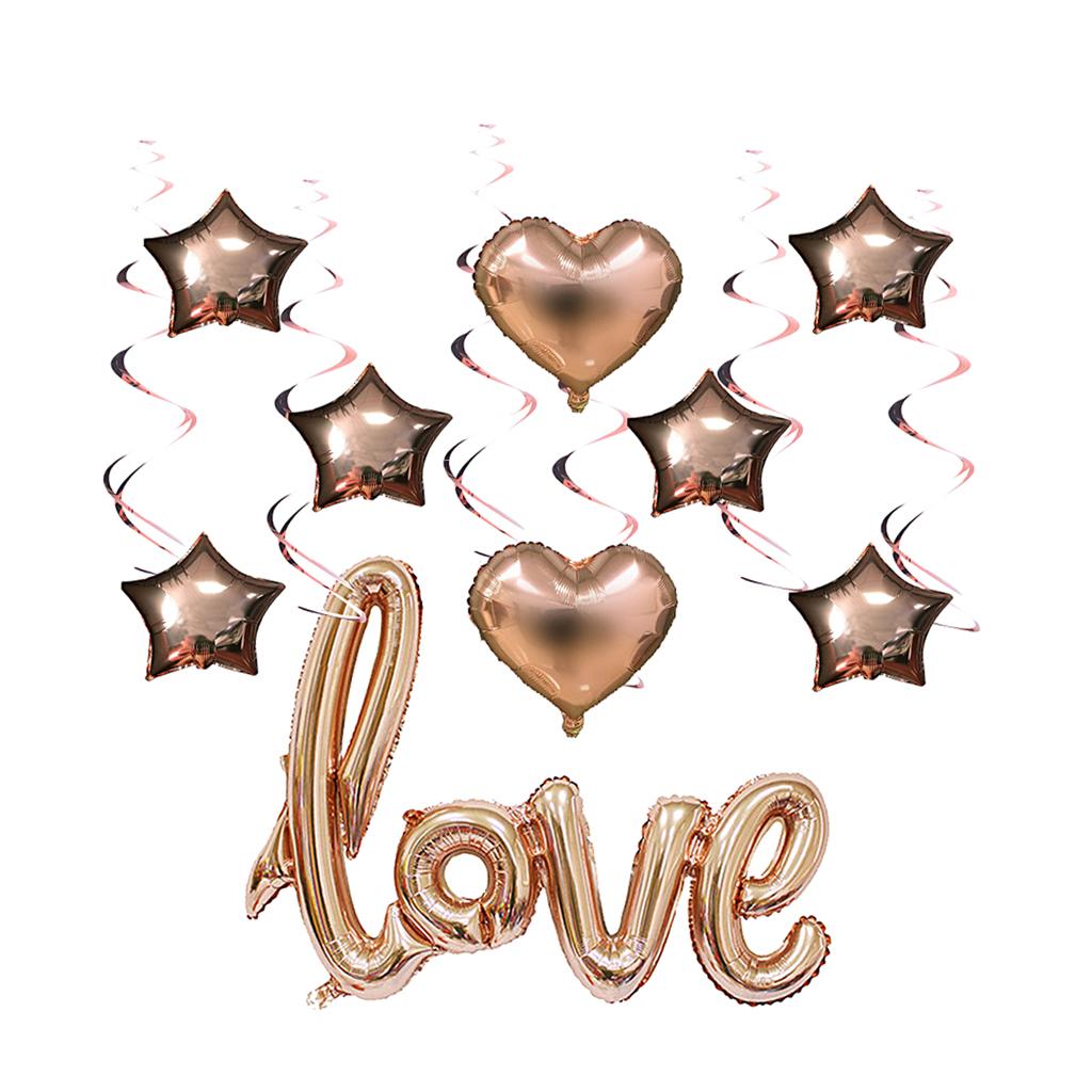 1 piece love foil balloon, 6 pieces star foil balloons, 2pcs heart foil balloons, 6 pieces spirals