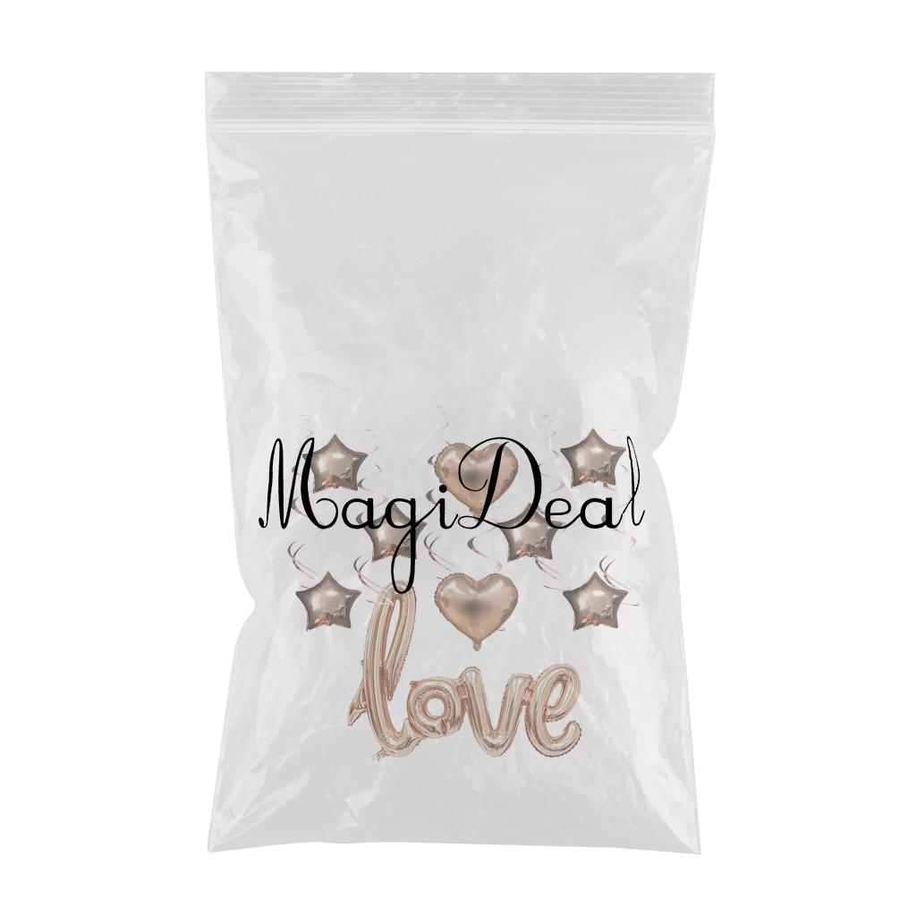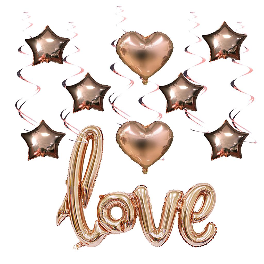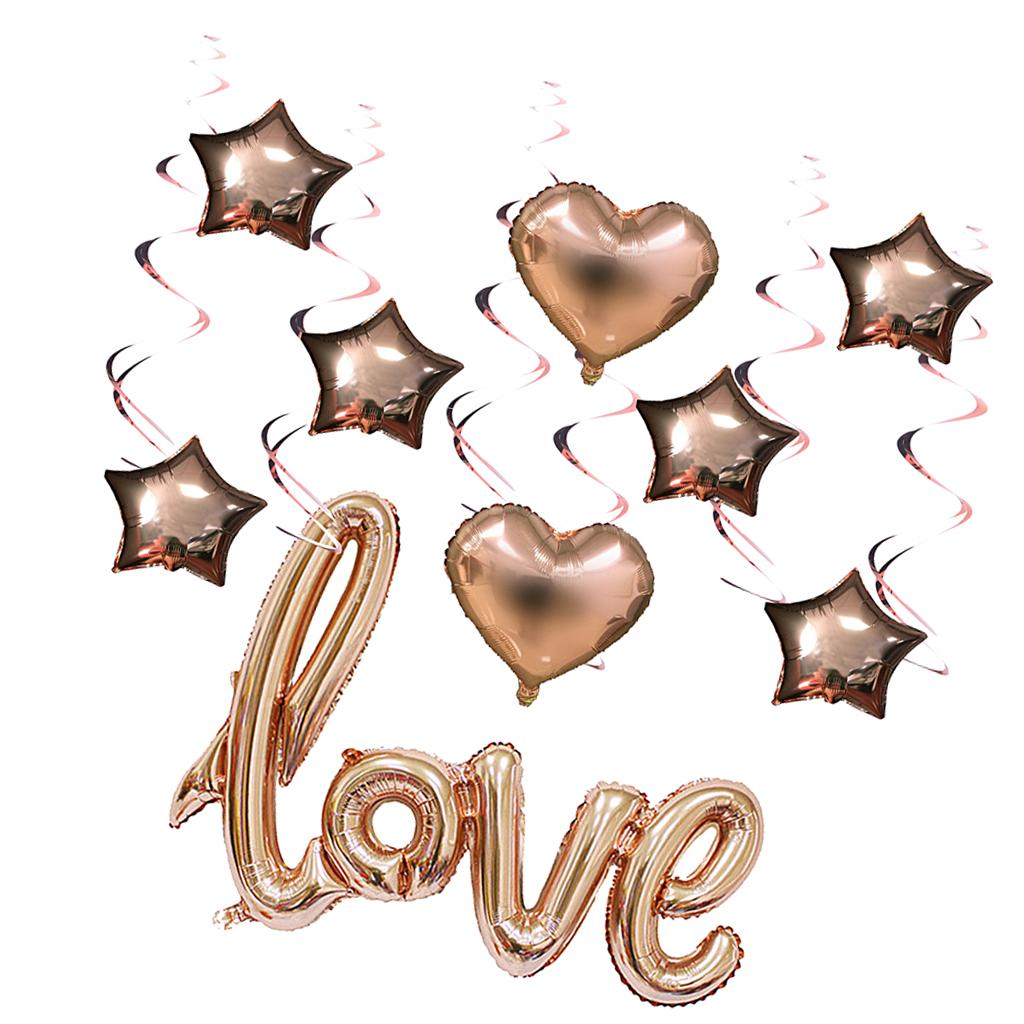 1 piece love foil balloon, 6 pieces star foil balloons, 2pcs heart foil balloons, 6 pieces spirals