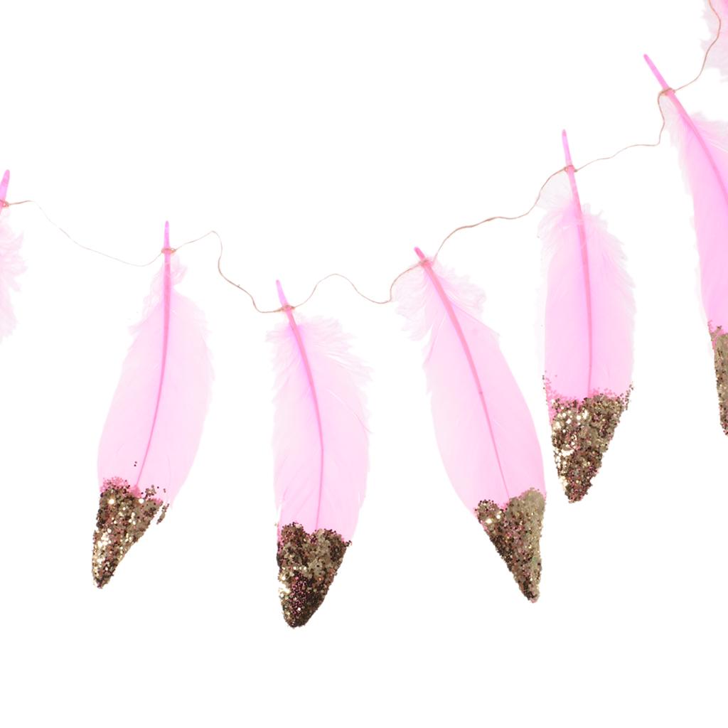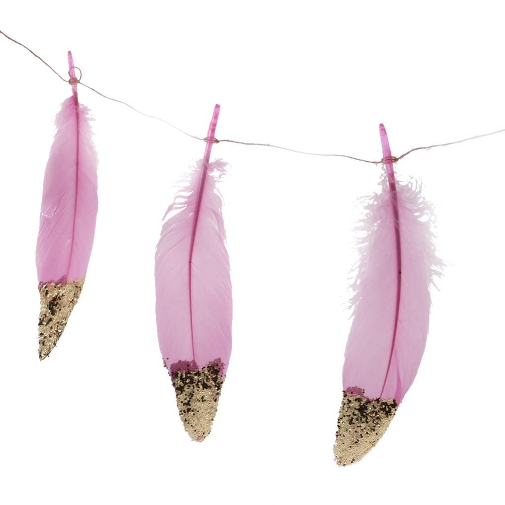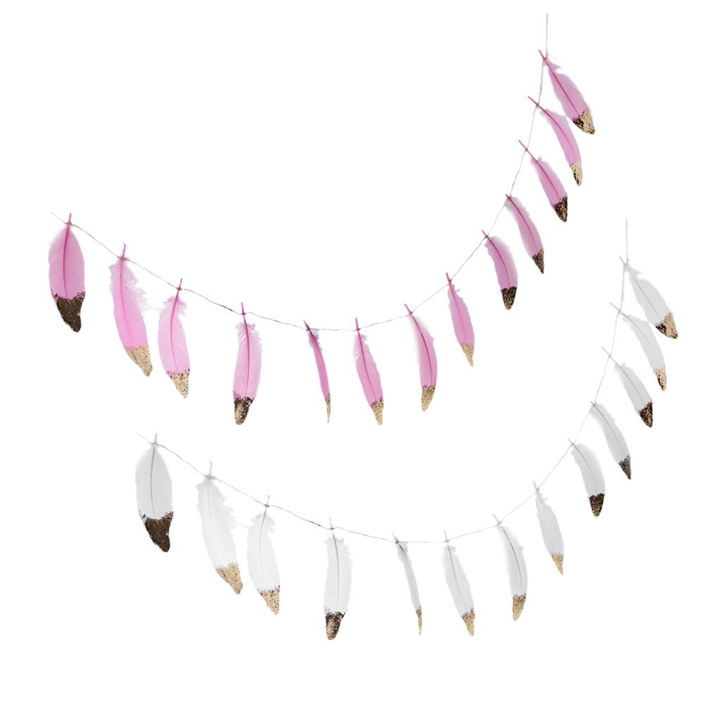 Two string of glitter gold dipped feather garlands (pink / white), 13 pieces in total