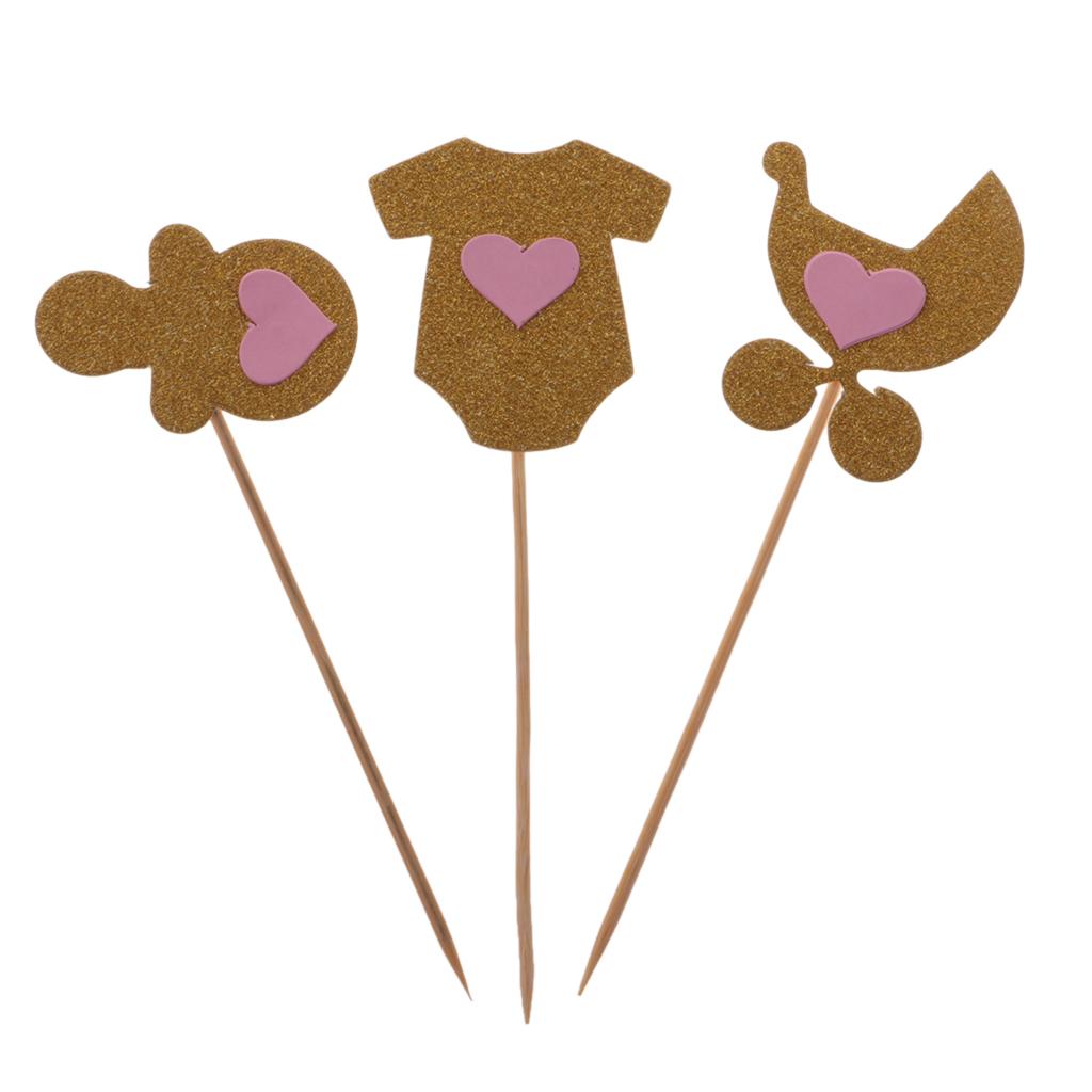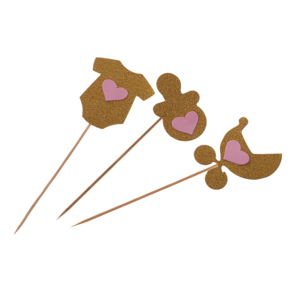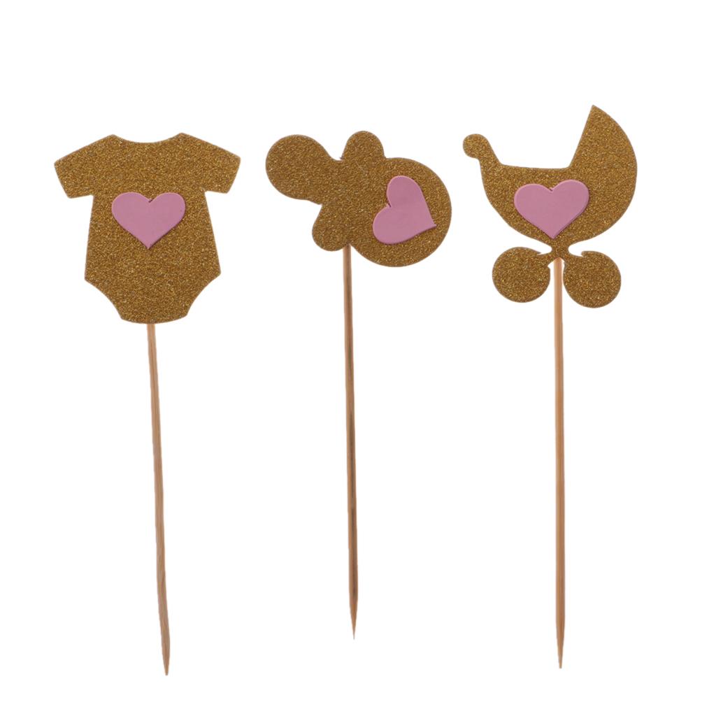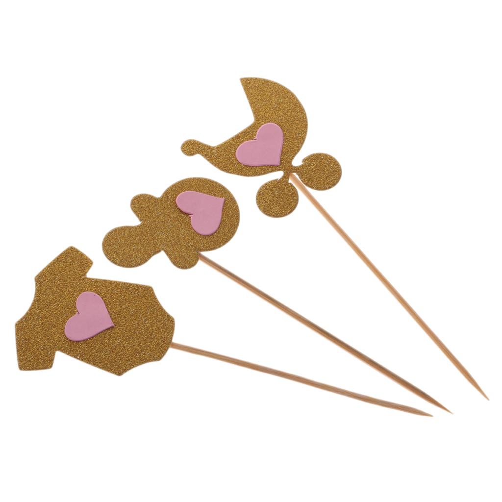 3pcs Paper Glitter Baby Theme Cupcake Picks Cake Toppers Baby Shower Gold