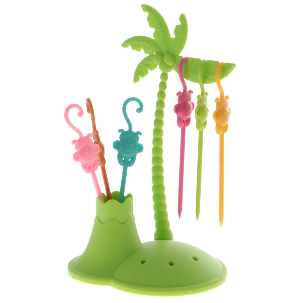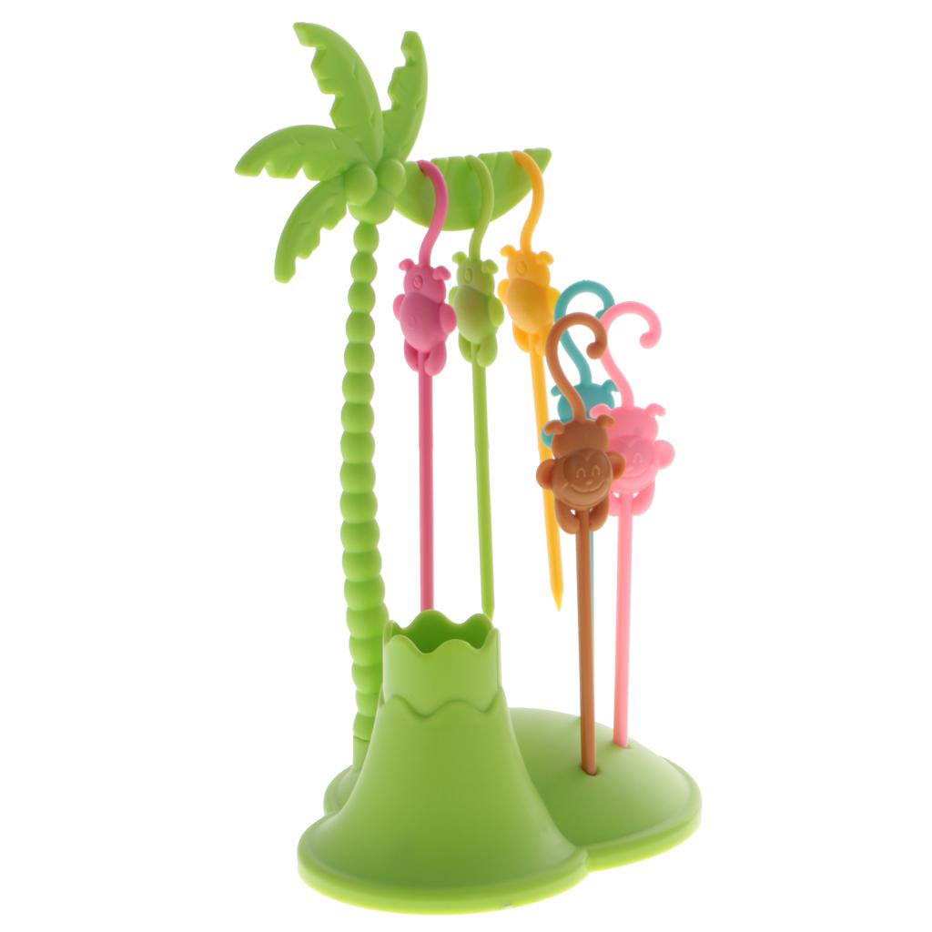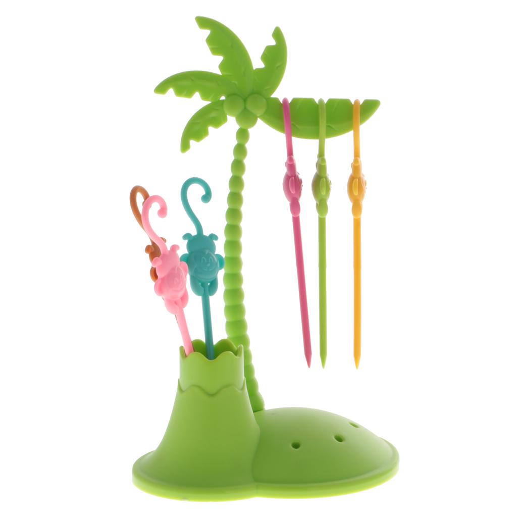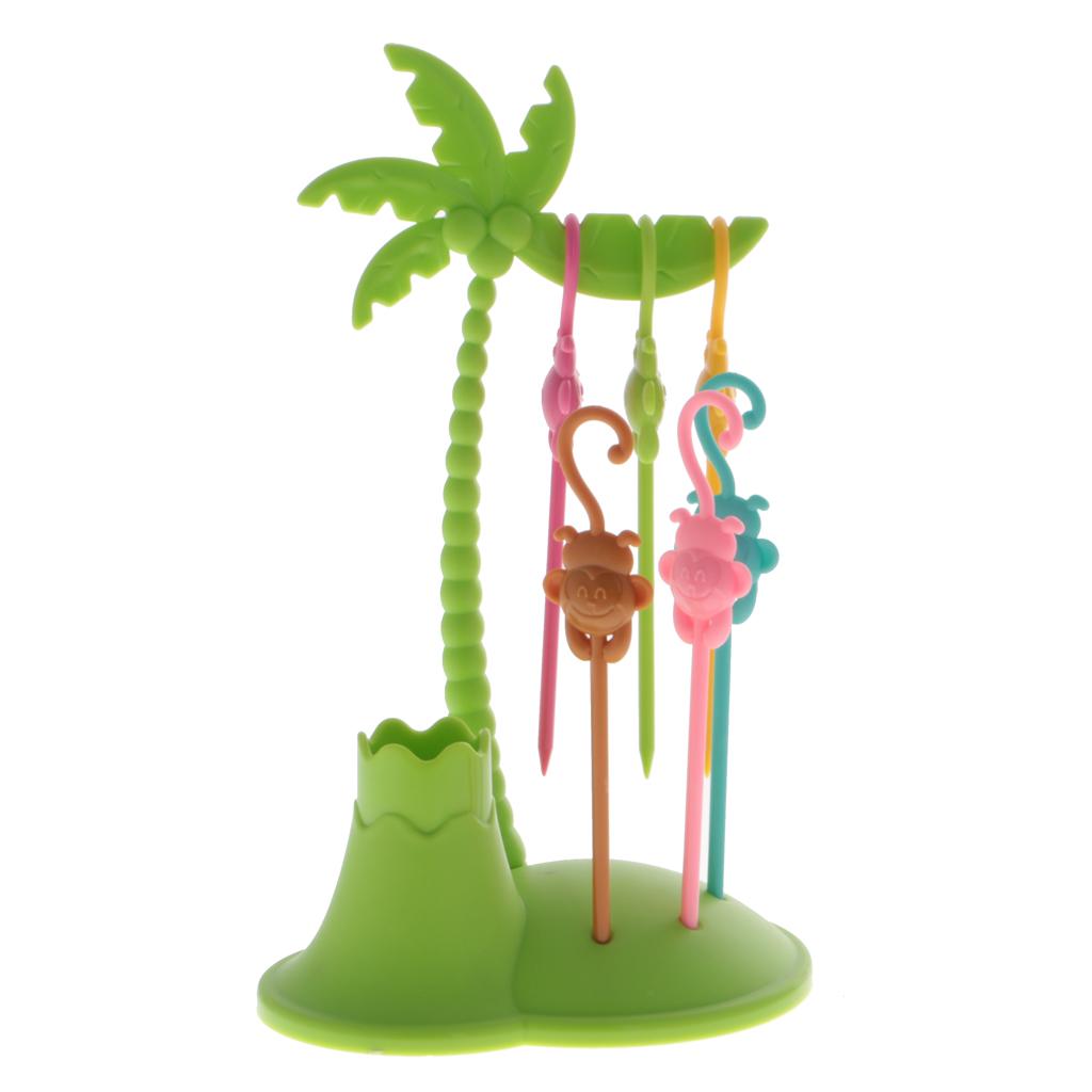 7pcs /Set Plastic Fruit Forks Monkey Coconut Tree Holder Tableware Green