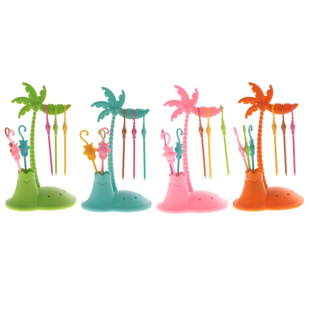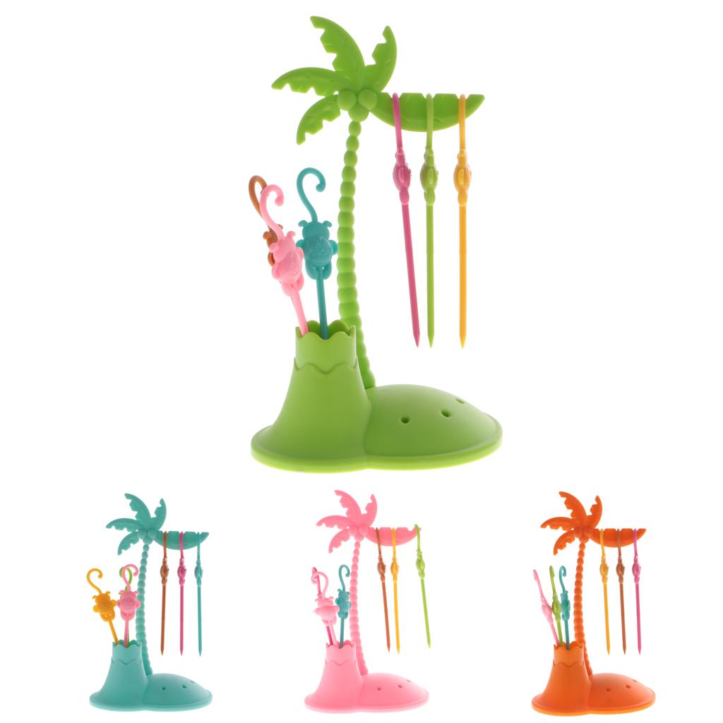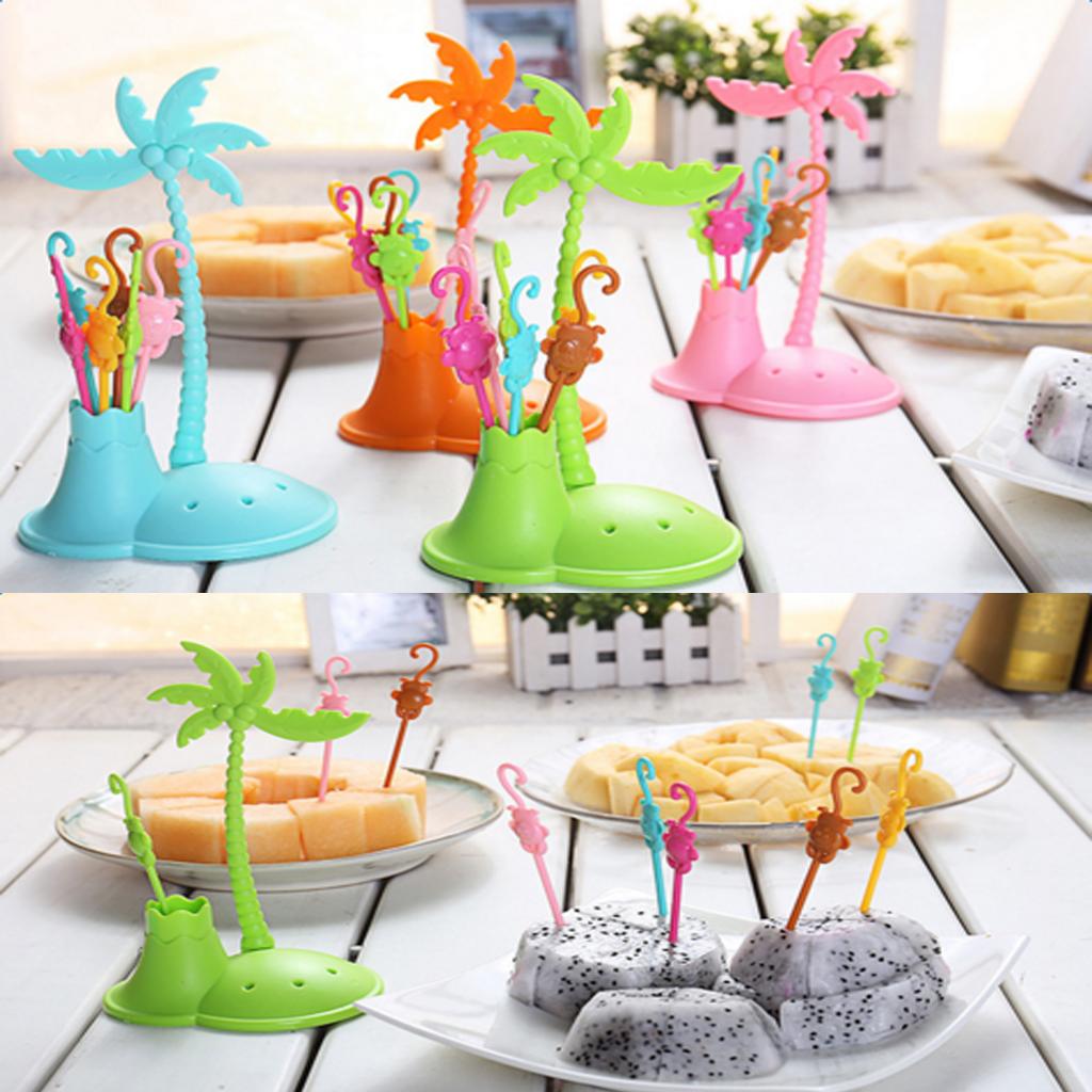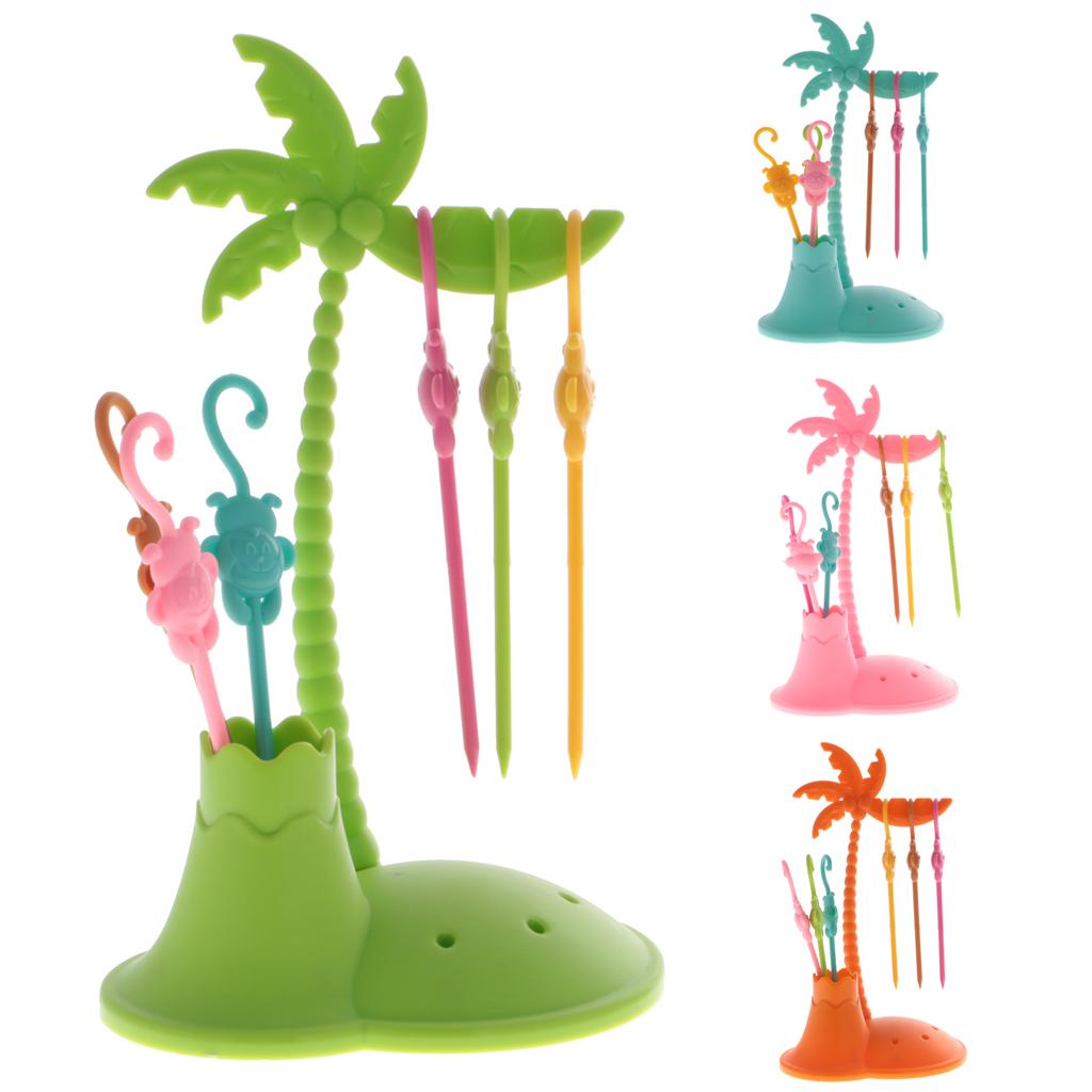 7pcs /Set Plastic Fruit Forks Monkey Coconut Tree Holder Tableware Green