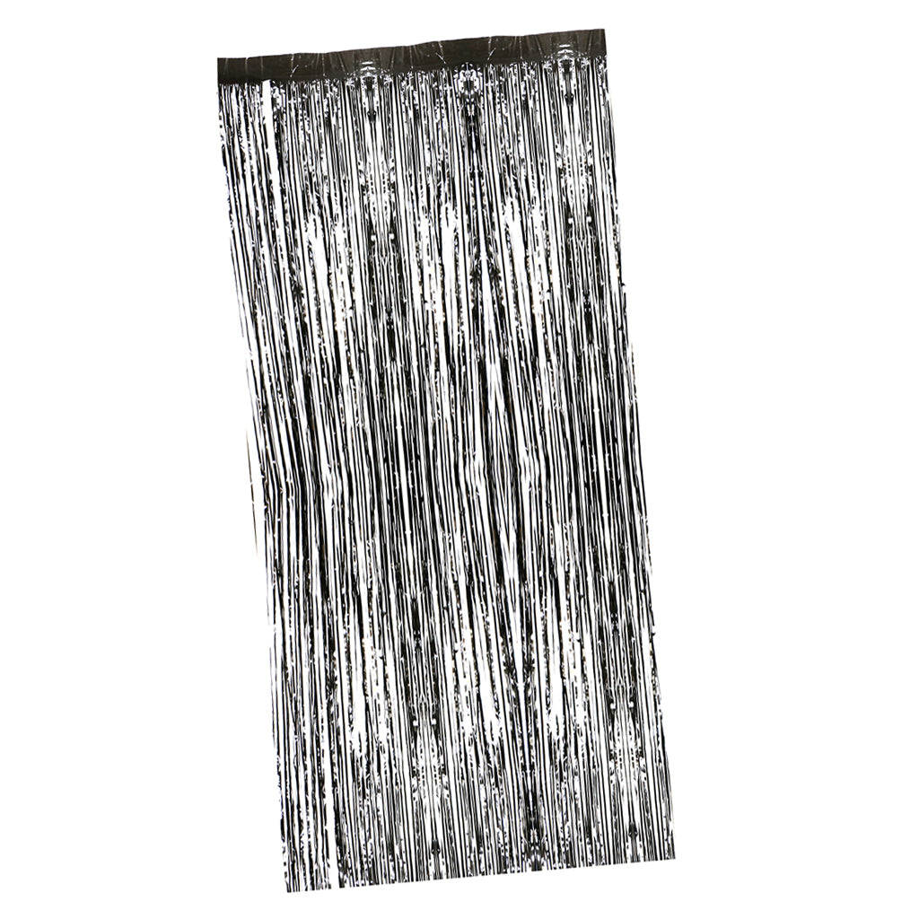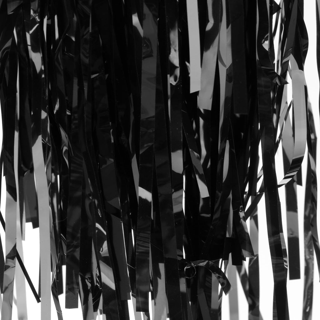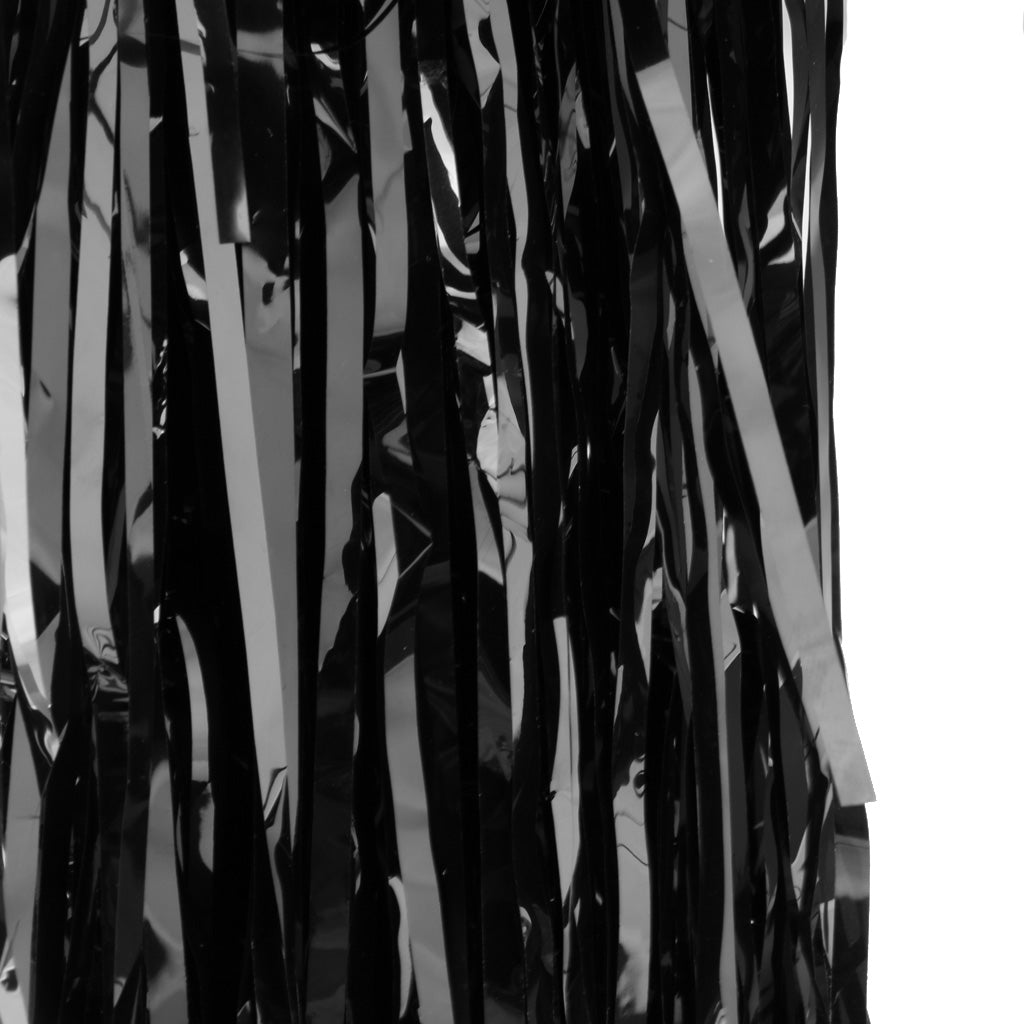 This shiny metallic black foil fringe curtain makes an impressive decoration for any event.