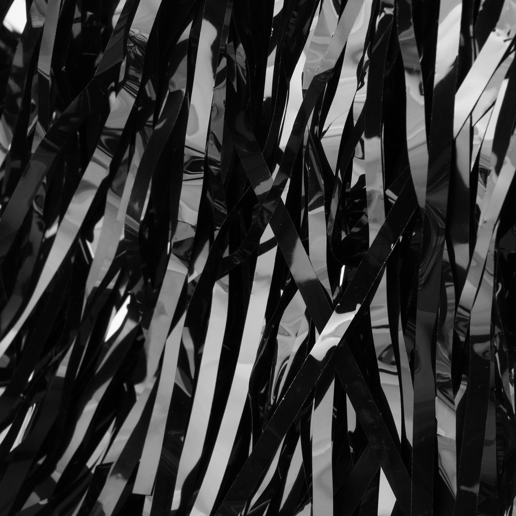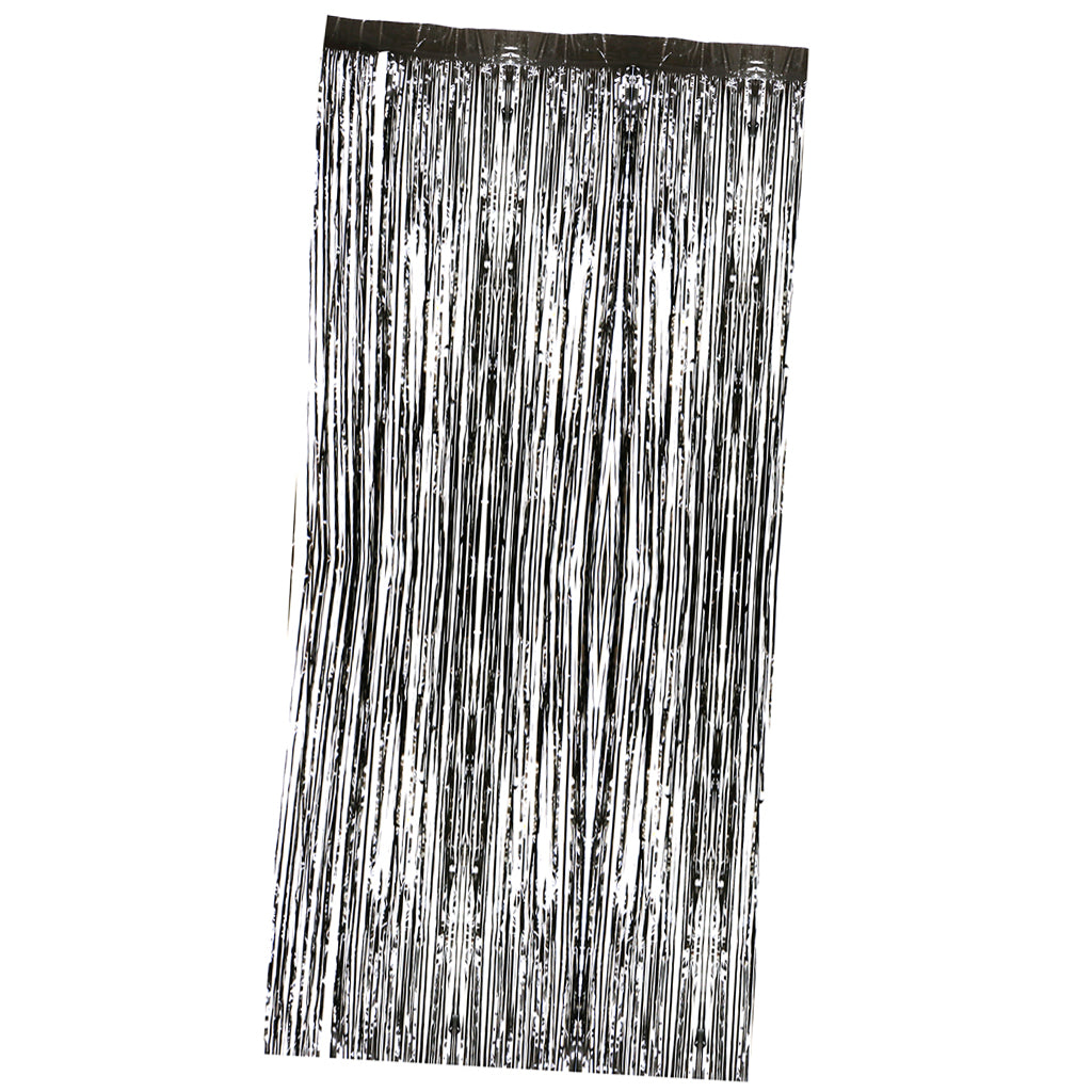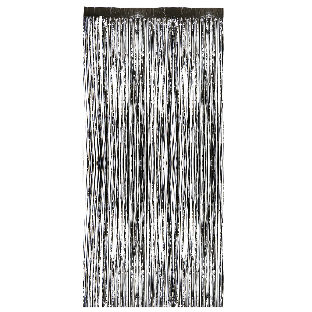 This shiny metallic black foil fringe curtain makes an impressive decoration for any event.