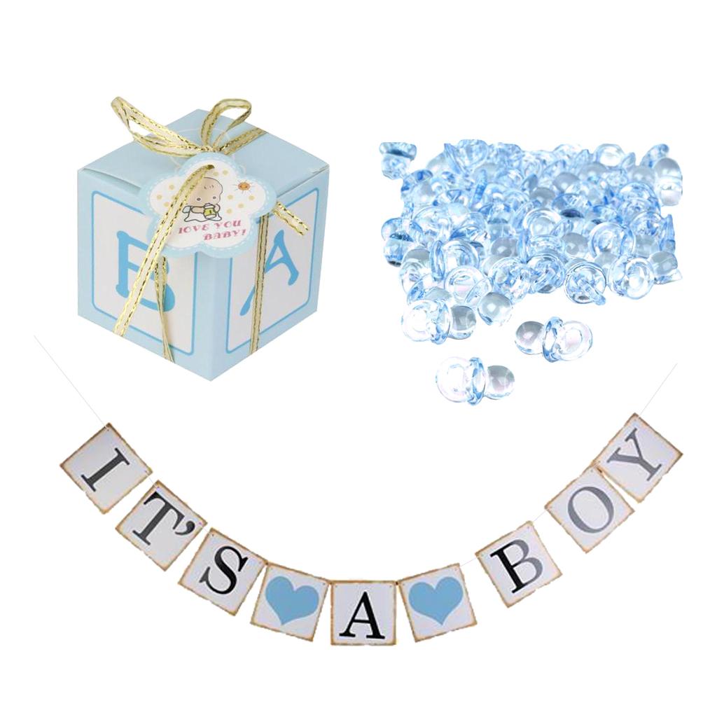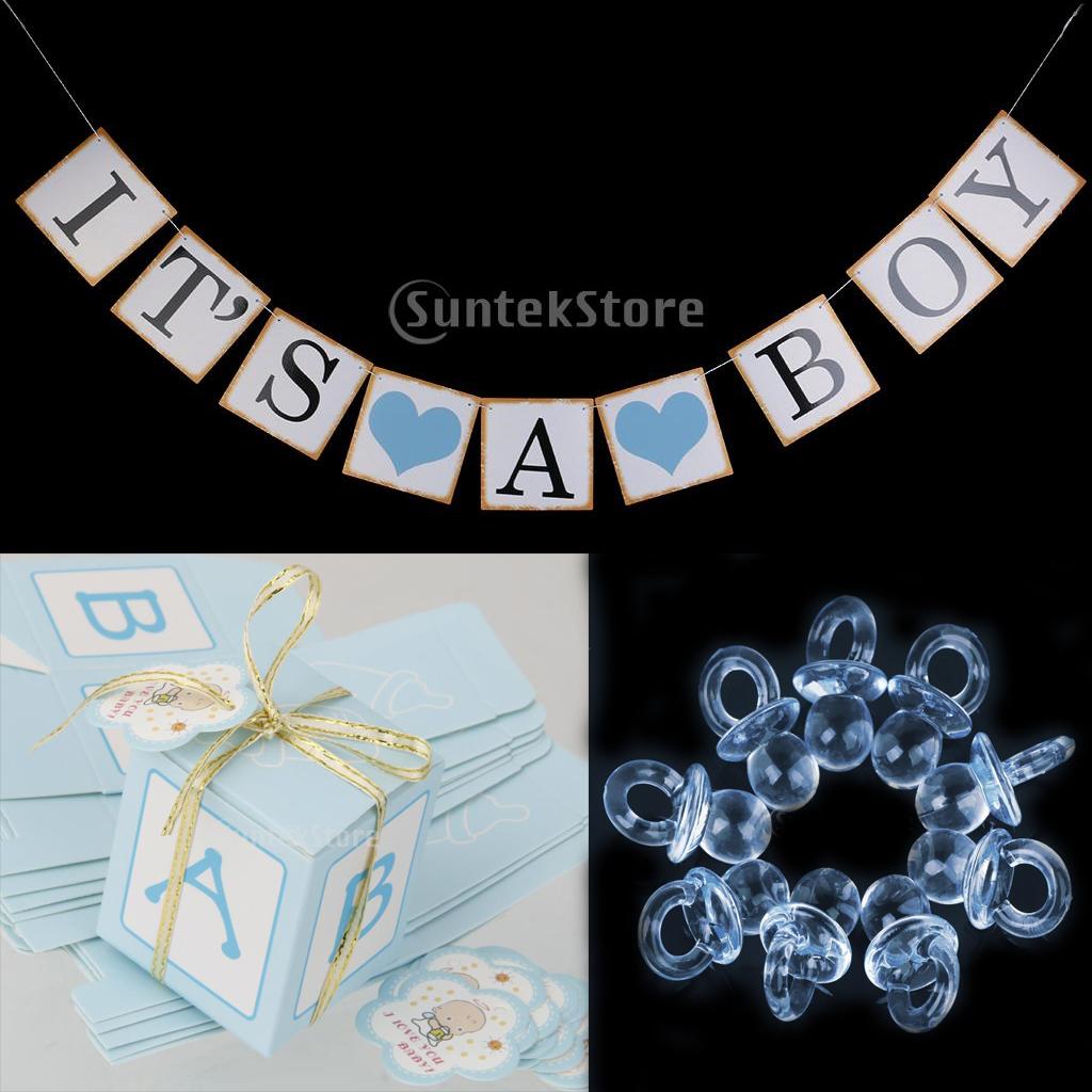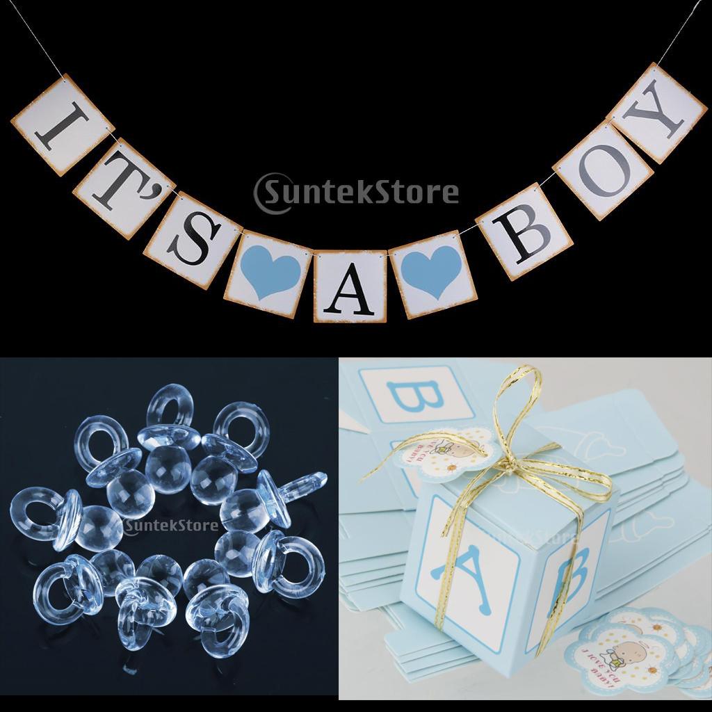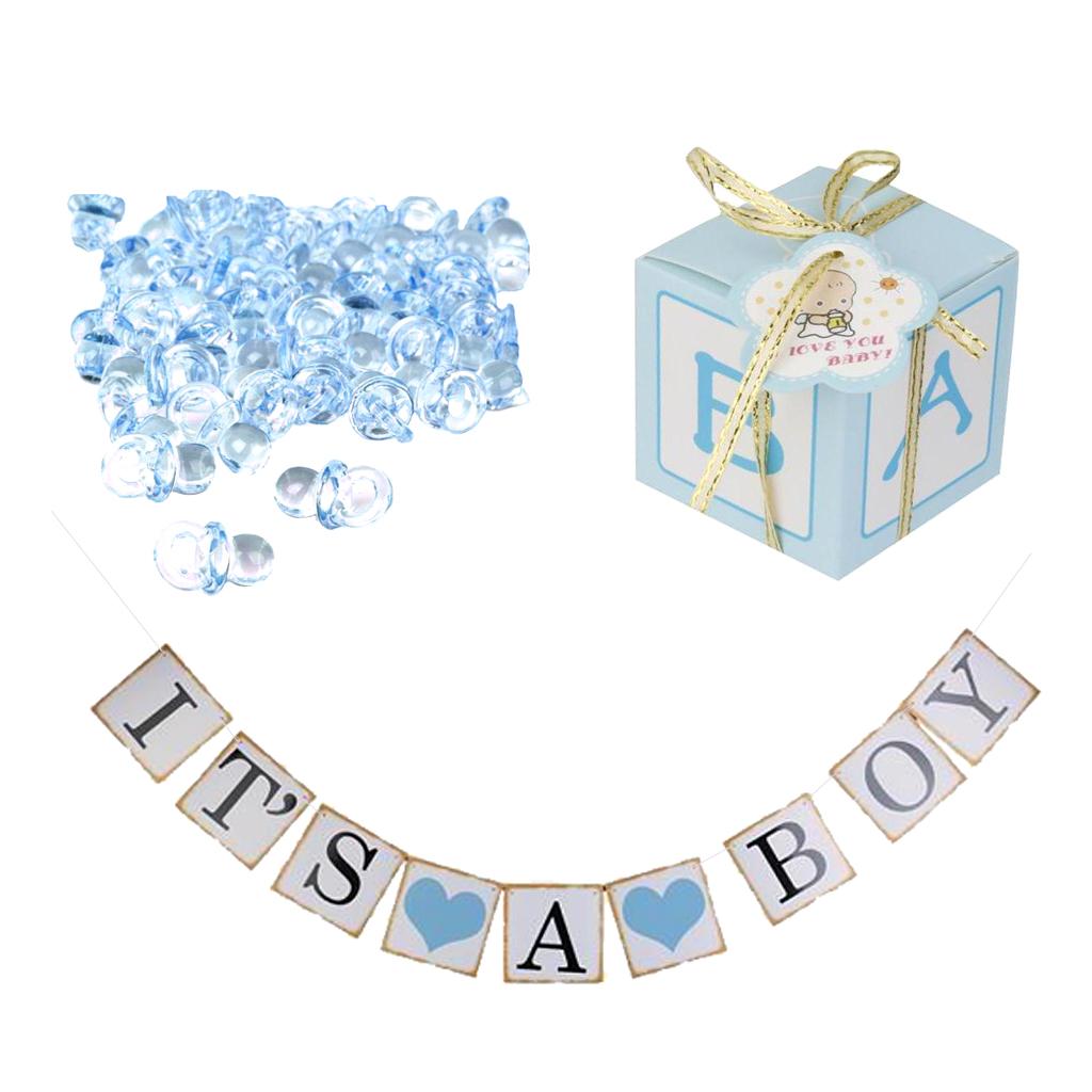 • Cute design baby paper boxes. Have these mini pacifiers on hand to decorate your baby shower. Whether strewn on tables or used as filler for gifts, these minis are always a big hit. A beautiful handcrafted IT'S A BOY banner, also perfect as a photography prop