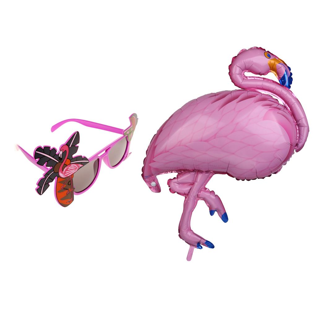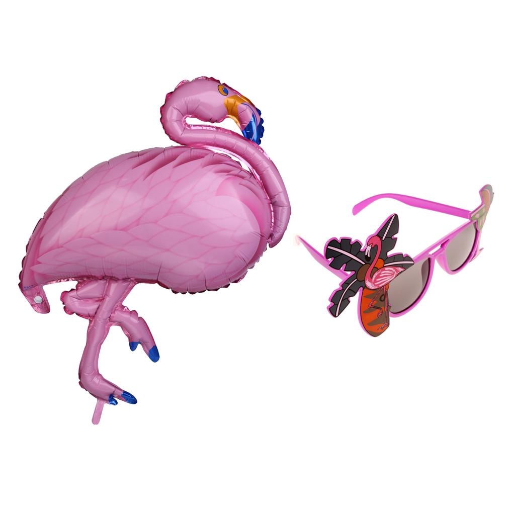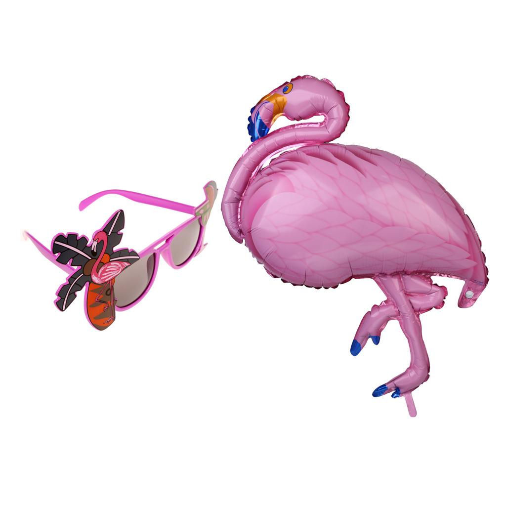Funny hawaiian tropical flamingo style sunglasses and large flamingo balloon set.