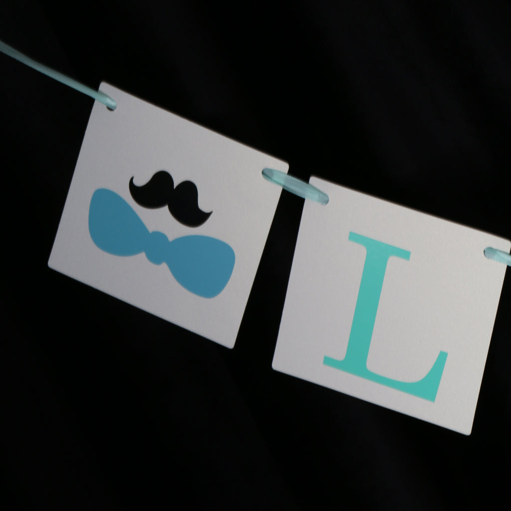 • White backing, Blue lettering, Mustache with ribbon