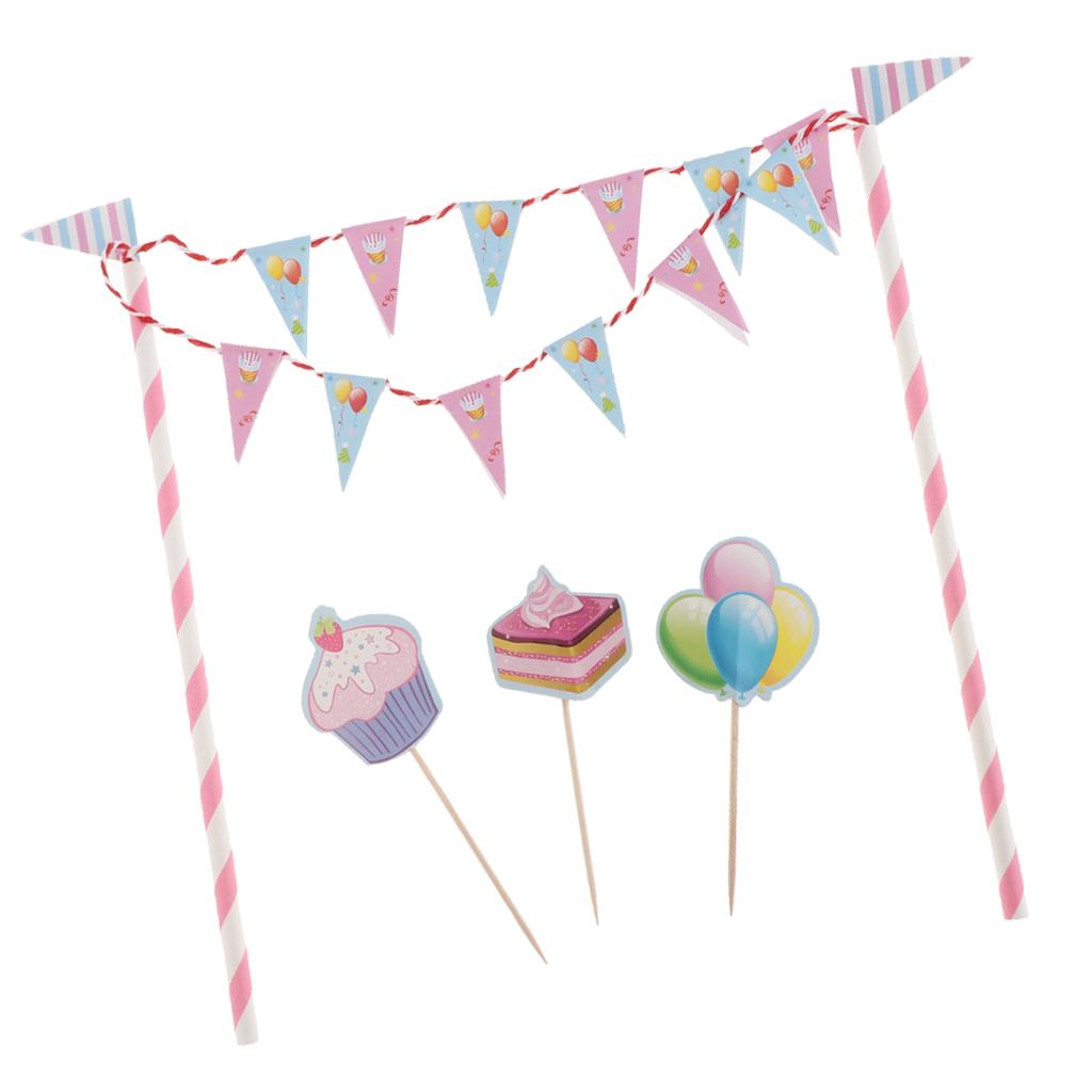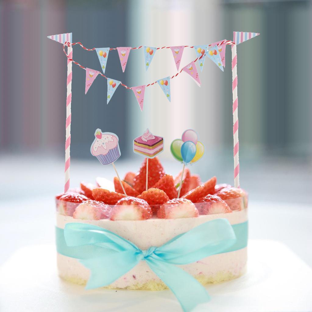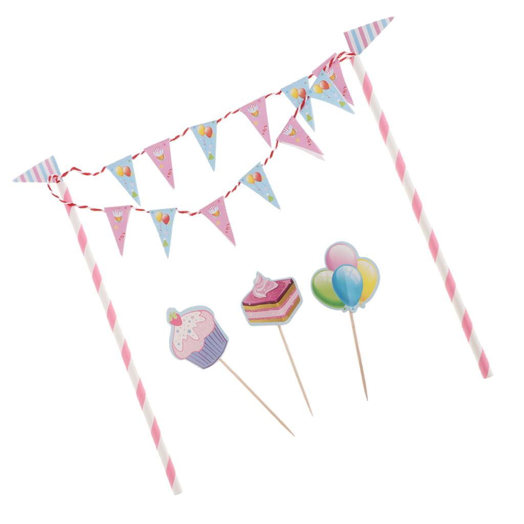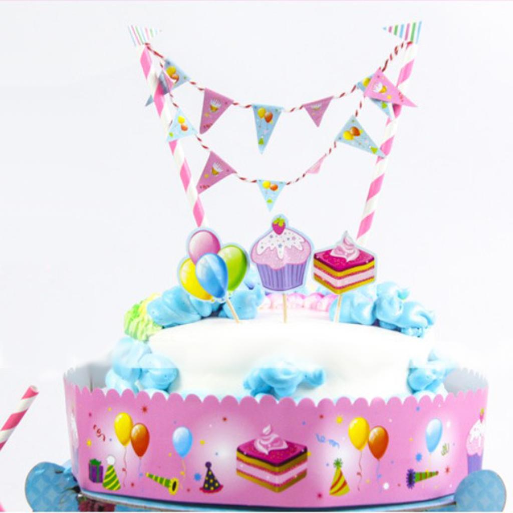 This is a set of cake decoration, which includes 1 piece cake banner, 4 pieces cupcake toothpicks and 1 pieces cake wrapper.