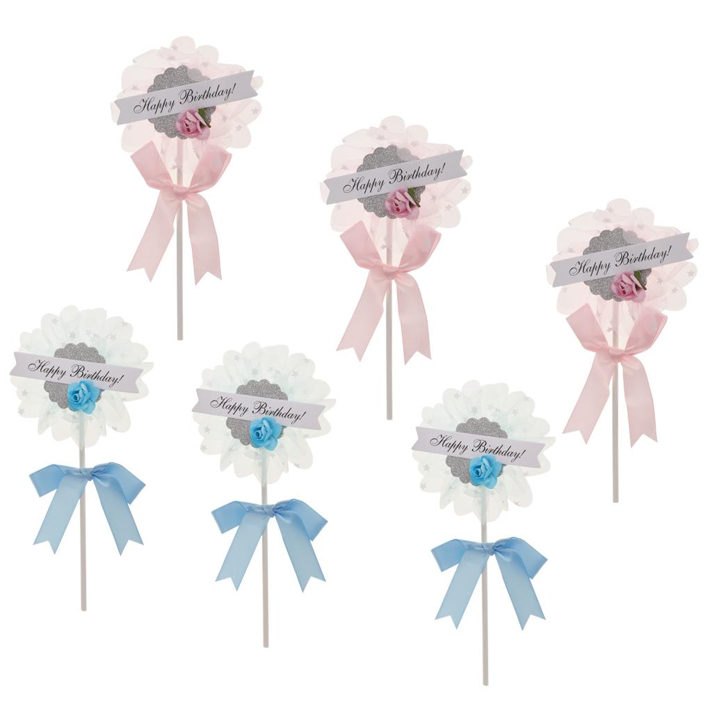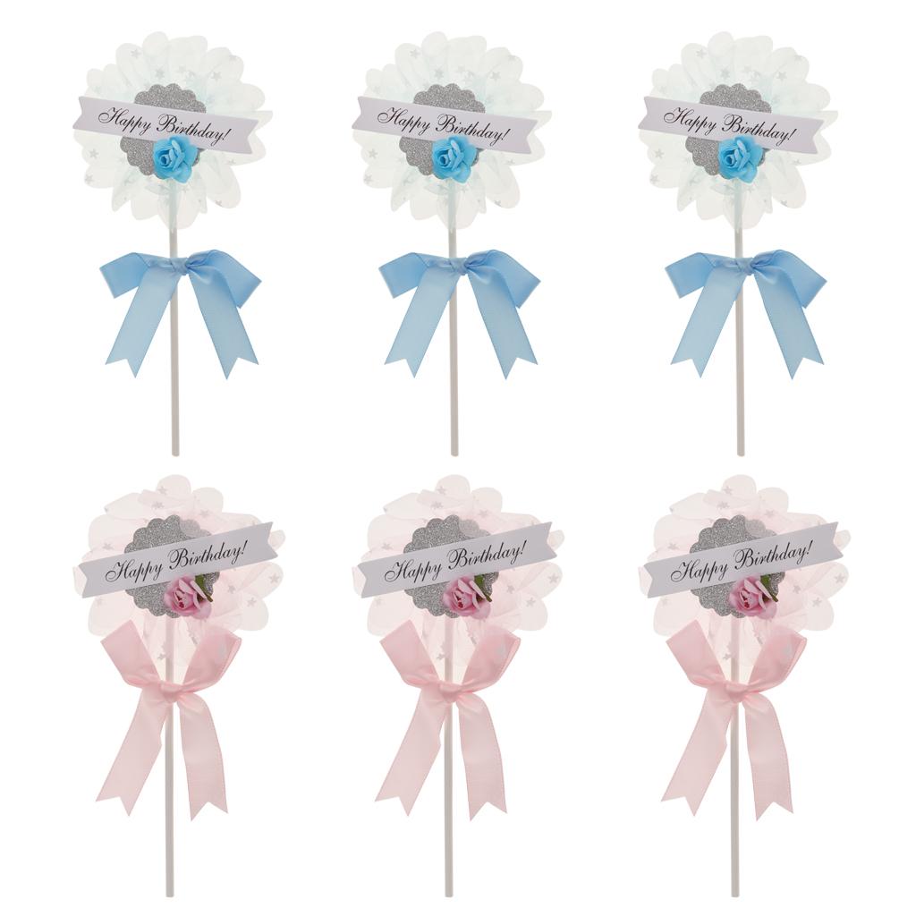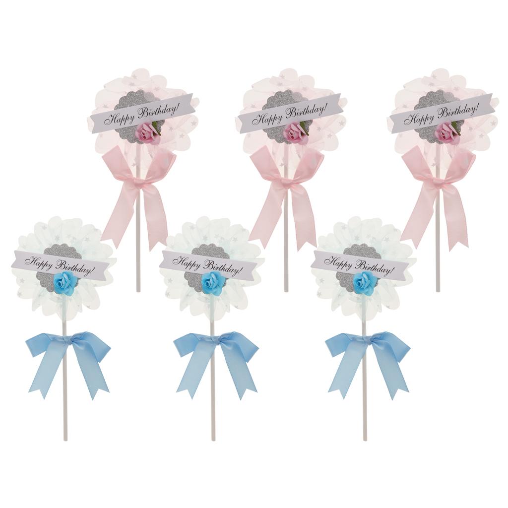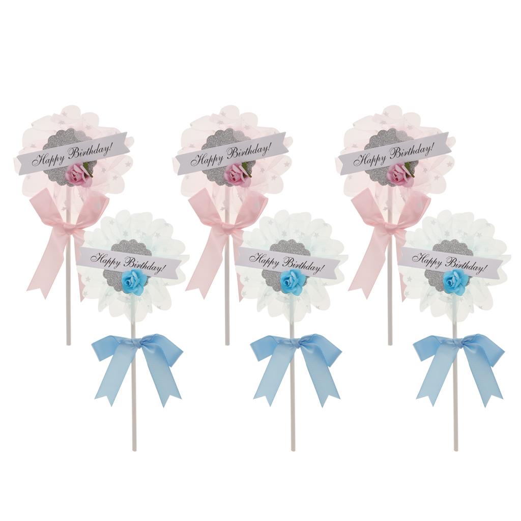 Pack of 6 Tulle Flower Happy Birthday Cake Toppers with Bowknot Decor Pink and Blue