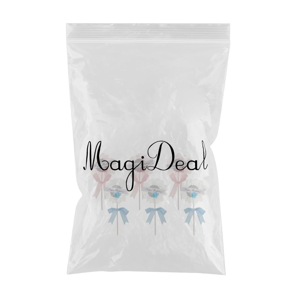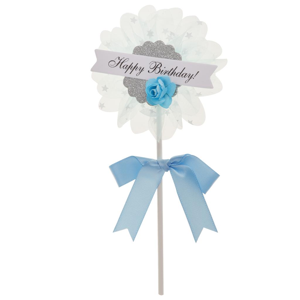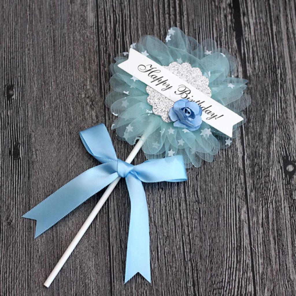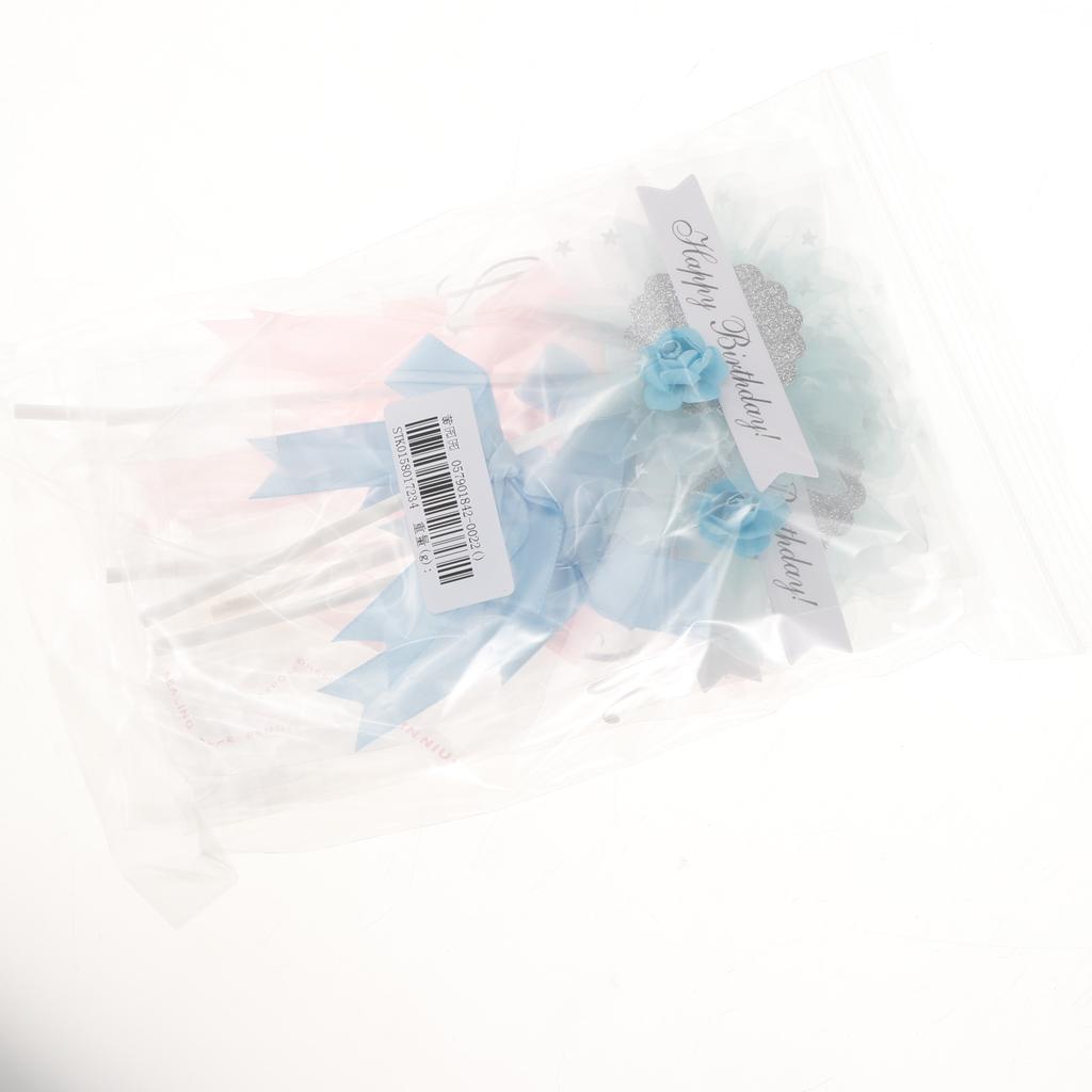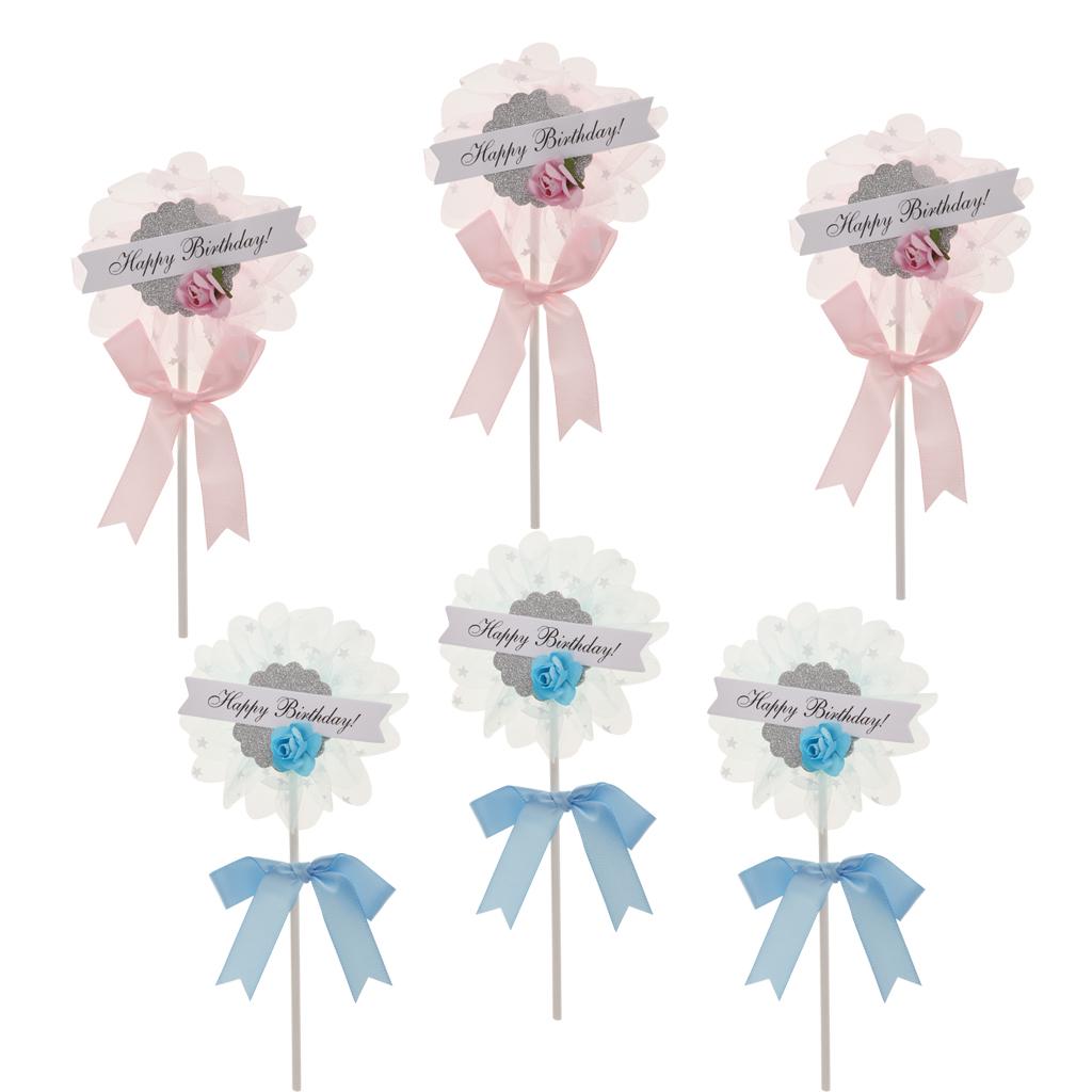 Pack of 6 Tulle Flower Happy Birthday Cake Toppers with Bowknot Decor Pink and Blue