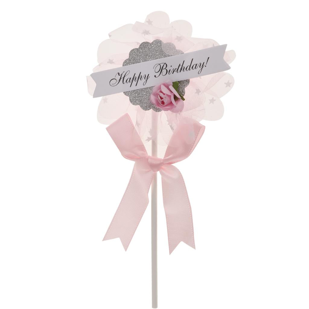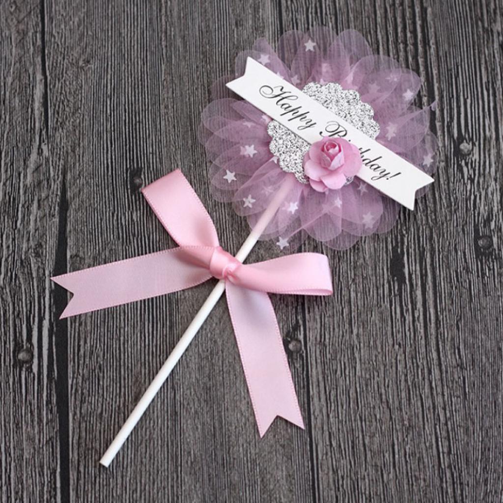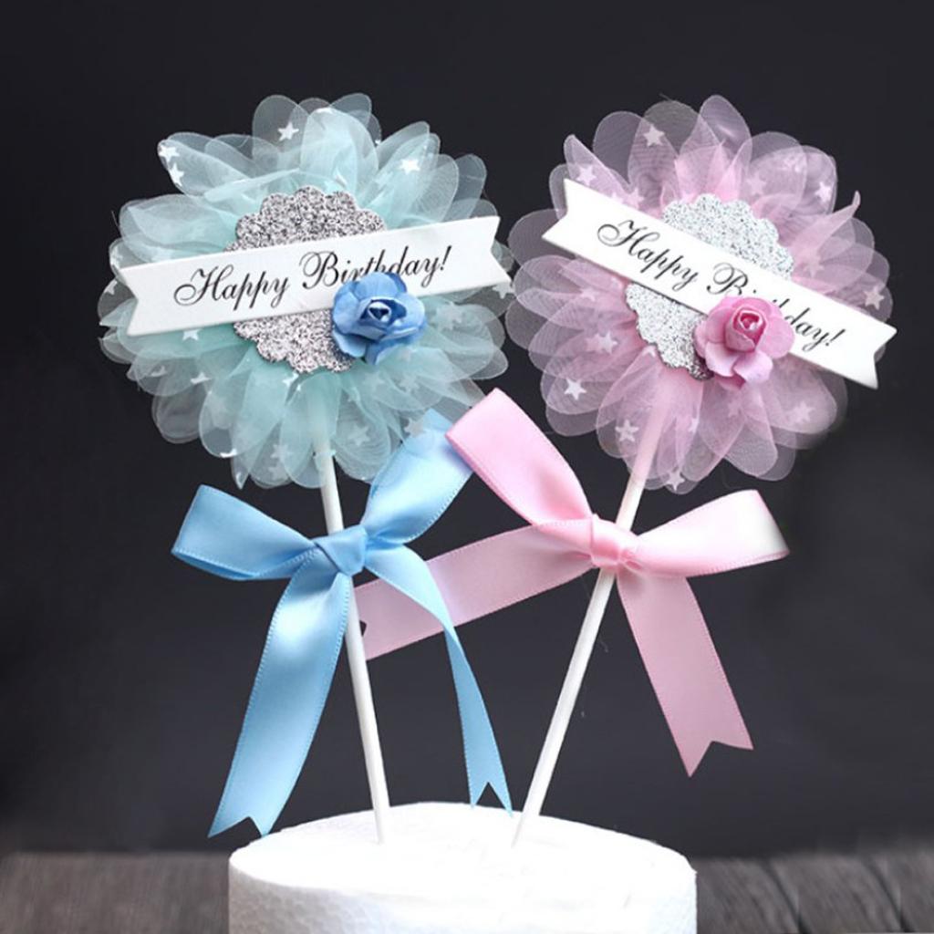 Lovely tulle flower design happy birthday cake topper, withbowknot ribbon ornament.