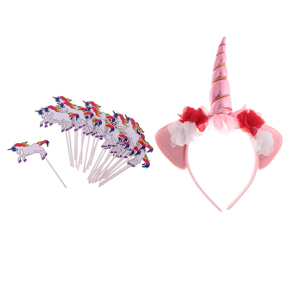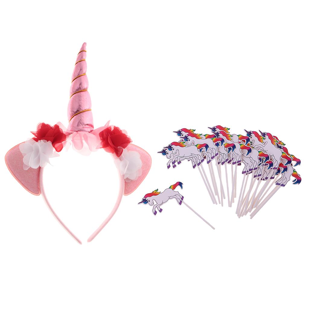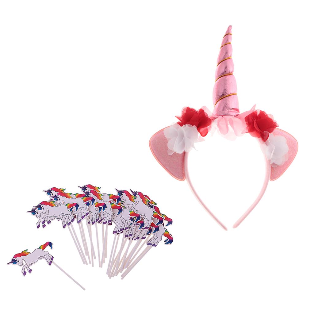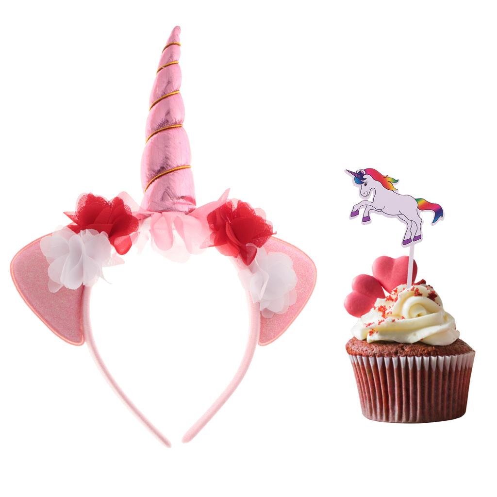 Unicorn Horn Headband with soft fabric wrapped band, golden unicorn horn / ears with tulle flower decoration,unicorn fairy rainbow cake toppers to decor your sweet dessert.