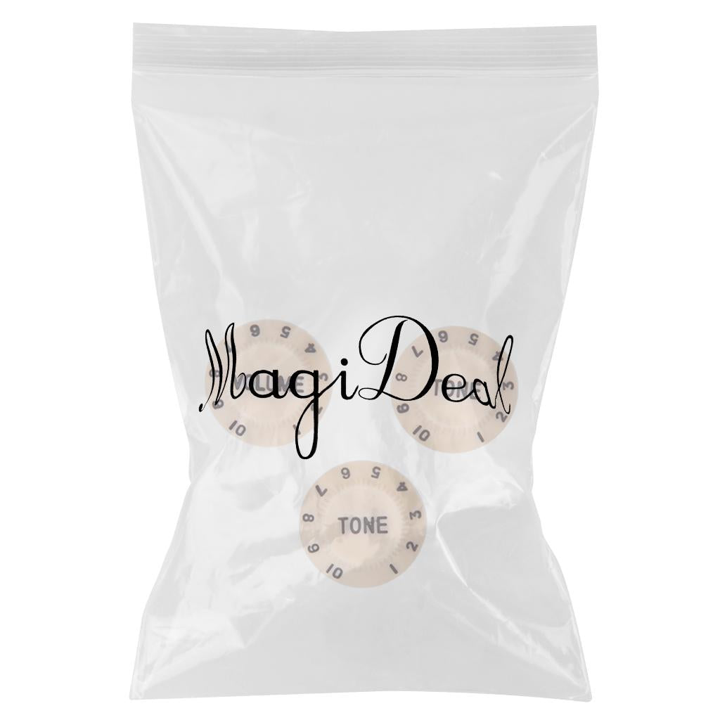 These volume tone control knobs with black Arabic numeral scale fit for Fender electric guitar. Vintage style with about 5.7mm knurled inner diameter. These knobs can replace your broken, dirty or old control knob. Sure to make your guitar look new again!