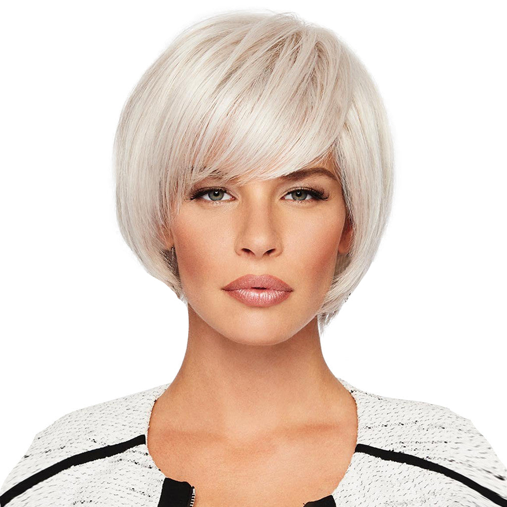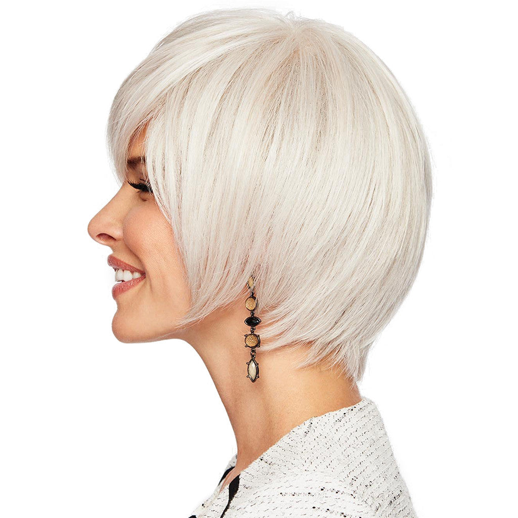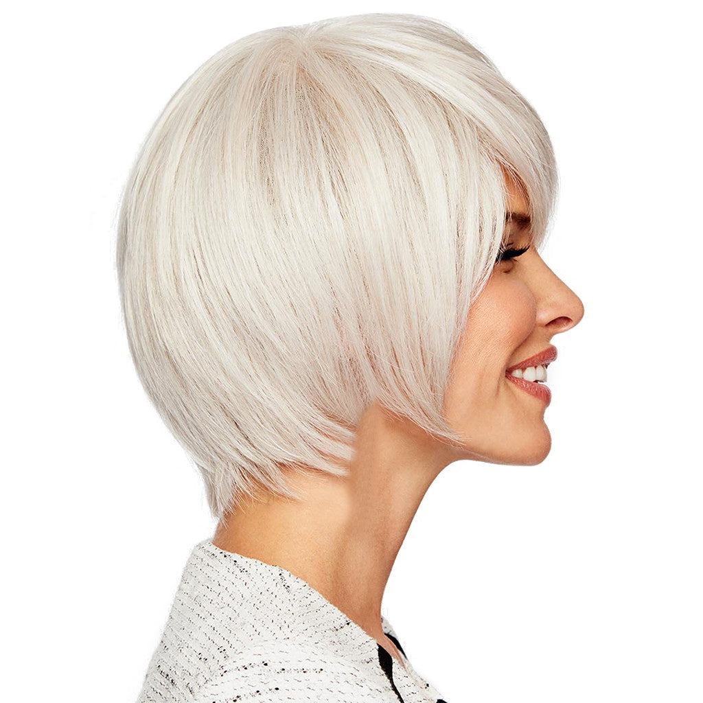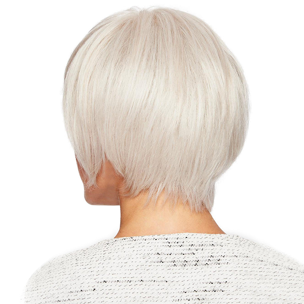 Made of mixed human hair, silver color, short layered style wig with oblique bangs.