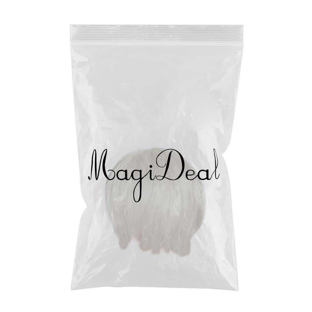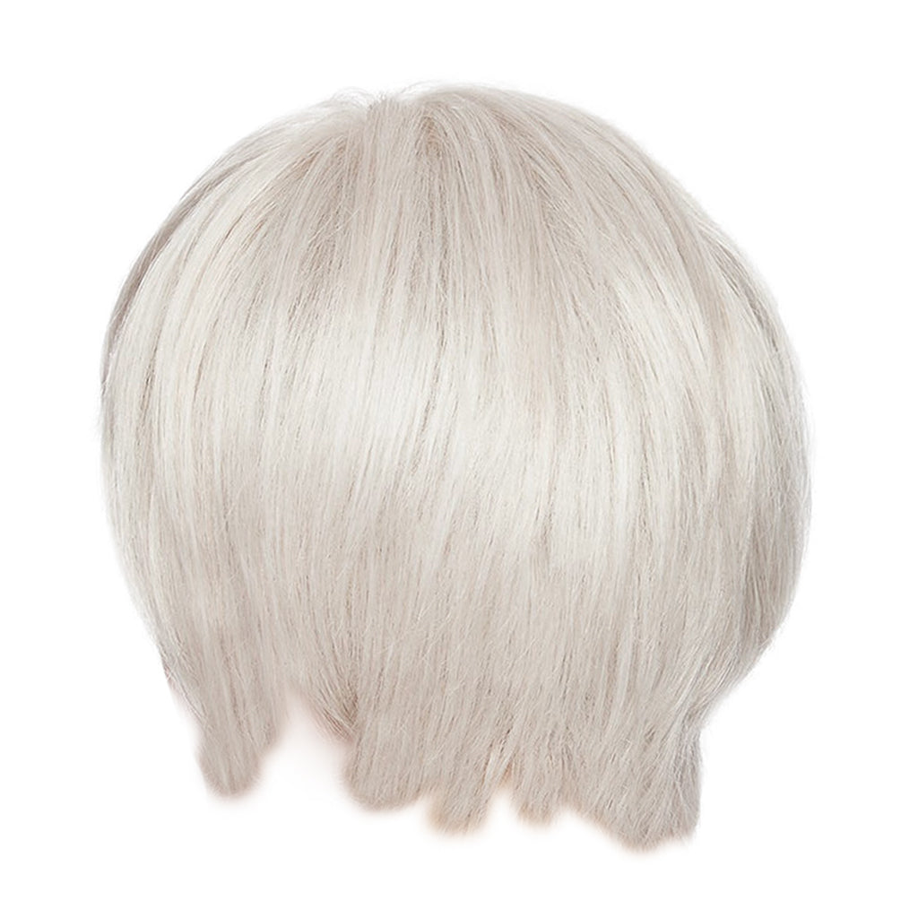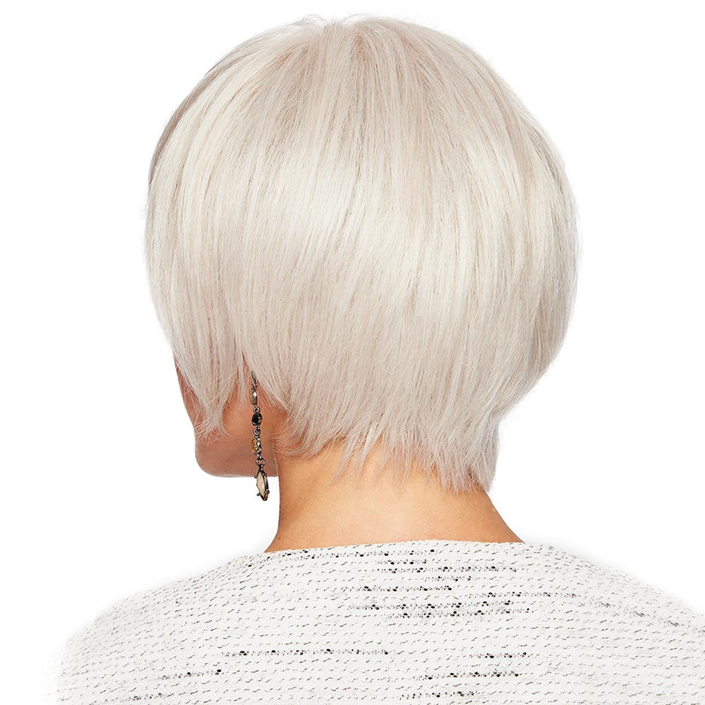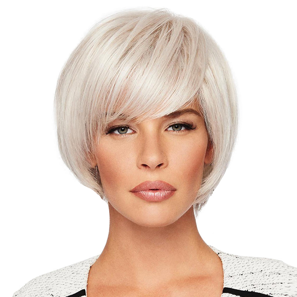 Made of mixed human hair, silver color, short layered style wig with oblique bangs.