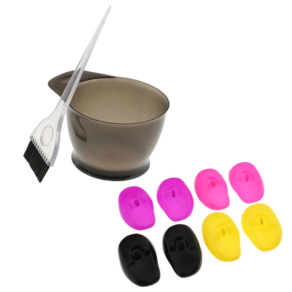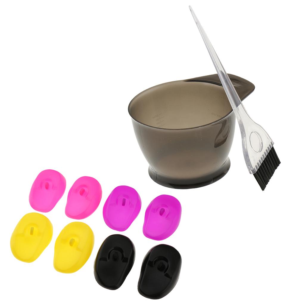 Hair color dye bowl with comb and brushes, complete kit for salon hair styling.
