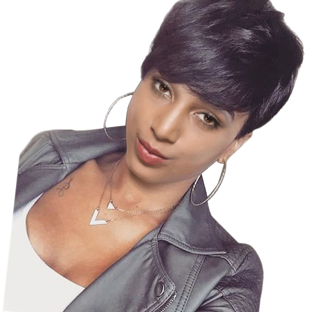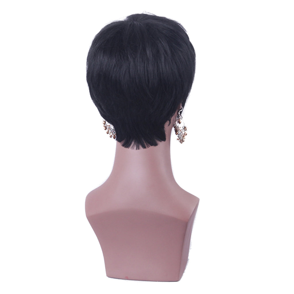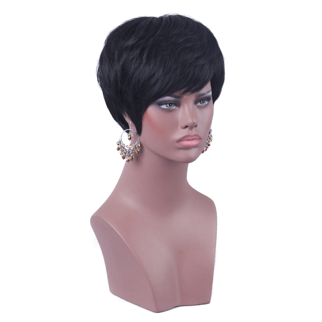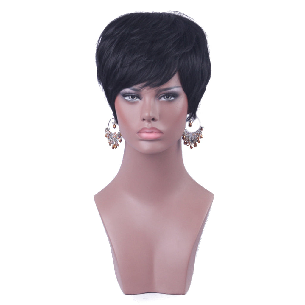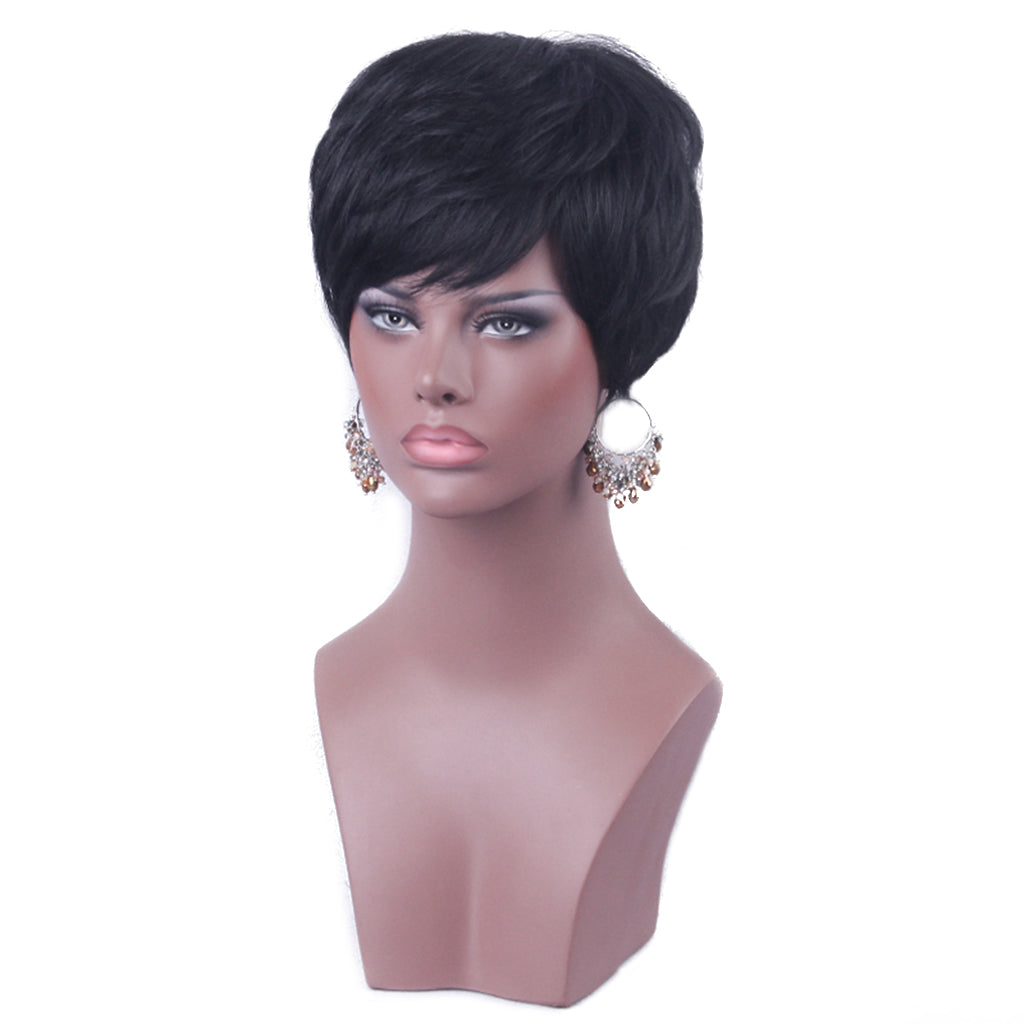 This full wig features real human hair, Short and Natural.
