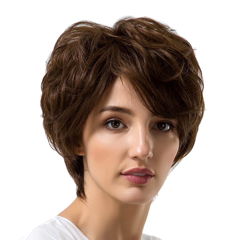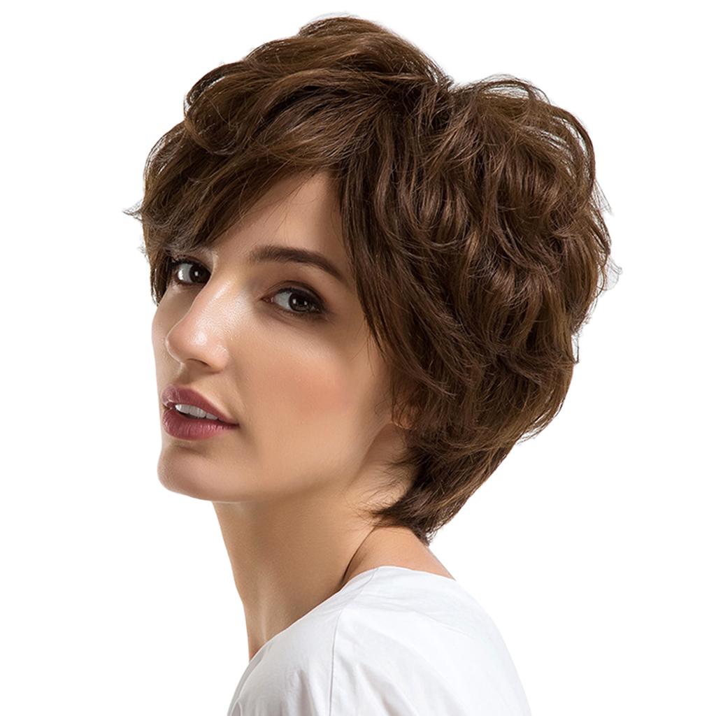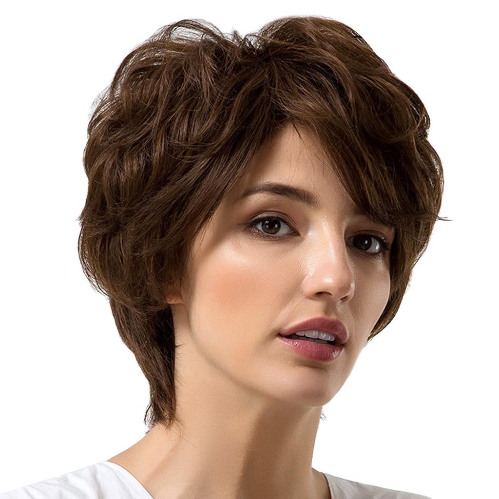 Women Trendy Short Curly Wig Natural Wave 100% Human Hair with Side Bangs Free Cap- Brown 10inches