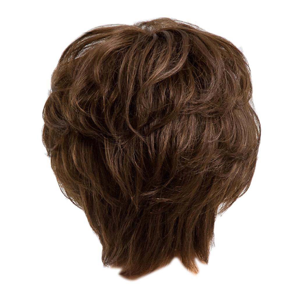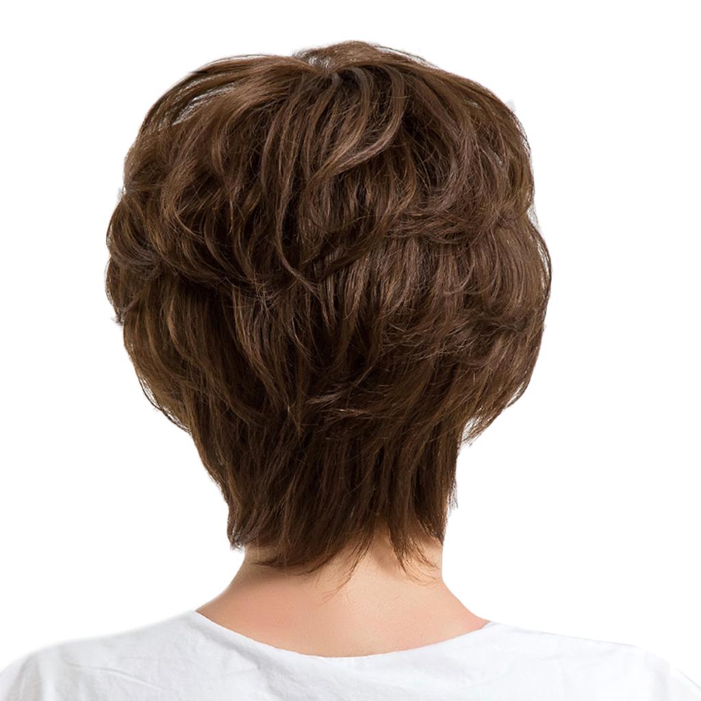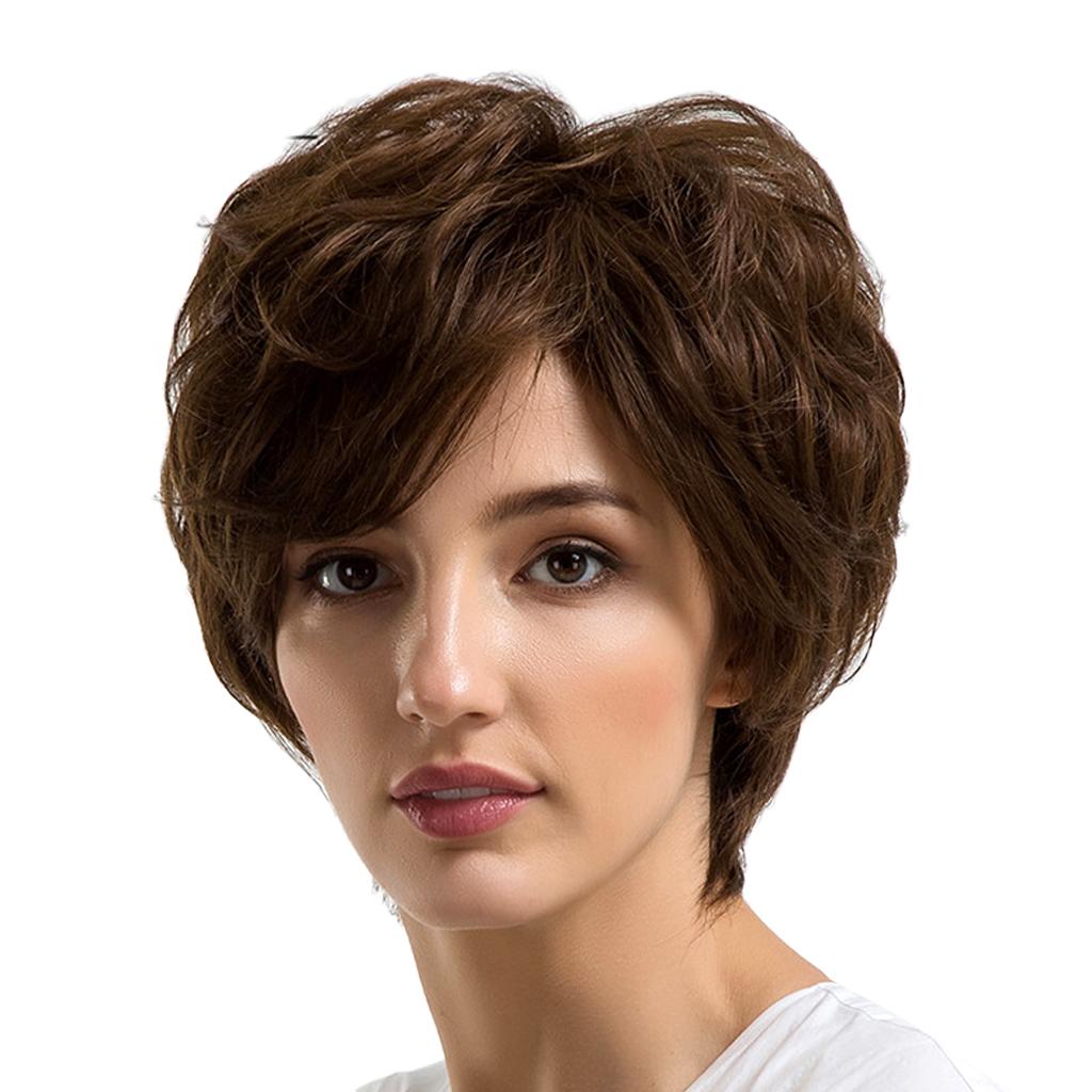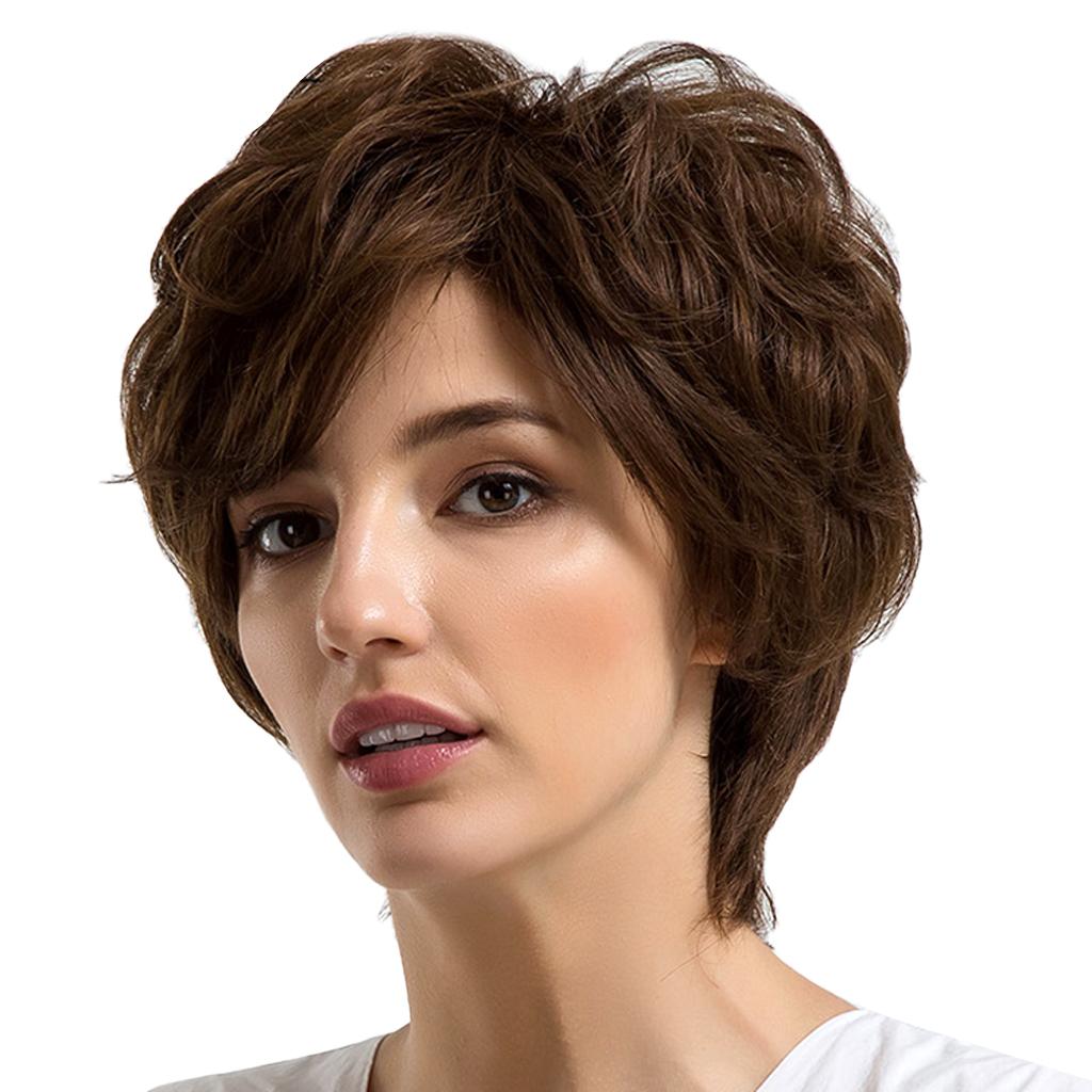 Women Trendy Short Curly Wig Natural Wave 100% Human Hair with Side Bangs Free Cap- Brown 10inches