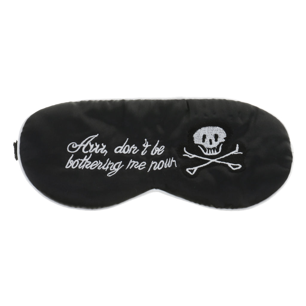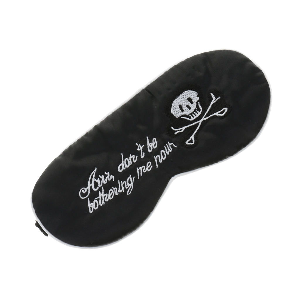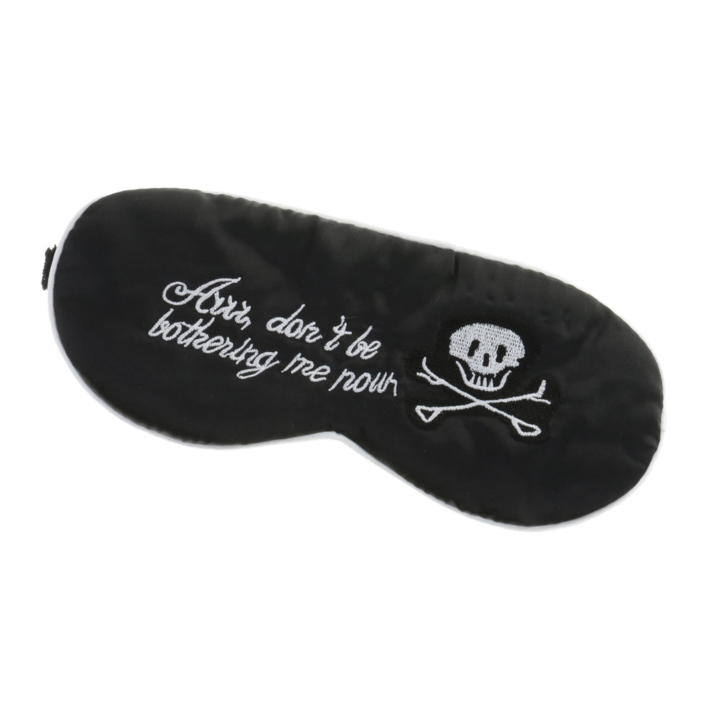 A cool sleep mask, black tone, embroidered with pirate's white skull and skeleton, with don't bothering me now slogan