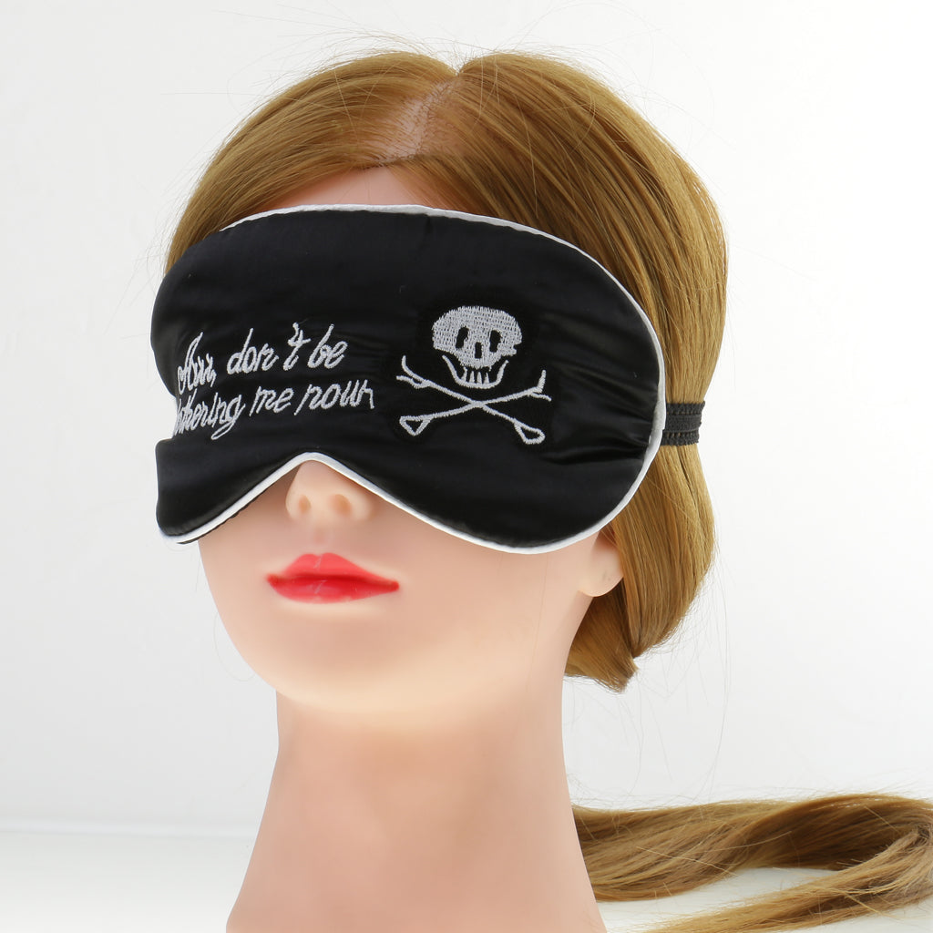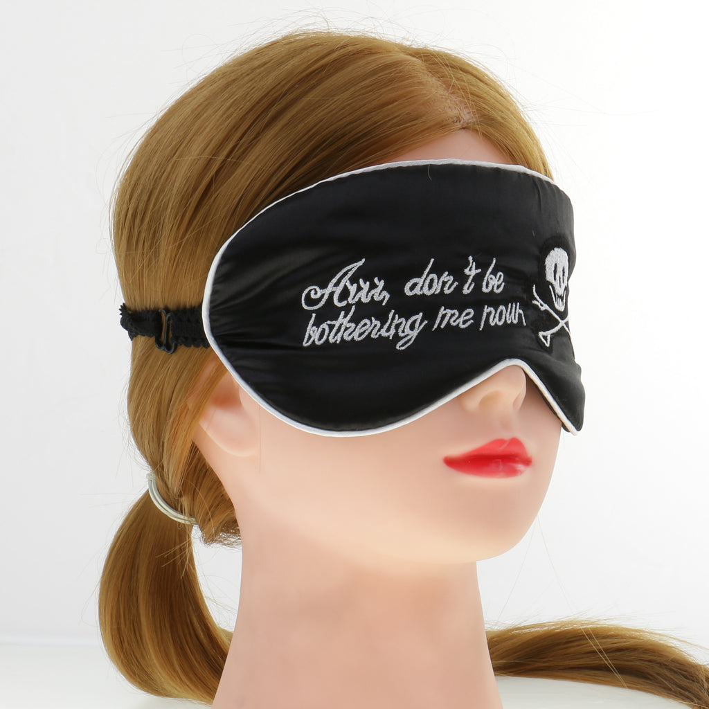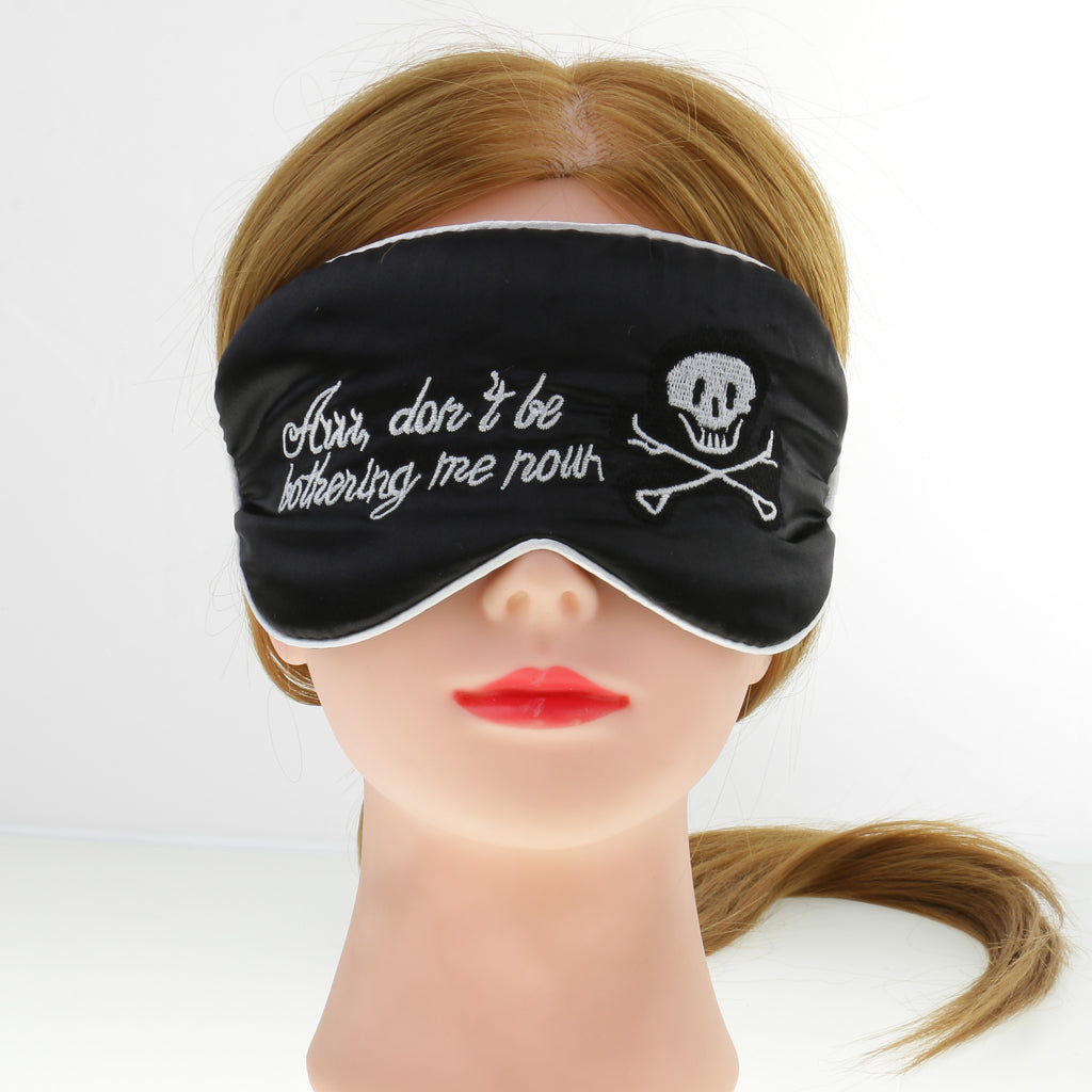 A cool sleep mask, black tone, embroidered with pirate's white skull and skeleton, with don't bothering me now slogan