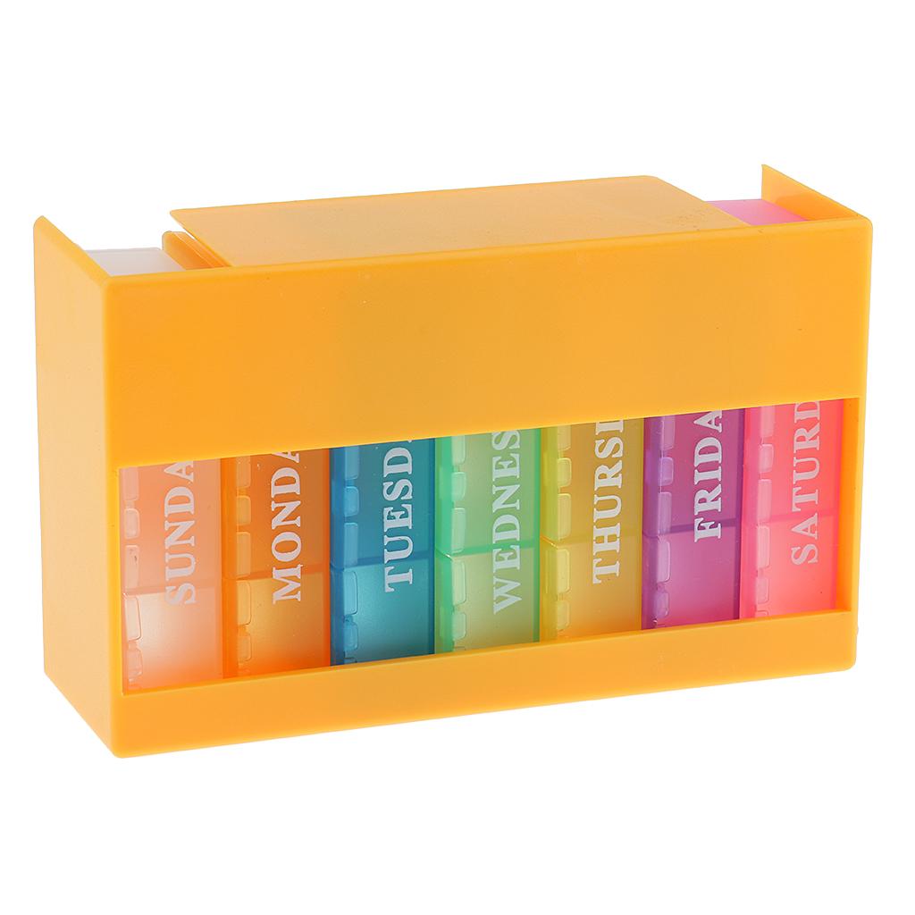 The organizer has 7 compartments and each compartment is color coded with the day printed on the outside, each day departs into 3 small slots for morning/midday/evening