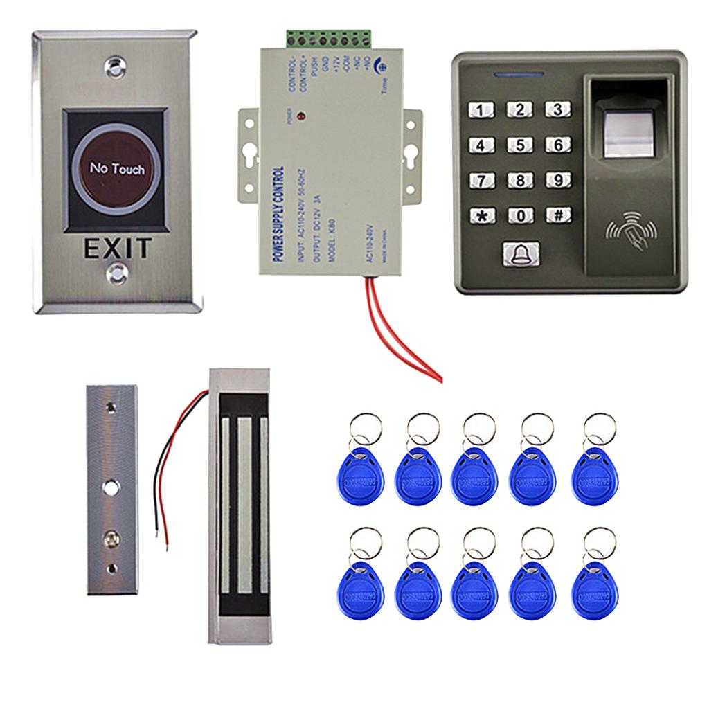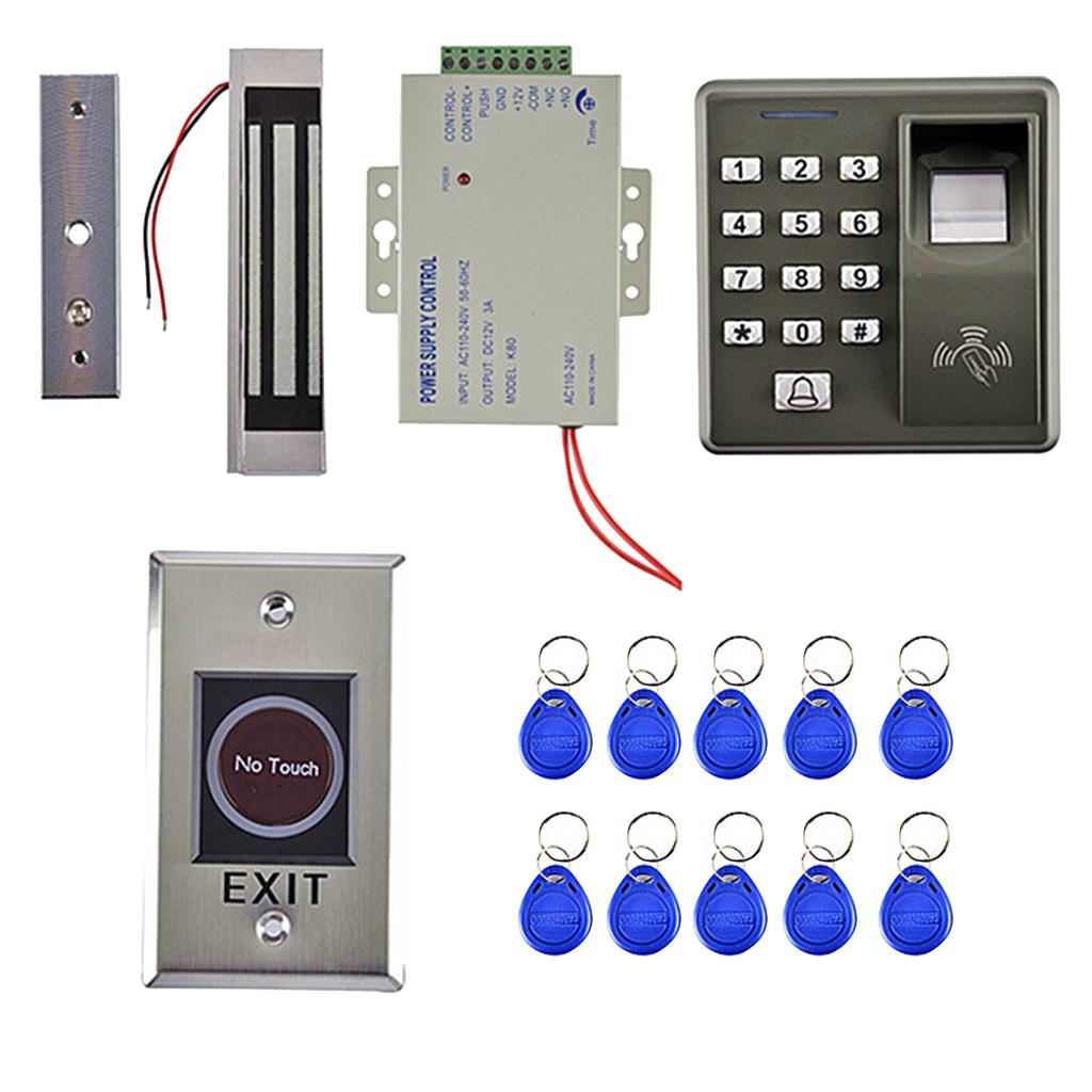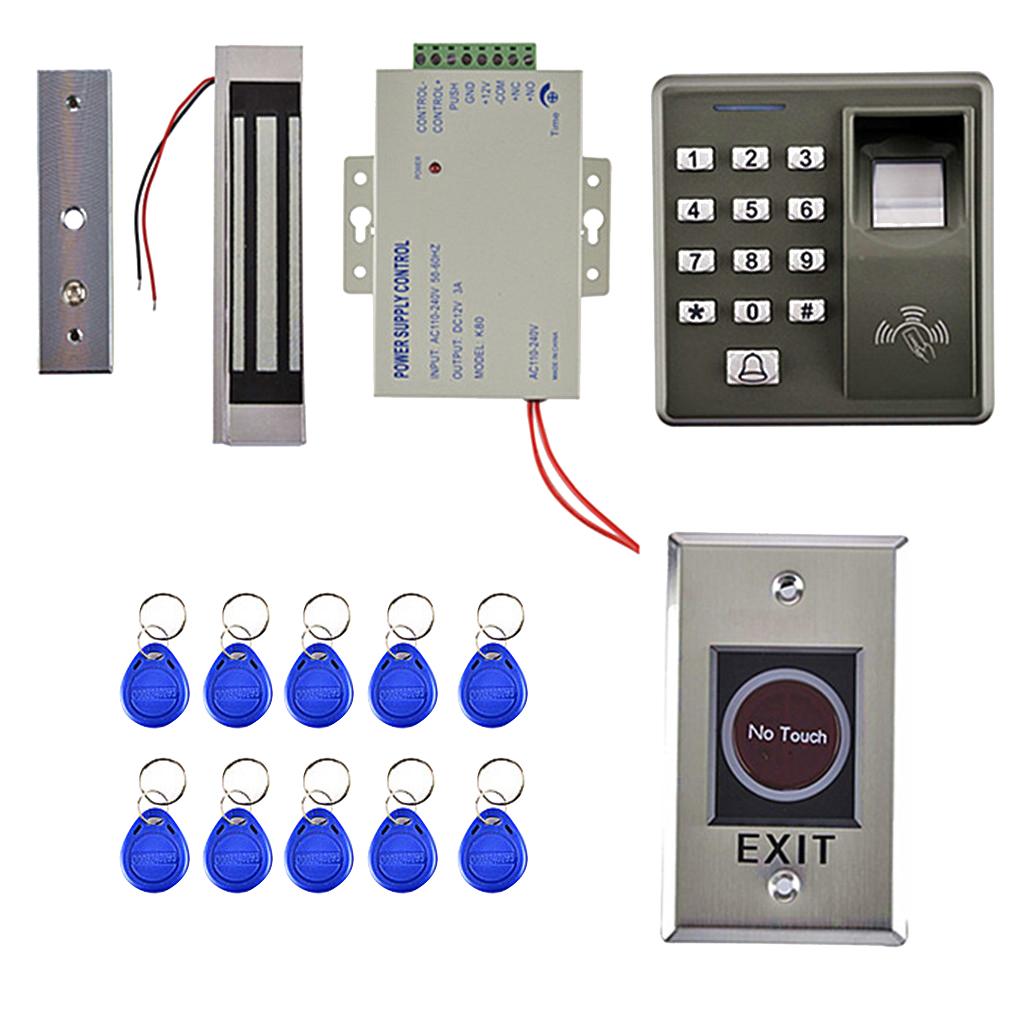 Complete access control system Kits Set, includes a Fingerprint RFID access control keypad, a power supply, an electric door lock, an exit button, a doorbell and 10 Pieces Keyfobs.