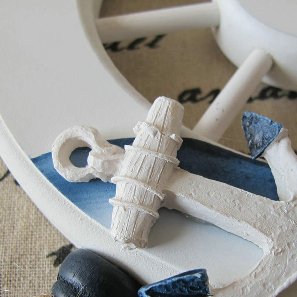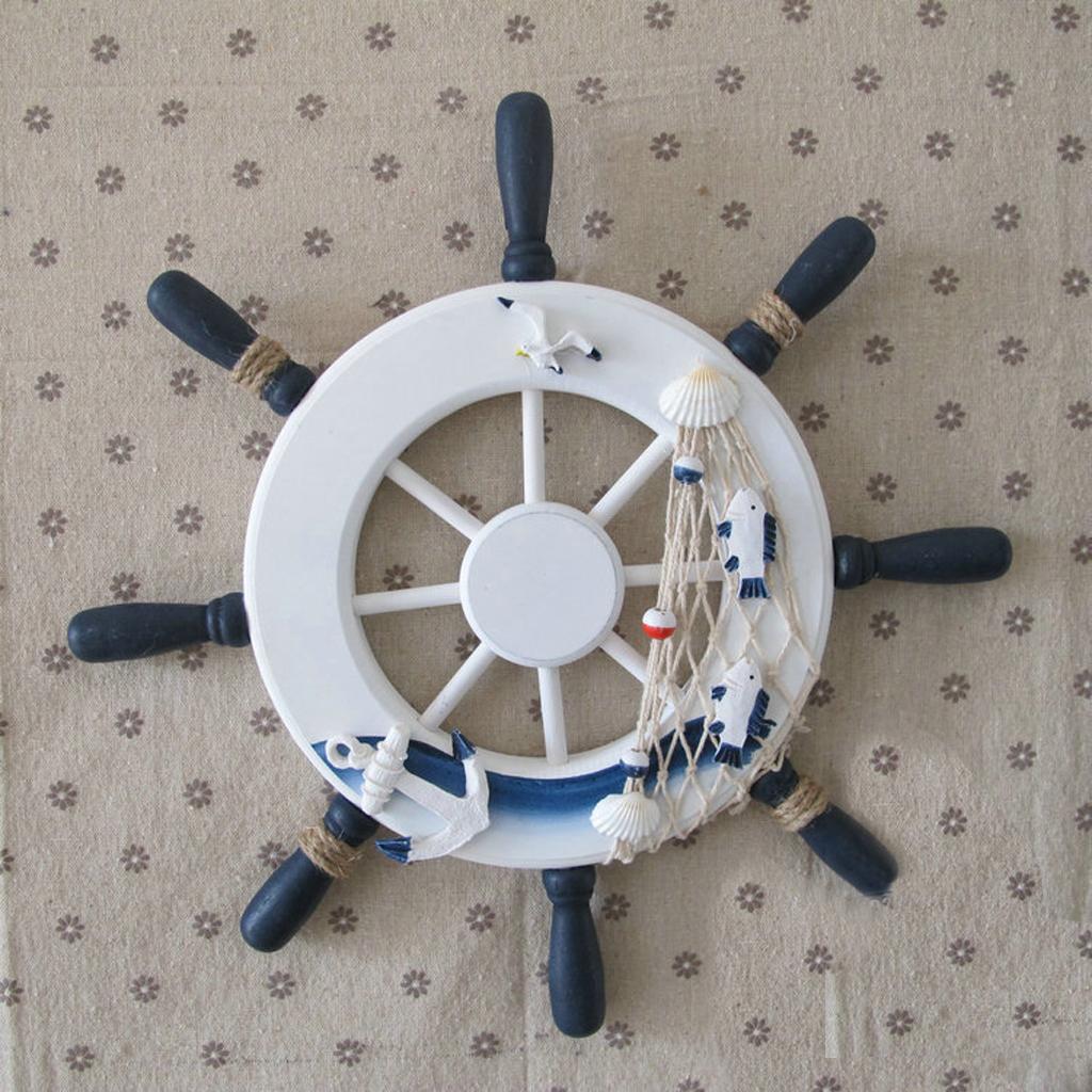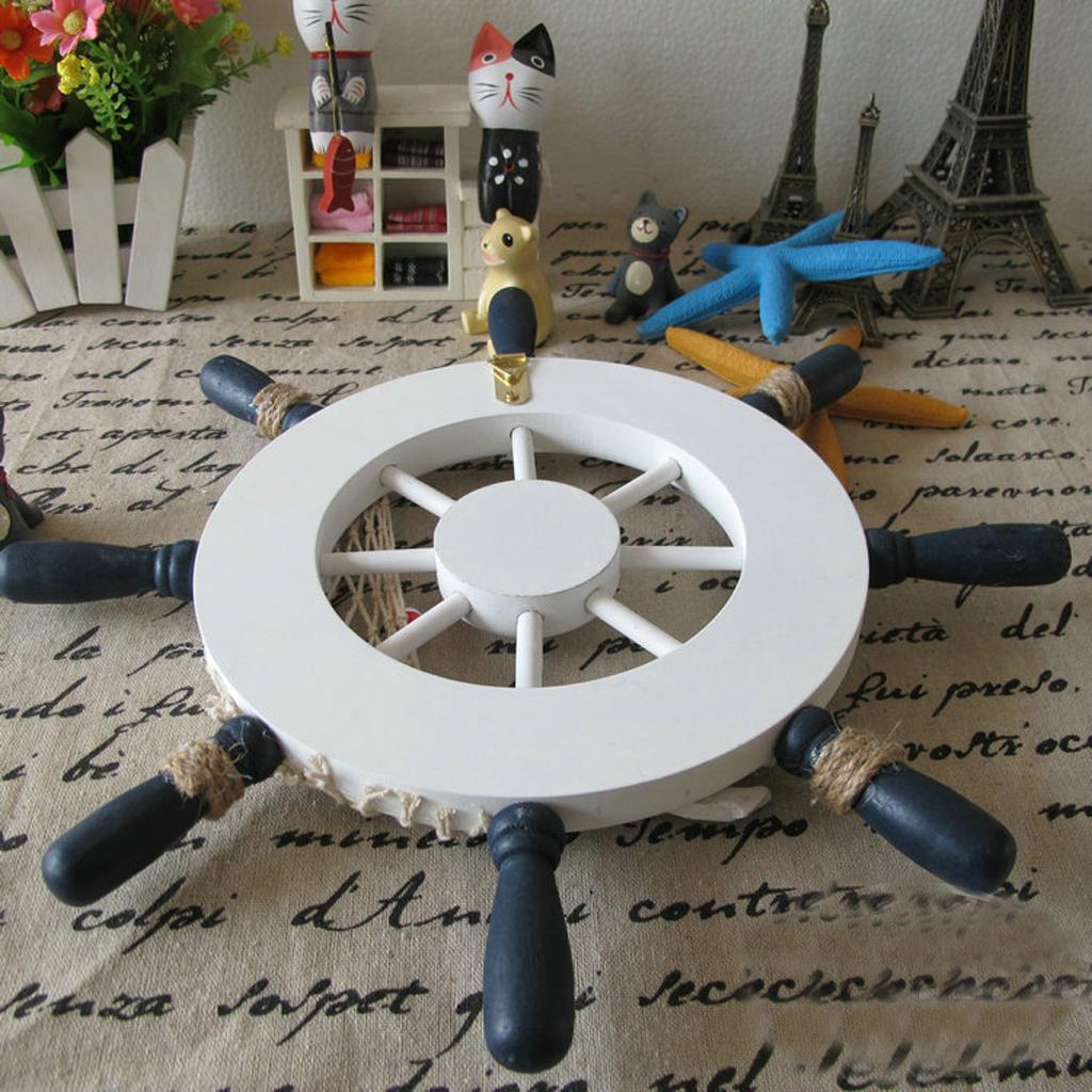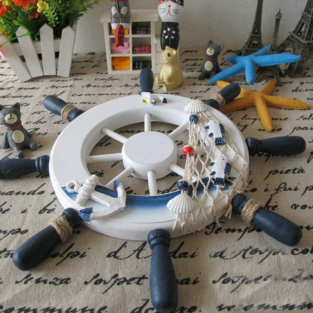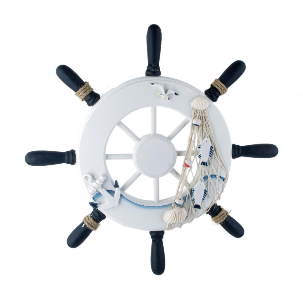 This wooden ship wheel with a fishing net, some shells and rope on it make itthe perfect nautical wall hanging decor to accent your home. Ideal for those wholove sailing and nautical wall art, this beach decor will leave your guests inawe. This steering wheel has eight spokes painted light blue and white,surrounding it and is easily mountable to a wall in need of a beach decoration.
