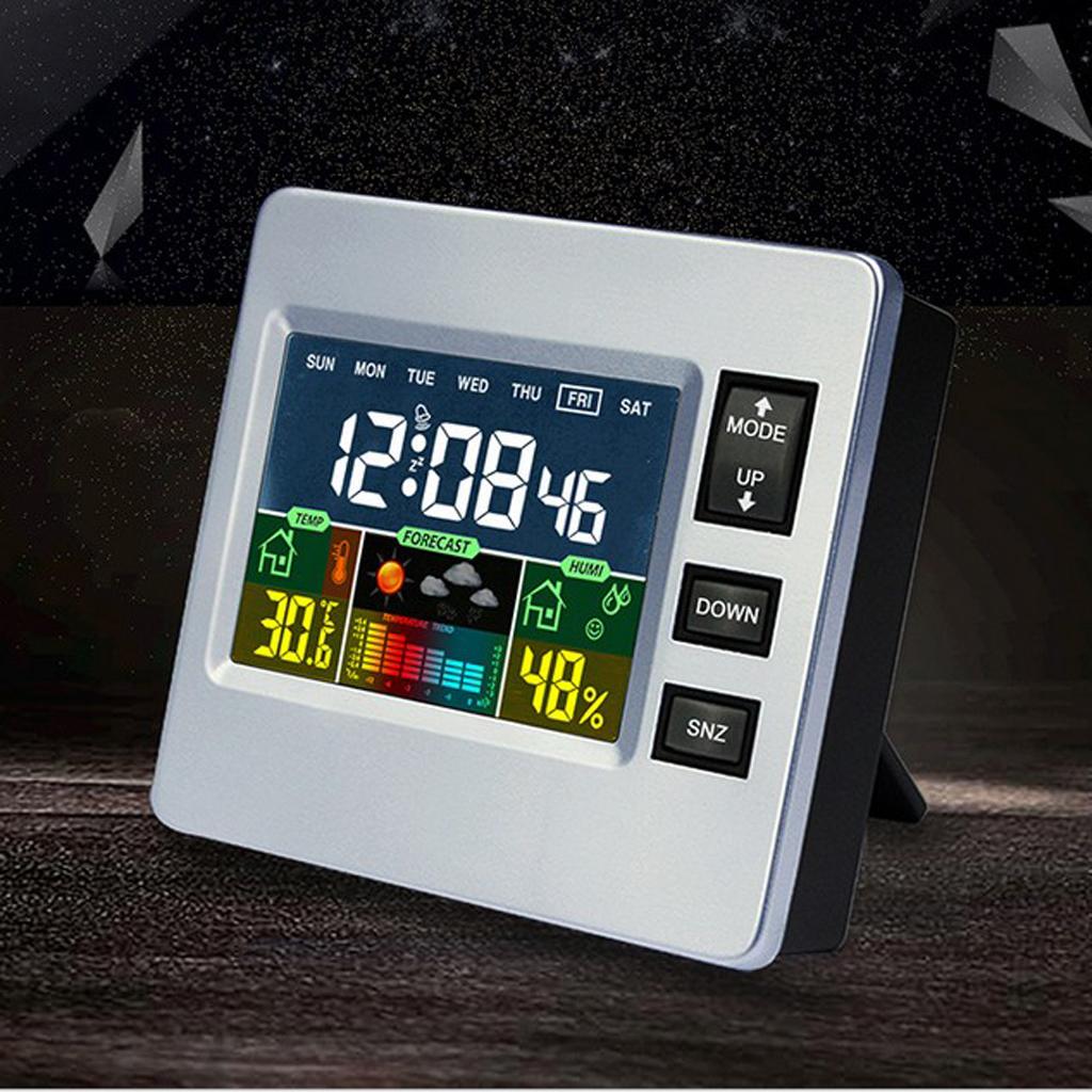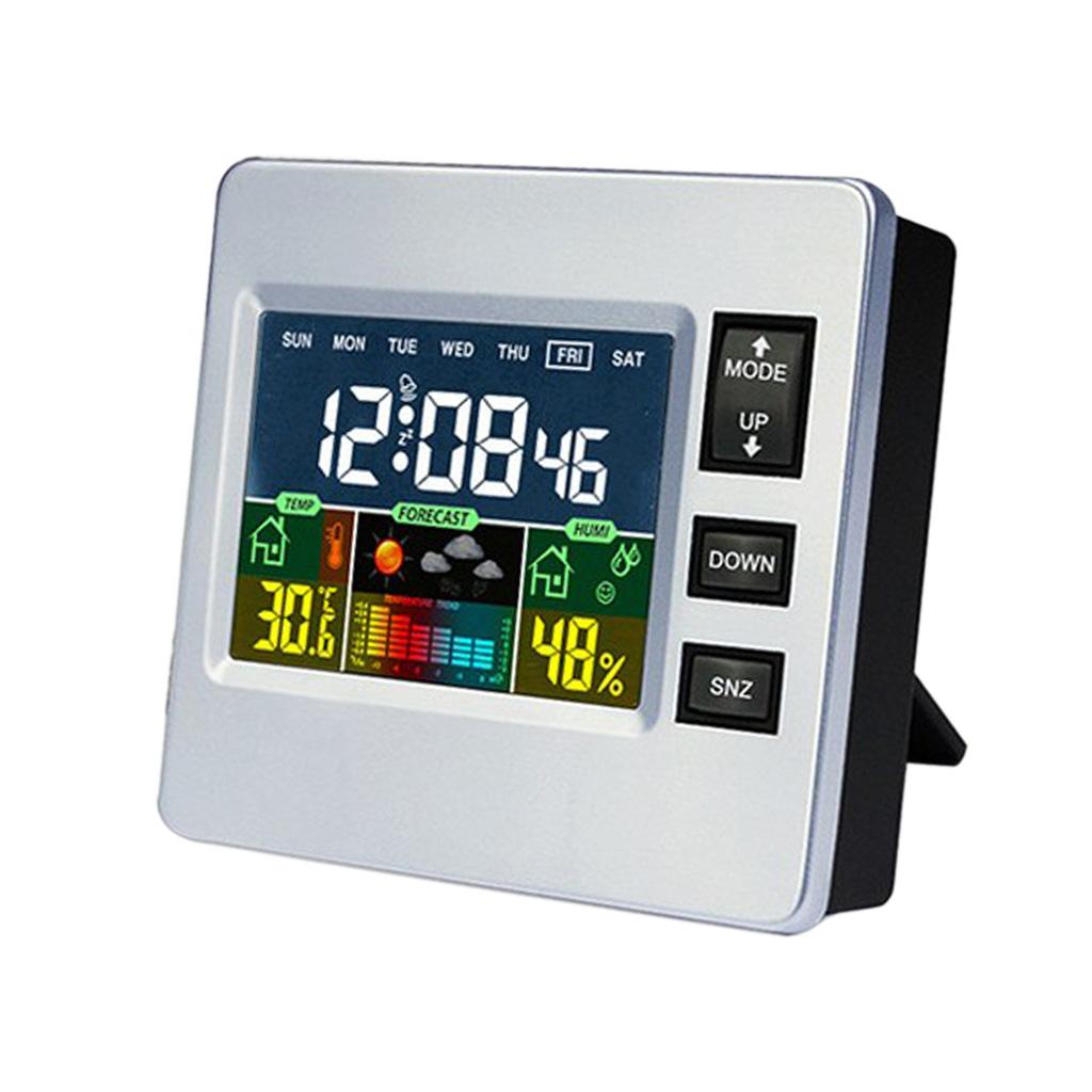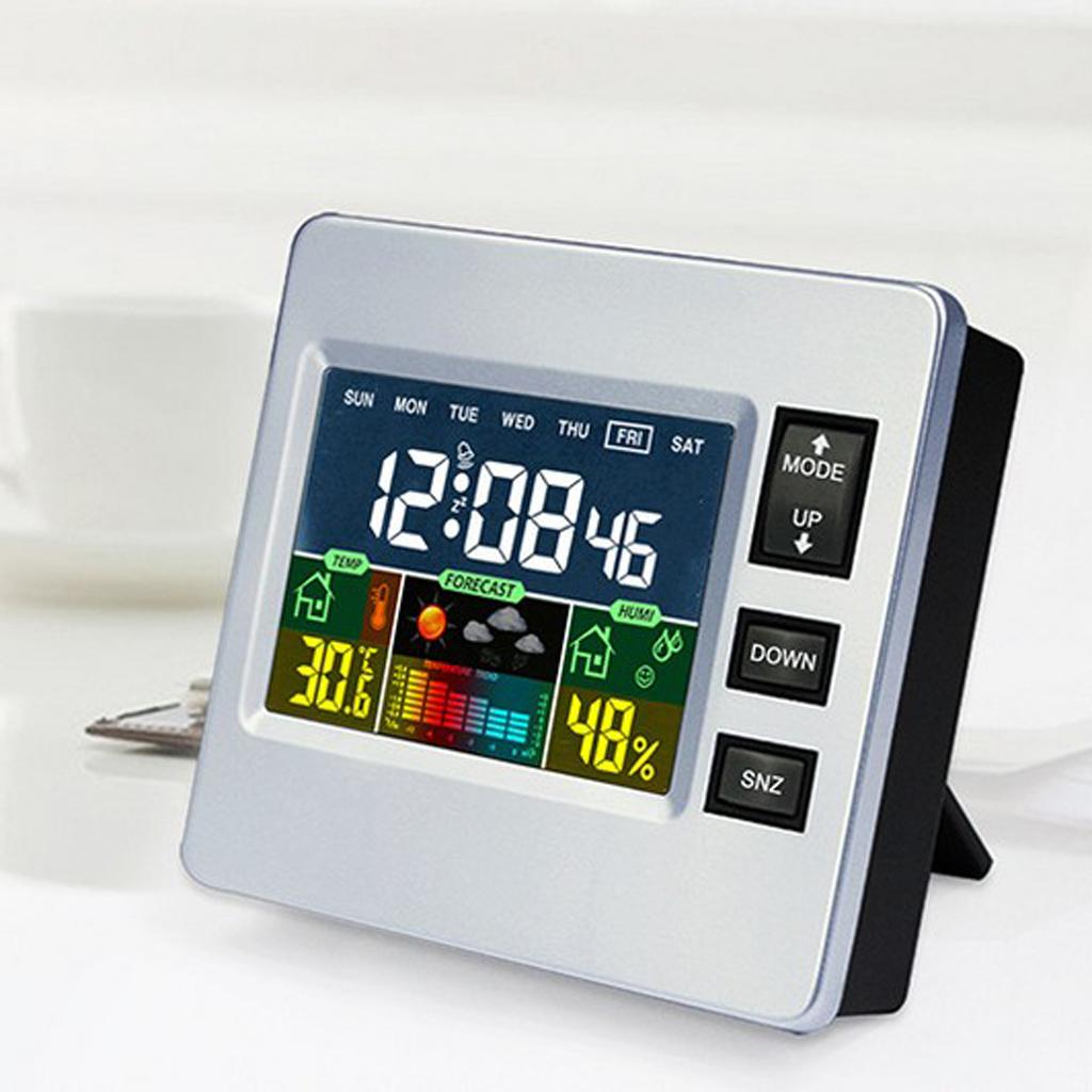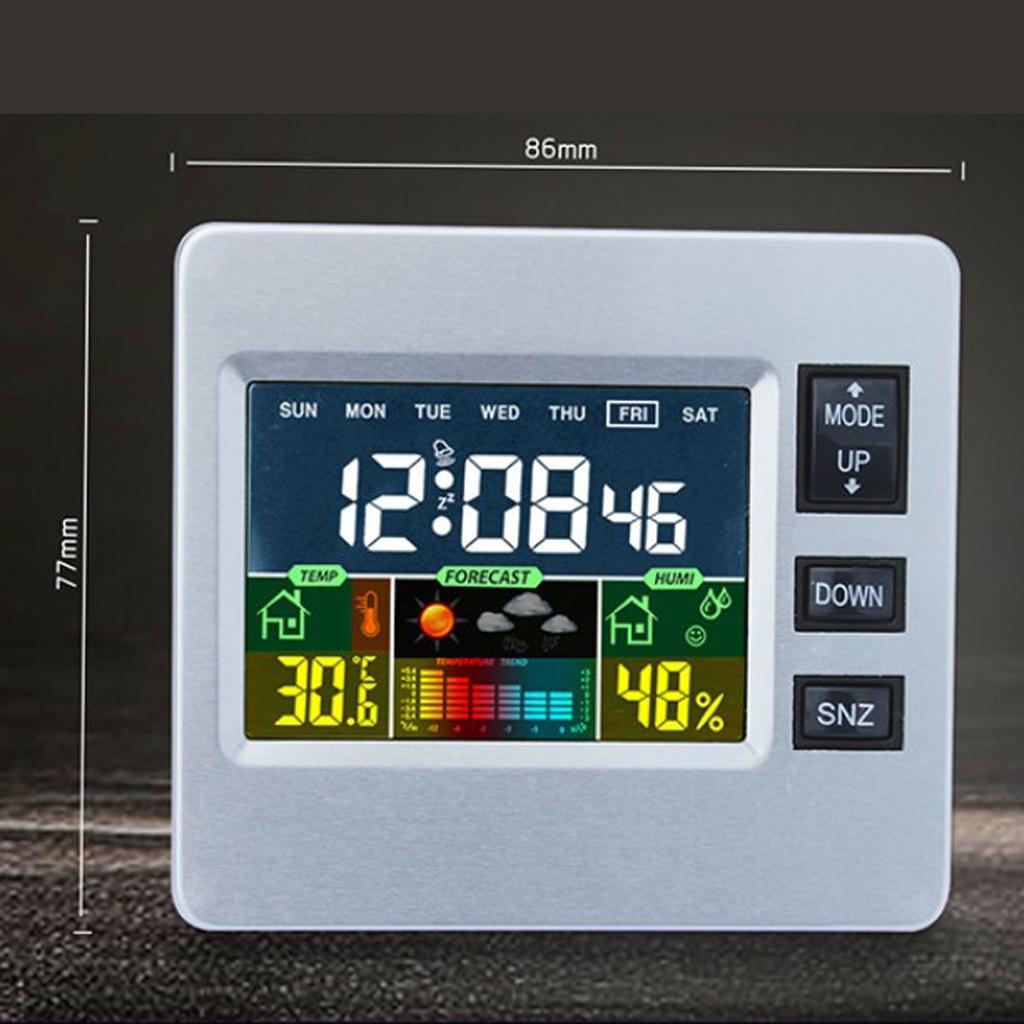 Multi multifunctional hygrothermograph clock, with a colorful LCD displays a wide range of information, including time (12 / 24-hour), date, temperature (°C / °F) and humidity, weather trend icon. It also a alarm clock, has alarm and snooze function.