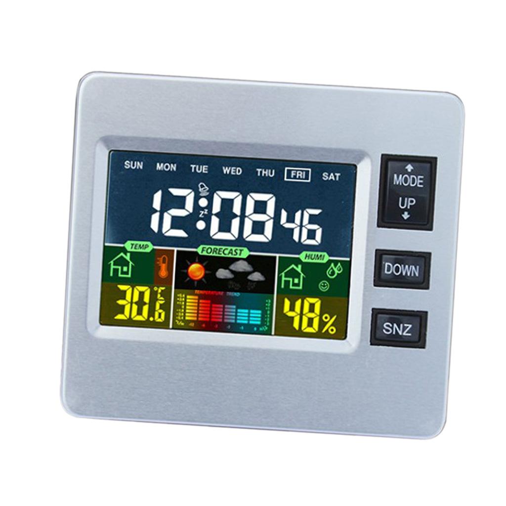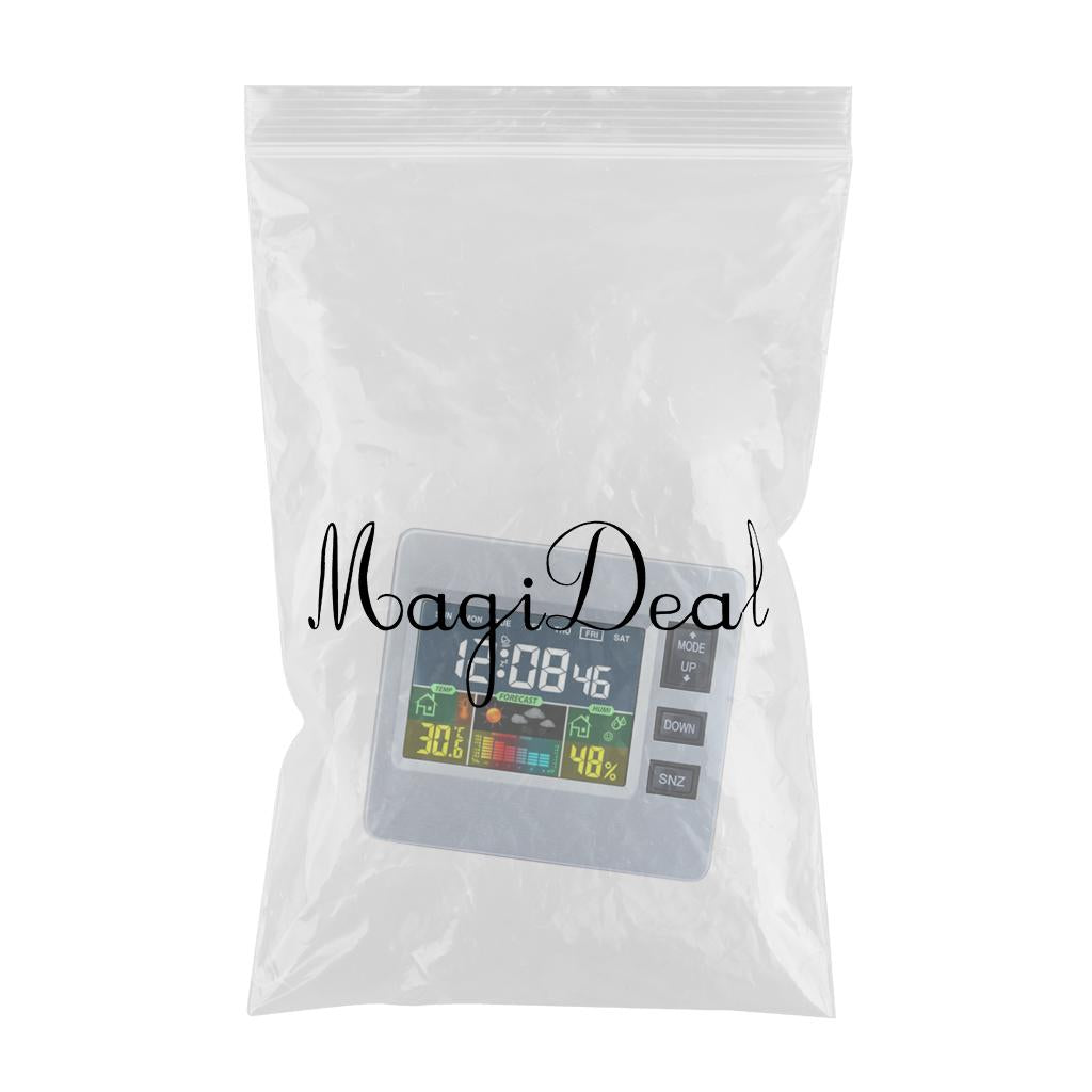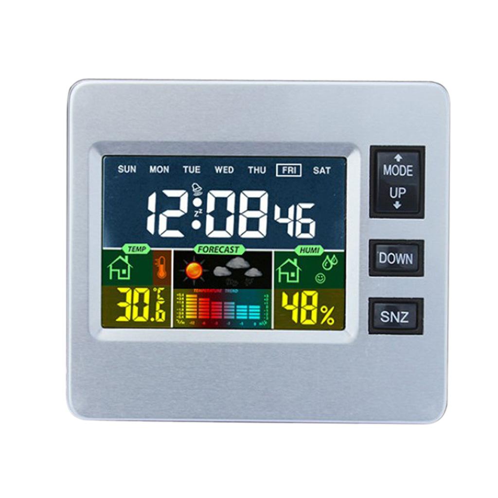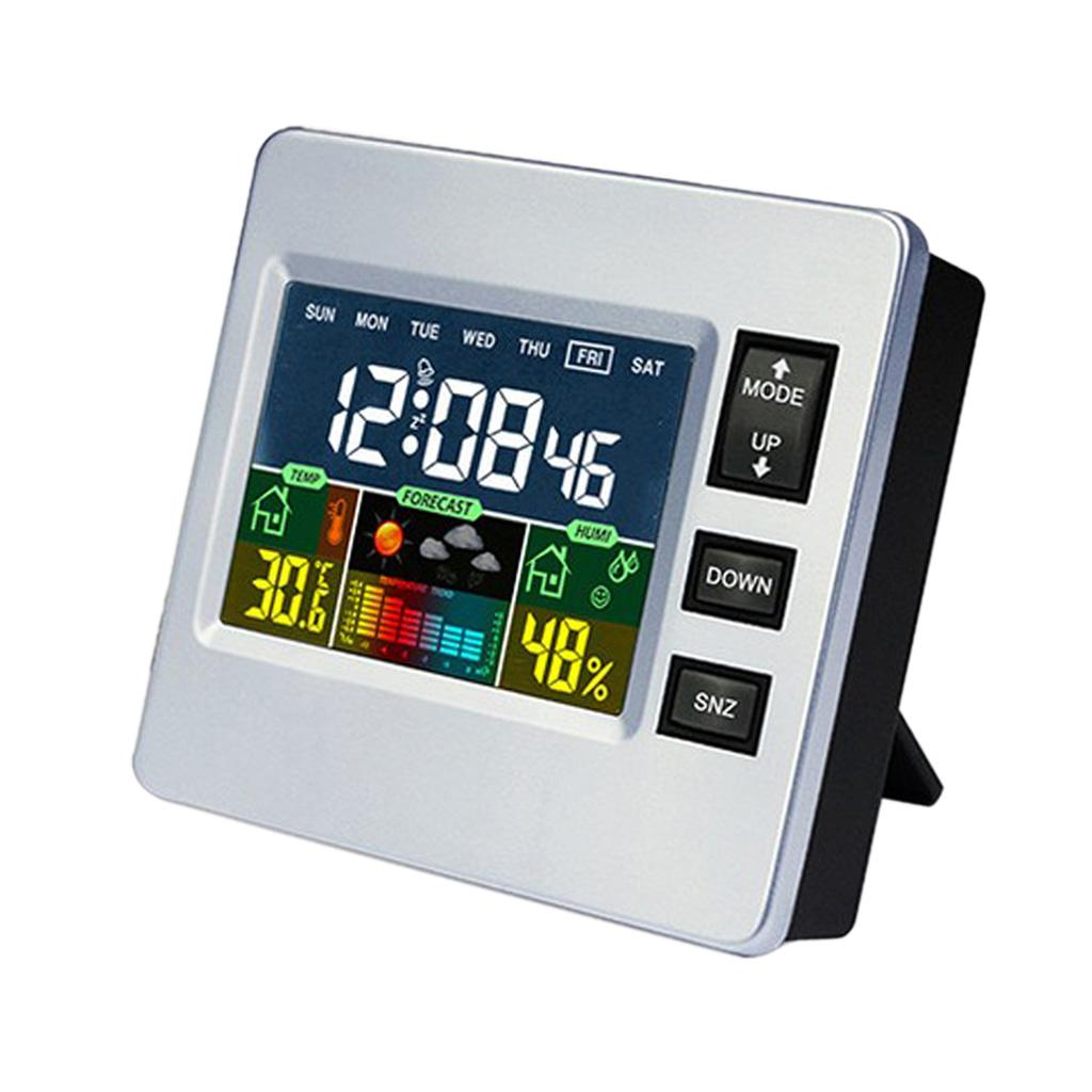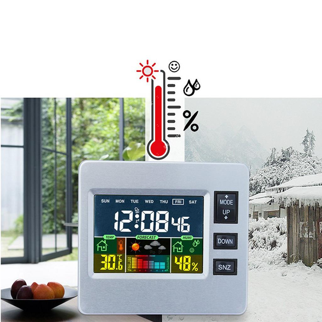 Multi multifunctional hygrothermograph clock, with a colorful LCD displays a wide range of information, including time (12 / 24-hour), date, temperature (°C / °F) and humidity, weather trend icon. It also a alarm clock, has alarm and snooze function.