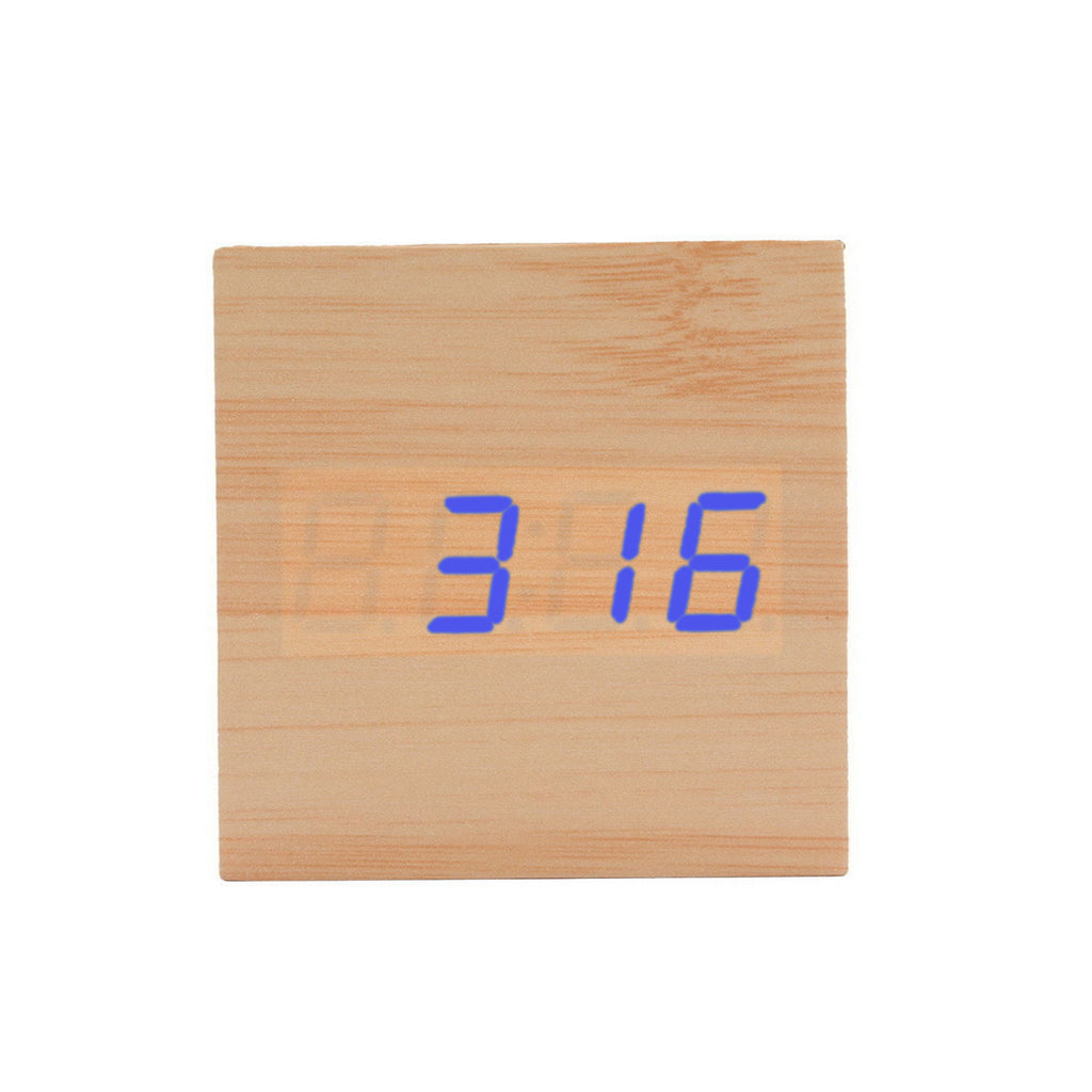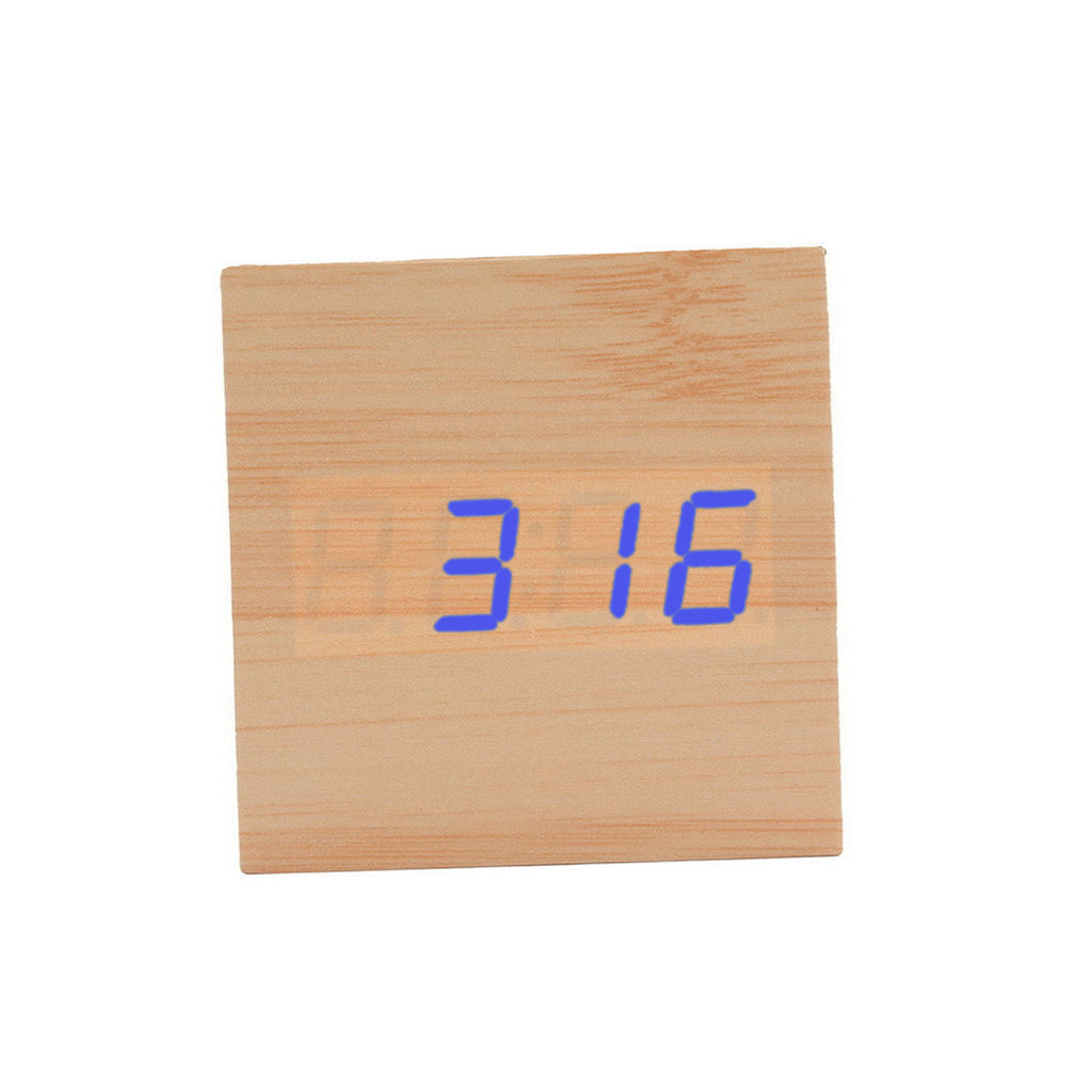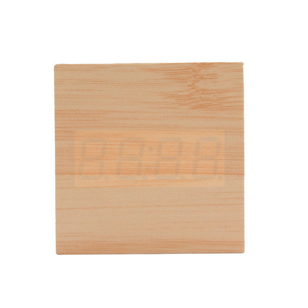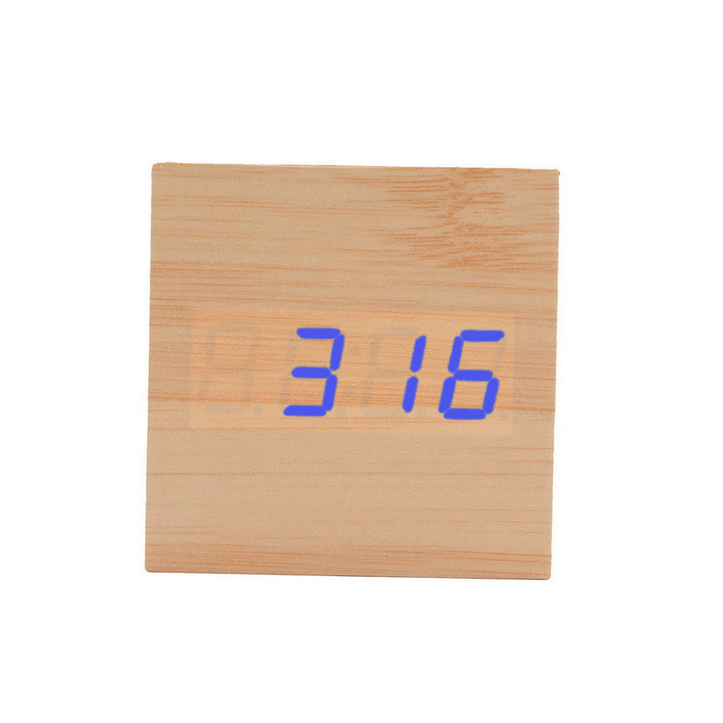 Square Wood Blue LED Alarm Digital Clock Voice Control Thermometer Natural