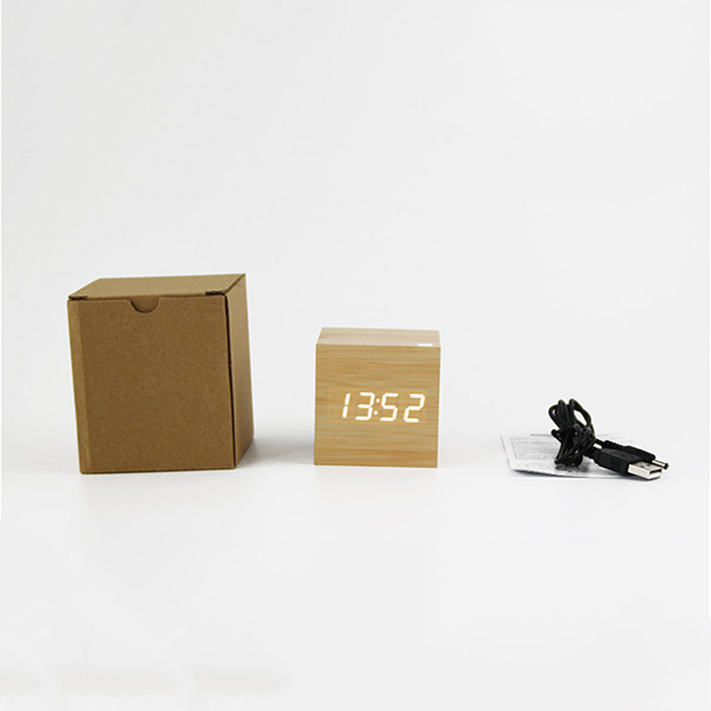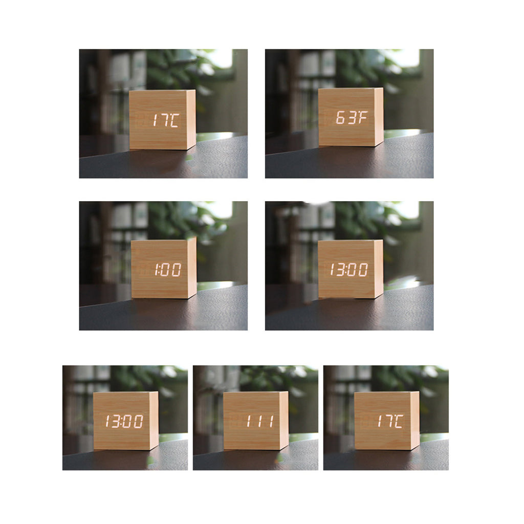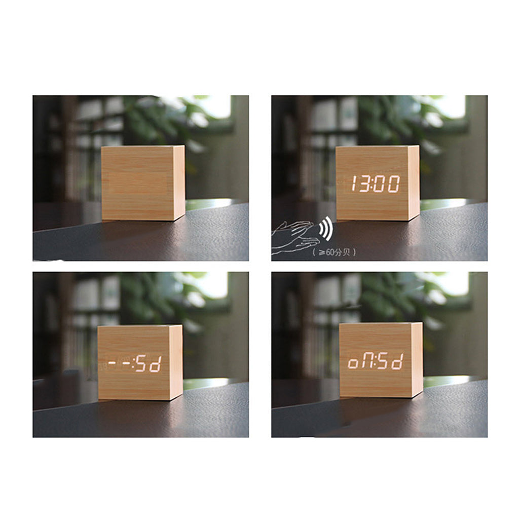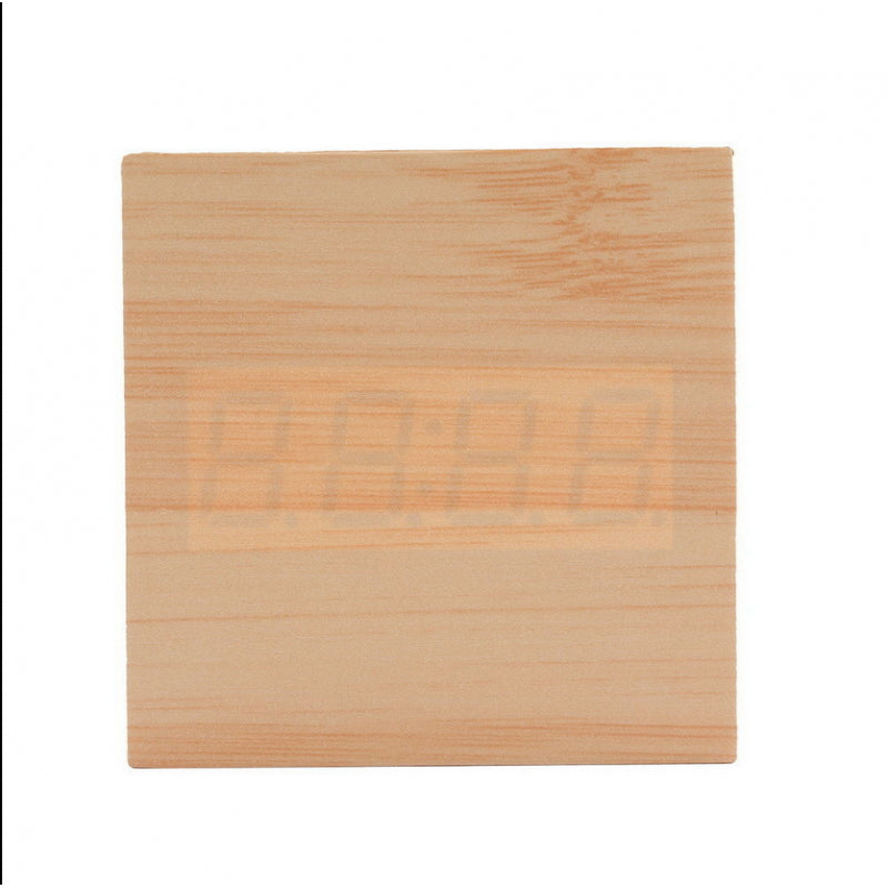 Square Wood Blue LED Alarm Digital Clock Voice Control Thermometer Natural