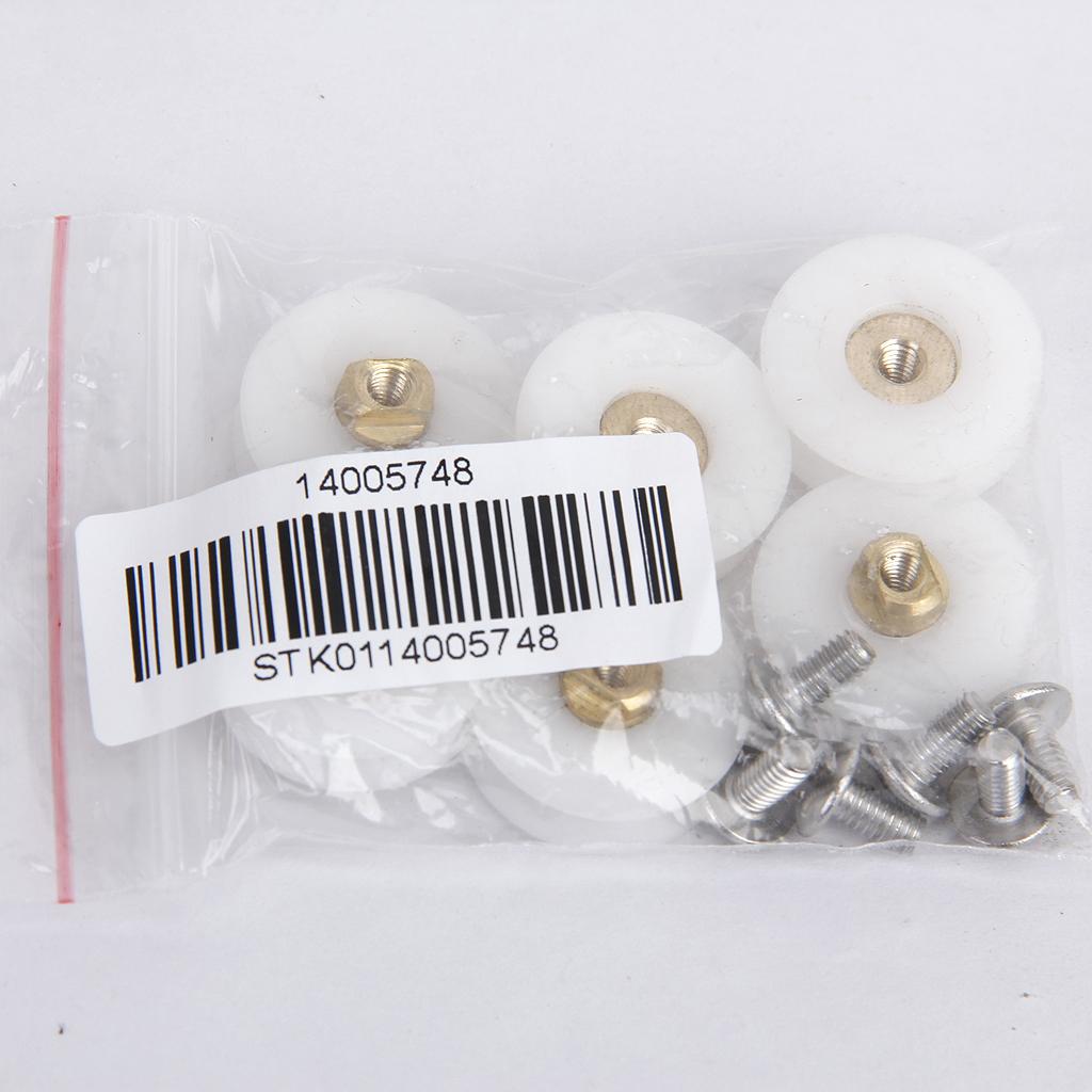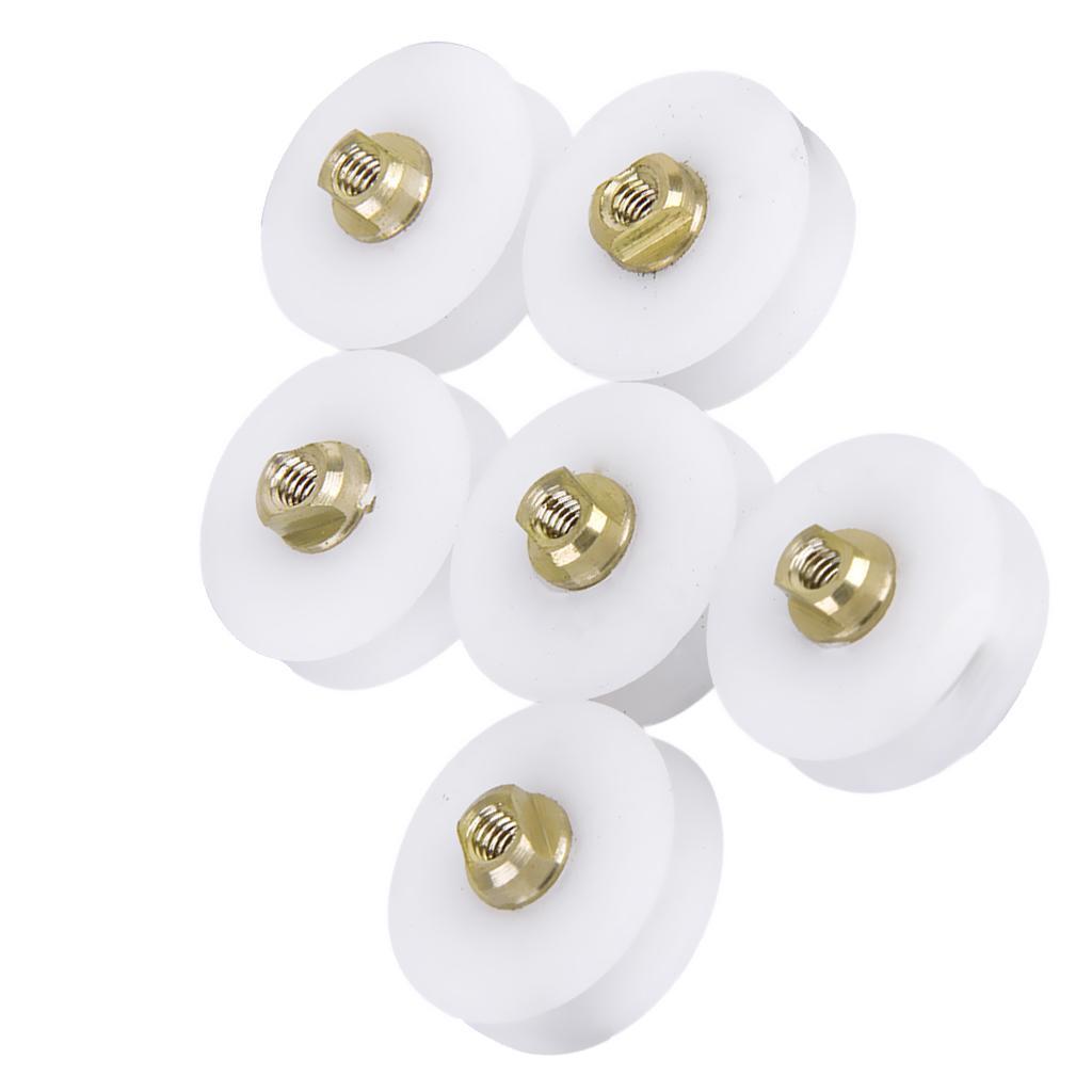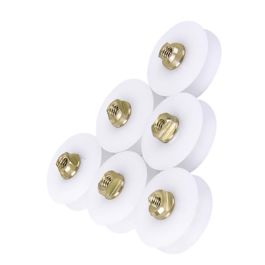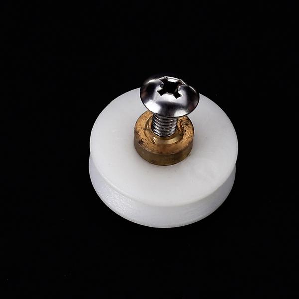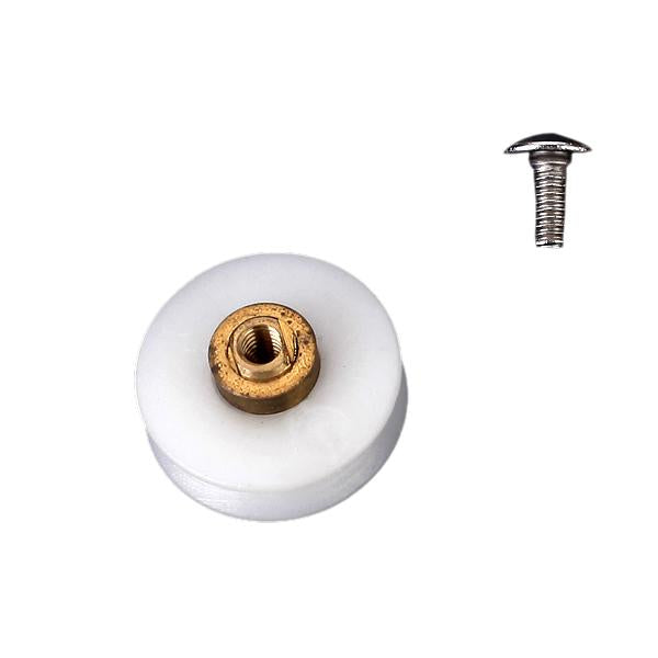 Replacement shower door roller with screw to fasten roller to mount. This shower door roller will provide smooth sliding. White nylon shower door roller with brass core.