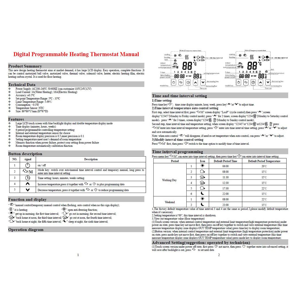 FEATURES - ①Large LCD touch screen with blue backlight display,②double temperature display mode,③Time display (minutes, hours, weeks); ④6 period programmable temperature setting; ⑤Internal and external temperature sensor; ⑥display precision is 0.5,inner precision is 0.1; ⑦Room temperature automatically calibration function